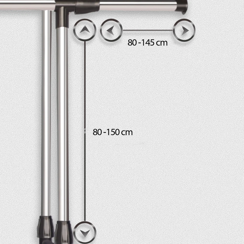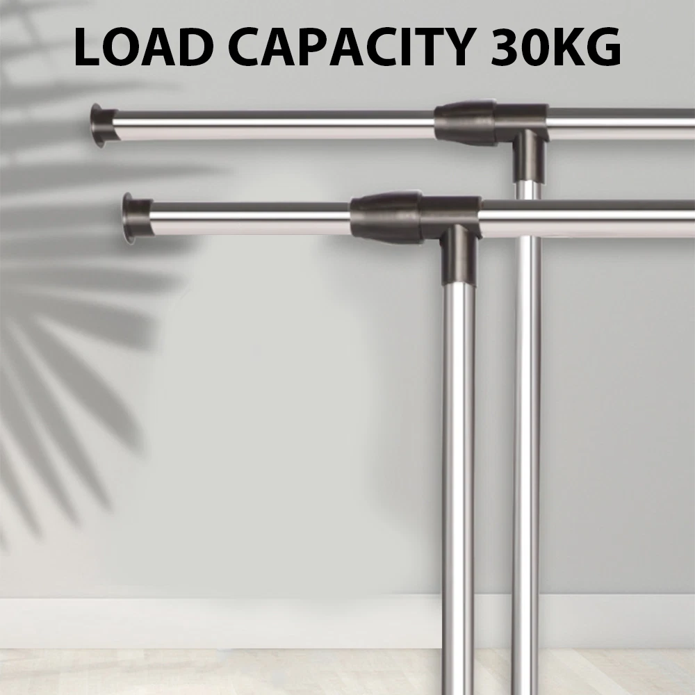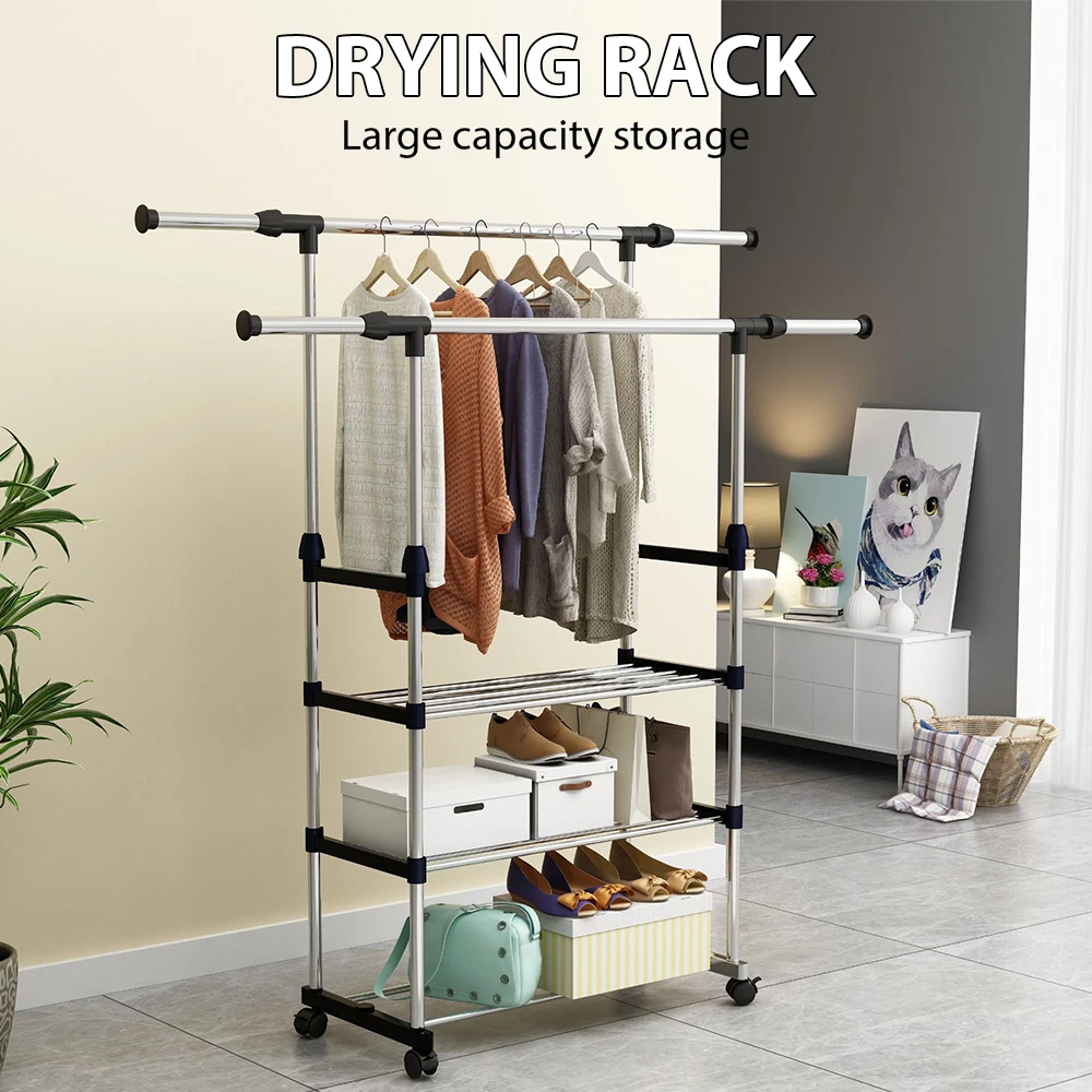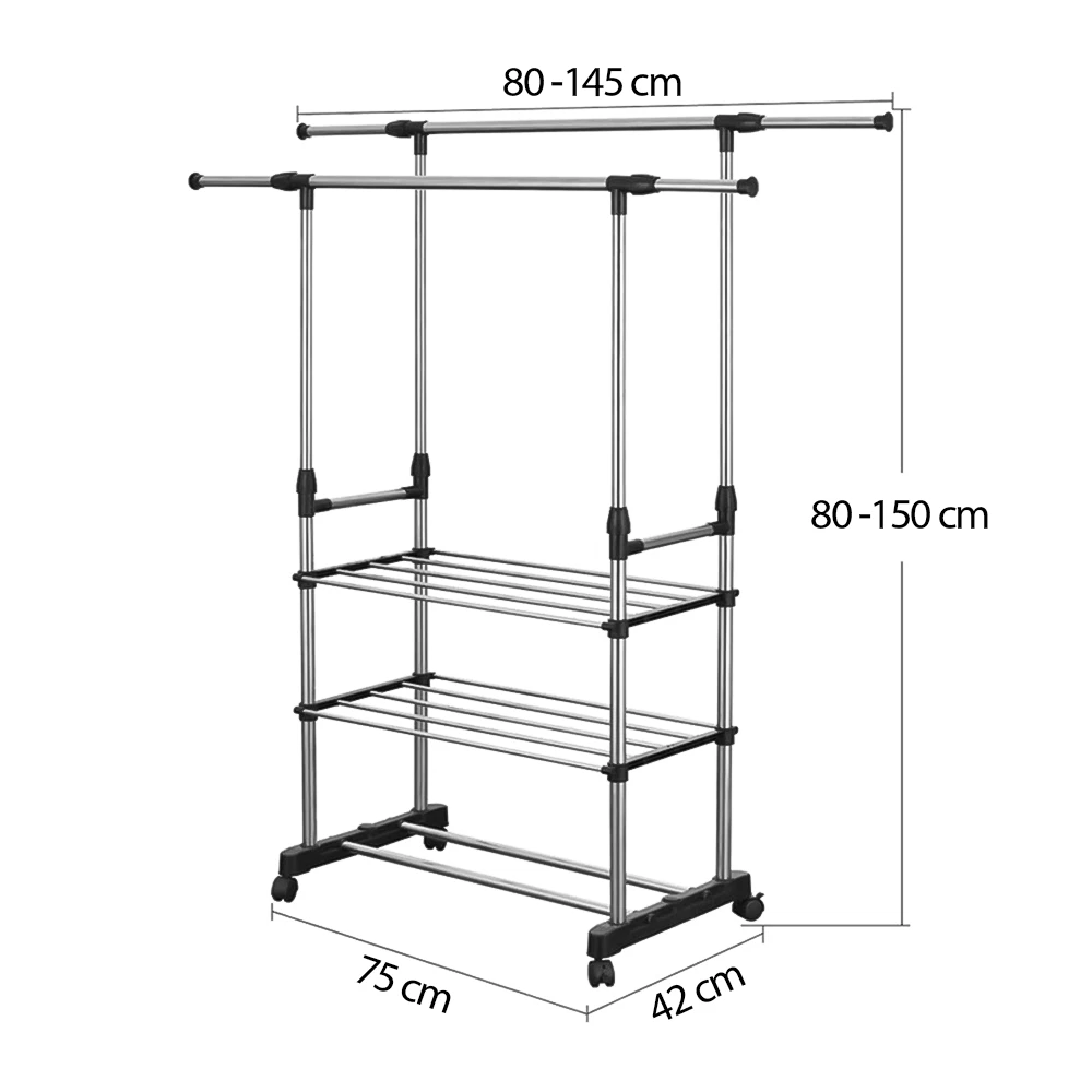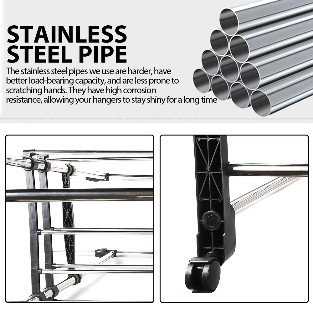 Item description Feature & Details Maximize storage and organization with the clothing garment rack's two hanging rods and bottom shelf. The double hanging rods provide double the capacity, allowing you to store a larger number of garments, while the bottom shelf is perfect for storing shoes, boxes, and accessories. Experience ultimate flexibility with the rolling garment rack's four universal casters, including two lockable ones. Effortlessly gliding the rack across your bedroom for outfit selection or securely parking it in place during ironing sessions. Extra Storage Area: The garment rack on wheels boasts three storage shelf , offering you additional storage options. You can conveniently store items such as suitcases, shoes, hanging umbrellas, and more. This extra bottom shelf not only provides more space but also enhances the stability of the garment rack. Our clothes rack provides the flexibility you need with an extendable hanging rod ranging from 35.5'' to 57.1'' and adjustable height from 35.5'' to 59.1''. You can create a customized storage solution that perfectly fits your needs. With a thickened 1-inch (25.5mm) steel diameter, the heavy duty garment rack provides exceptional strength and stability to support your clothing collection. Rest assured, your garments will be securely held and well-supported on this rack. Specifications: Color:Silver Material:Steel Item Weight:2.8kg/6.17lbs Weight Capacity:330lbs Product size: 59"*5.7"*16.5" Height adjustable: 35.5''-59.1'' Specifications: 1x Garment Rack 1x Manual