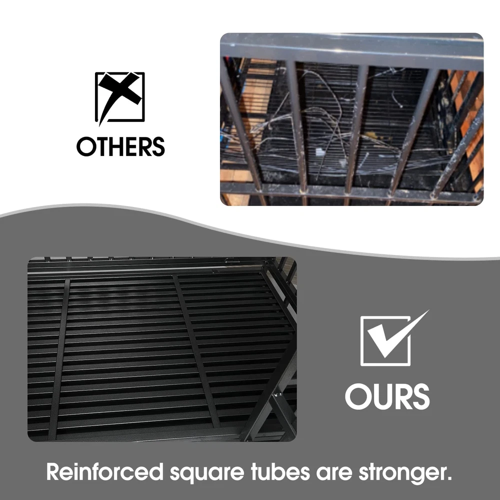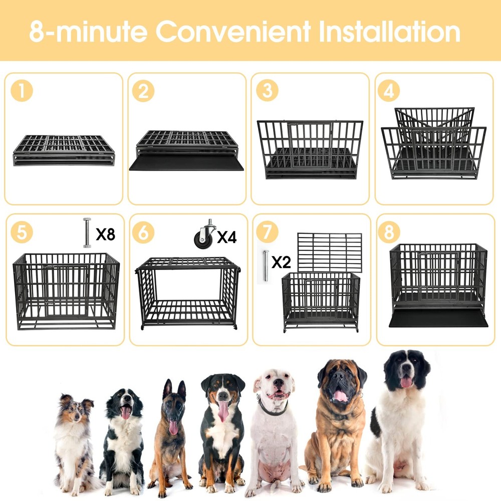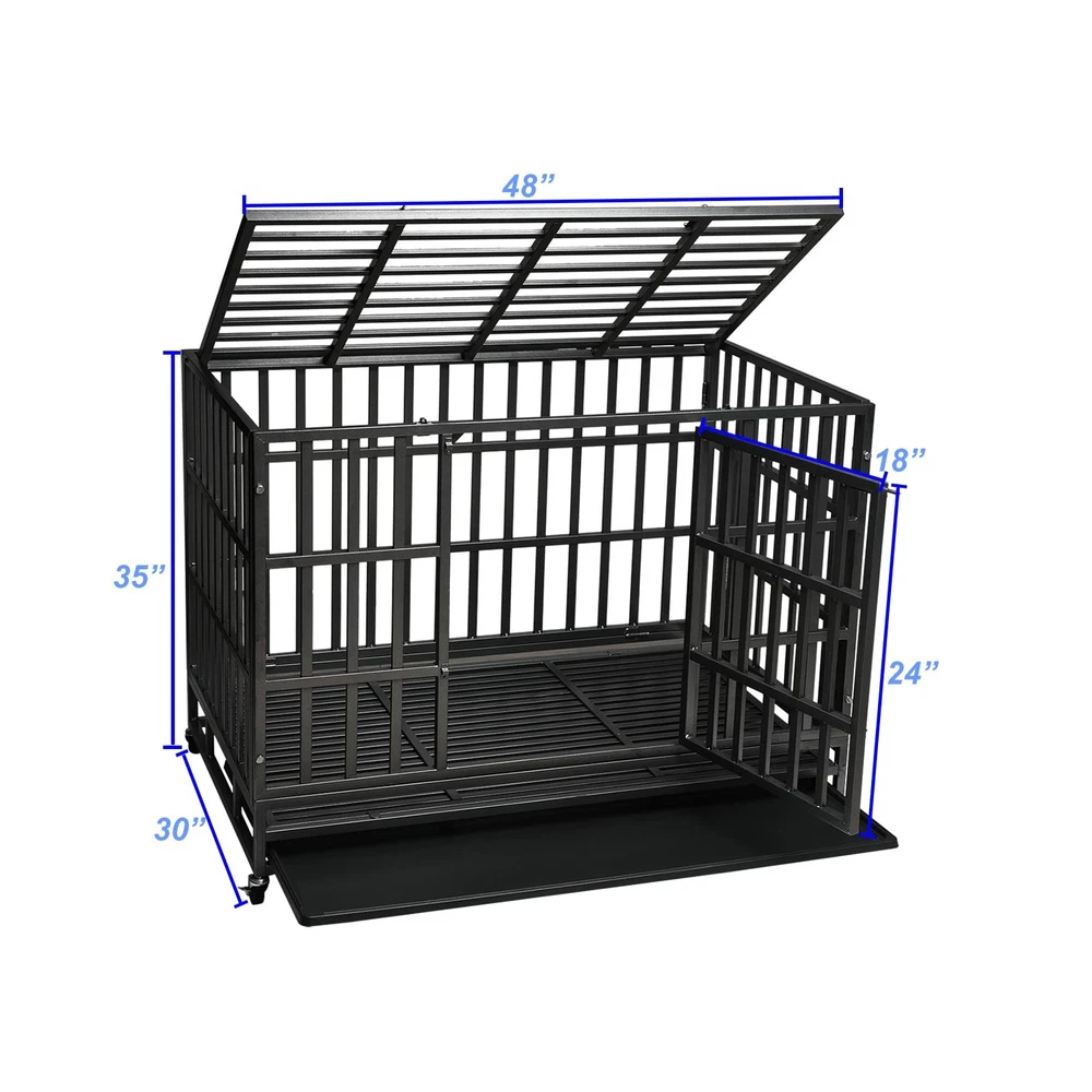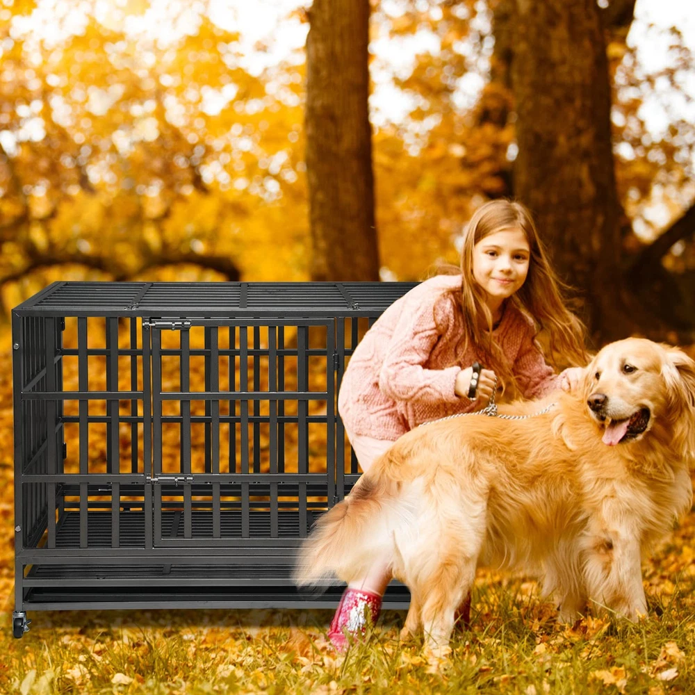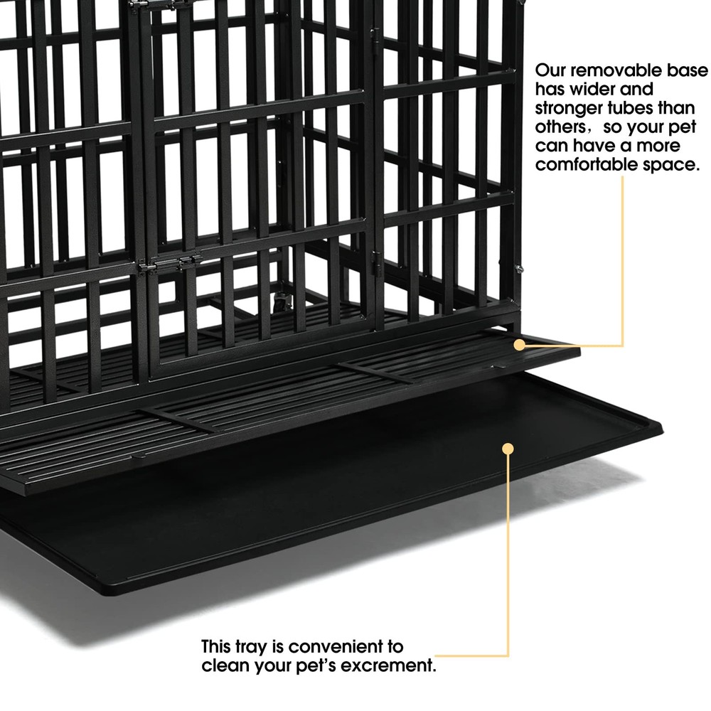 When Should You Use a Dog Crate? If your dog needs a retreat of its own to rest and relax. If your dog tends to destroy your home when you’re away. If your dog has high separation anxiety and needs a place to feel safe. Why Choose this Heavy-Duty Dog Crate? Quality Materials: Made up with upgraded steel, it’s indestructible and durable. Super Mobility: Four 360 degrees rolling casters allow you to easily move the kennel around your home. Super Safe: Features four sturdy locks that make the kennel escape-proof. Easy Assembly: Straightforward instructions and numbered parts help you assemble it within 20 mins. Easy to Clean: A pull-out tray and water-resistant veneered surface make cleaning a breeze. Specifications: Color: Black with Hammer-tone Coating Material: Steel Overall Product Size: 47.5”L x 30.7”W x 36”H (121 x 78 x 92 cm) Interior Product Size: 45.8"L x 28.6"W x 28.5"H (117 x 42 x 50 cm) Product Weight: 85 lb (40 kg) Max. Static Load Capacity of the Crate: 300 lb (118 kg) Package Contents: 1 x Dog Crate 4 x Wheels 1 x Instruction Notes: To keep your fur friend safe, always remove its collar before it enters any crate. To choose the right crate size, please measure the size, including length and height, of your fur friend first, and add 4 inches to both final measurements for moving and being comfortable. Please keep an eye on your children and don’t let them climb into or play in or on the product. PREMIUM QUALITY & SAFE FRAME: Our dog crate, made from reinforced corrosion-resistant steel, is hard to be damaged by medium or large dogs. TOP AND FRONT DOOR DESIGN: Double door design allows easier feeding or interaction to your pets. Two firmly slide-bolt latch locks are helpful to keep your dog safely inside their pet home and to avoid the most aggressive canines from escaping. EASY-CLEAN REMOVABLE PAN: Features a removable tray to make cleaning up easily. It allows for any soiling to drop to the pan to maintain a clean environment for dogs. And the dog kennel can easily slide out for easy and convenient cleaning. LOCKABLE &MOBILITY: The four quality wheels are for easy transfer from inside to outside. Two wheels can be locked to prevent accidental movement and keep your dog crate securely in place. EASY TO INSTALL: The dog kennel versatile design allows for extremely easy set up. It only takes less than 10 minutes because majority of the parts are already preassembled. Overall dimension is 48"L X 30.0"W X 35"H