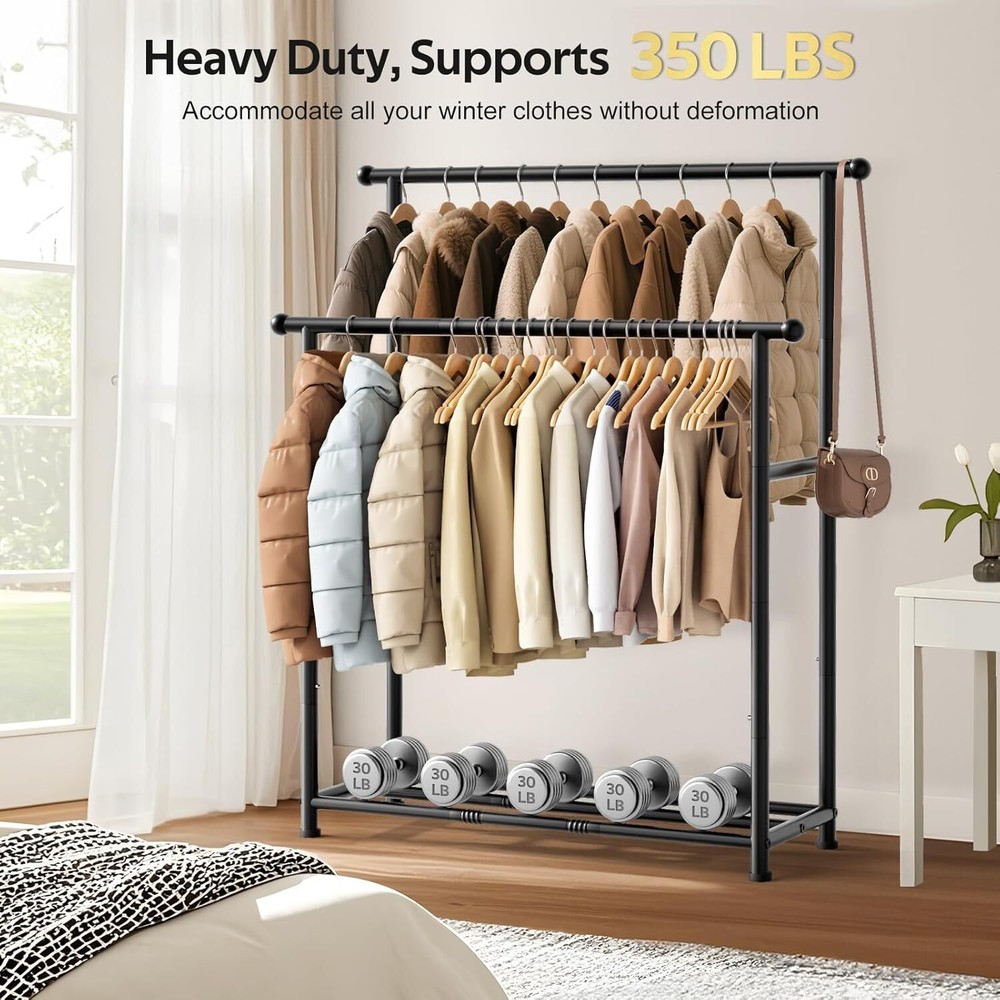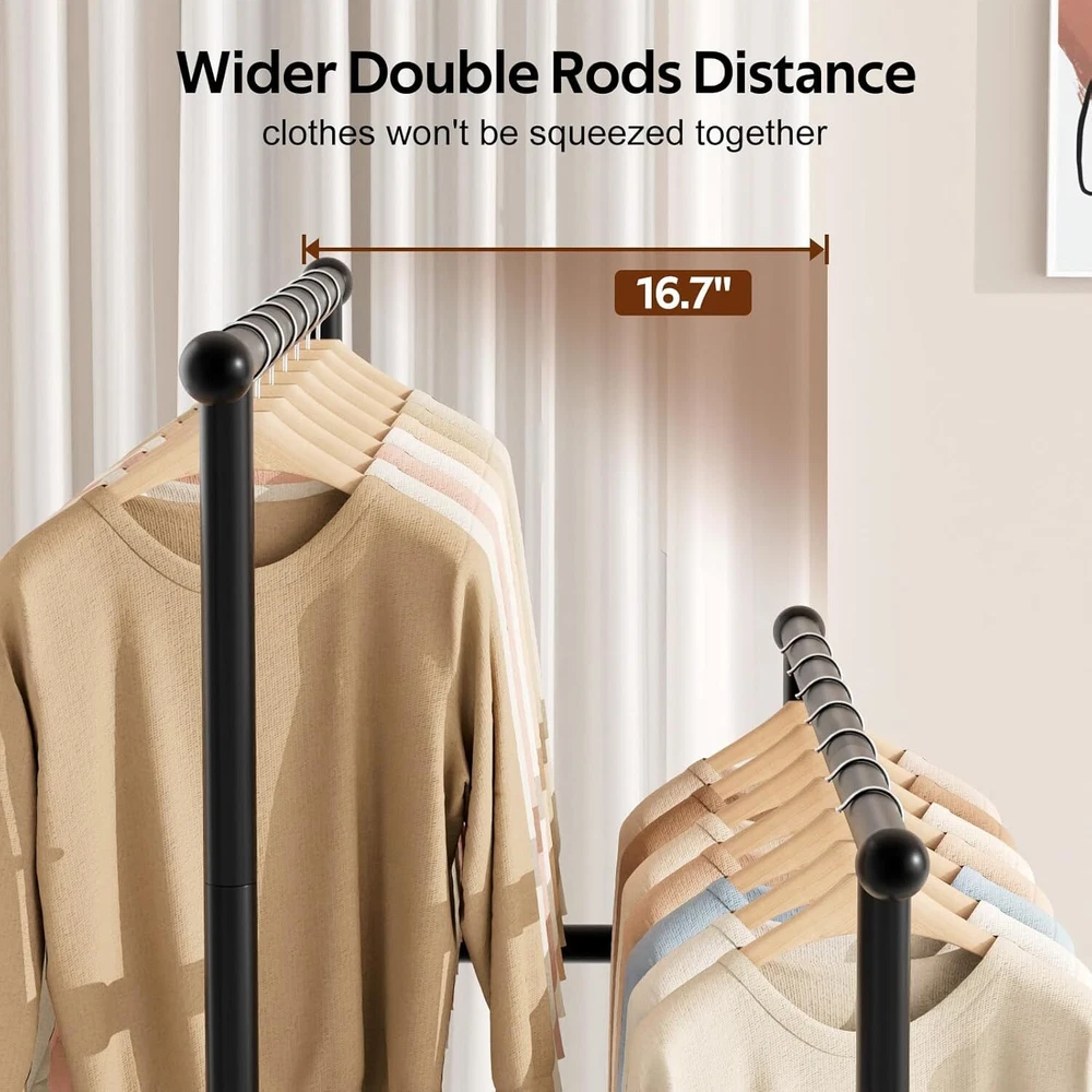 MISSLO Double Rods Garment Rack Heavy Duty Clothing Rack for Hanging Clothes Portable Clothes Organizer for Bedroom, Living Room, Clothing Store (Matte Black) Brand MISSLO Color Matte Black Material Metal Recommended Uses For Product Coats Product Dimensions 16.7"D x 44.2"W x 61.8"H About this item Patent pending Wider Design: 44.2" wide, which is 5" wider than the average clothes racks for hanging clothes. It provides more space for dresses, T-shirts, bags, and shoes while keeping them organized Heavy Duty: Made of thickened, high-quality metal. The closet racks for hanging clothes can hold up to 350 lbs. Easily accommodating heavy winter coats and boots without tipping or warping Stylish Ball: The balls on both sides prevent clothes from falling out while providing extra space for bags.If you're looking for a garment rack for hanging clothes that's both elegant and functional, this is the one for you Bottom Extra Space: The bottom can be used as a shoe rack to hold shoes, or boxes. If you need a closet that doesn't take up a lot of space, or if you have temporary needs for storing clothes, you'll need the heavy duty clothes rack Wider High-low Bars: 16.7" distance, ensuring that the front and back clothes won't be squeezed together. The high-low bar design helps you store and organize clothes of different lengths. The clothing racks for hanging clothes are easy to install as well