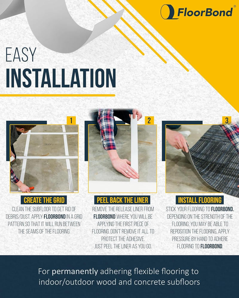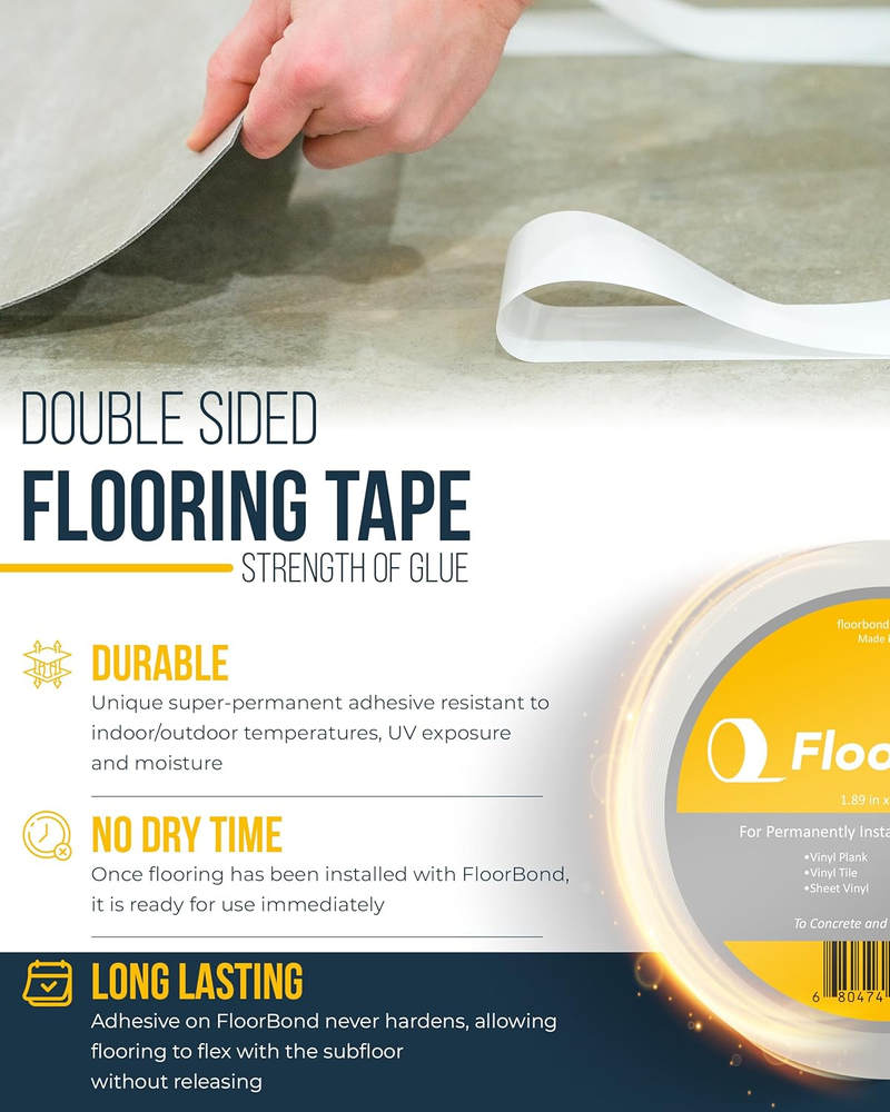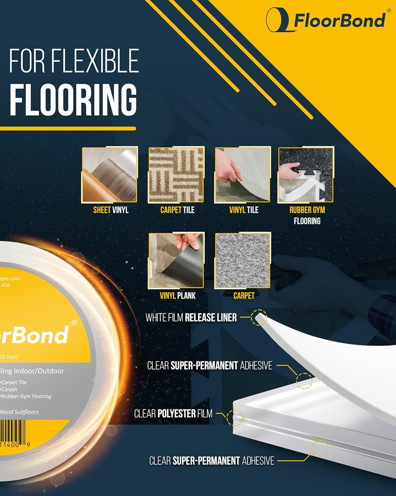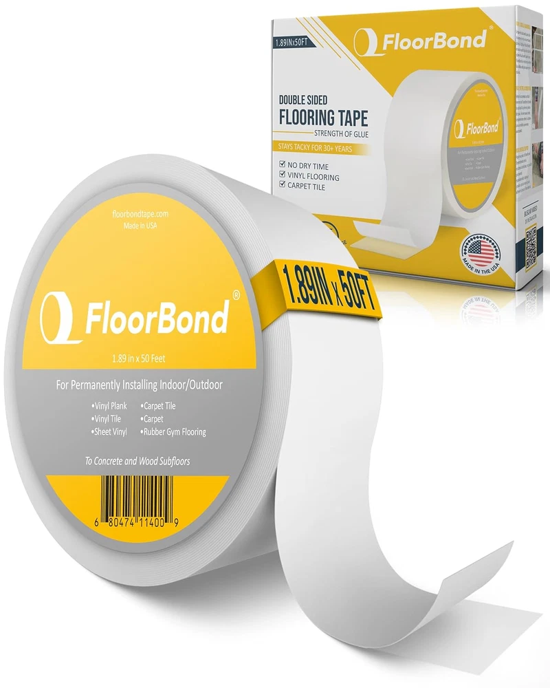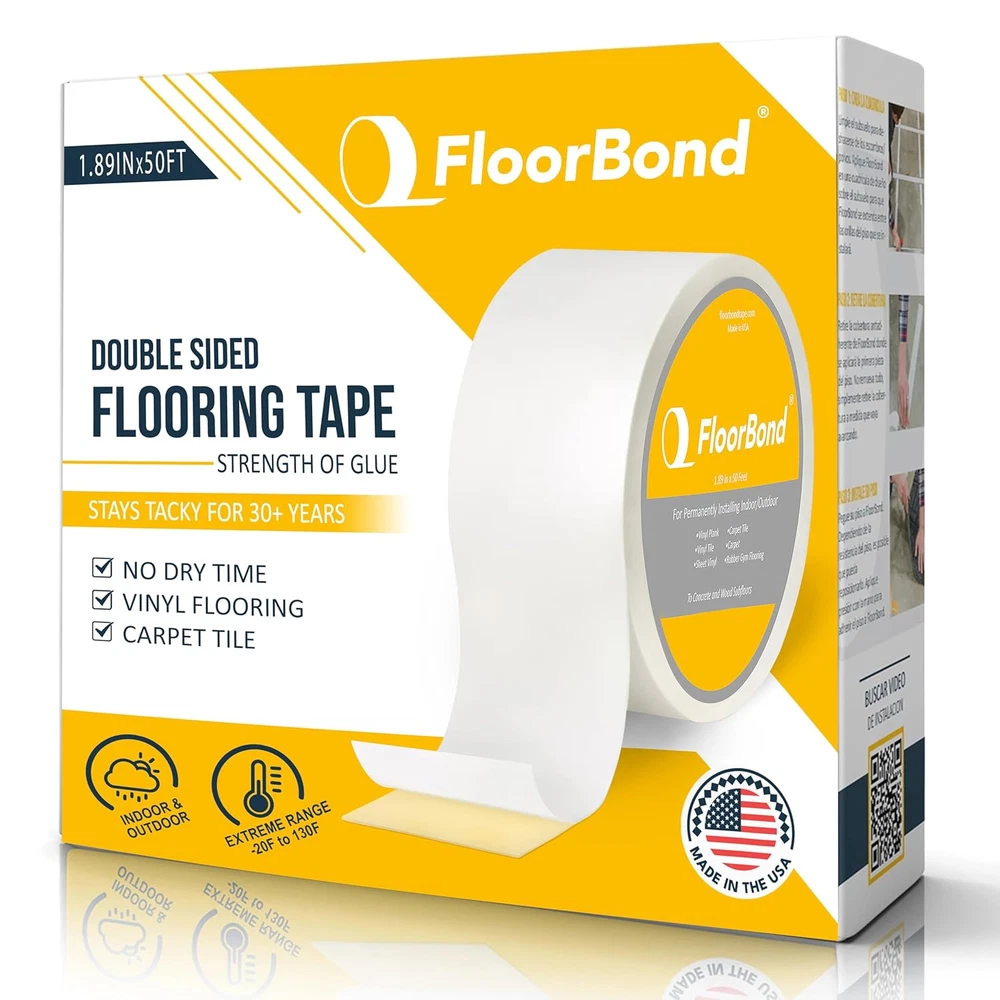 Store New Arrivals Add to Favorite View Feedback Contact Double Sided Tape Heavy Duty Carpet Tape for Flexible and Vinyl Flooring, Carpet Tiles, Artificial Grass, Foam Gym Tiles, Rubber Interlocking Gym Tile Easy Installation Ultra Strong Grip Description Item model number FLO2730 Number of Items 1 Color White Product Dimensions 4.25 x 4.25 x 2 inches; 14.07 ounces Material Acrylic Recommended Uses For Product Indoor, Outdoor Built Stronger Than Glue: FloorBond double sided tape delivers an industrial-strength bond that outperforms standard double-sided tapes. Designed for ultra-strong hold, it secures carpet tiles, vinyl flooring, rubber gym tiles, and artificial grass with long-lasting grip, with no mess, hassle or compromise. DIY-Friendly and Approved by Professionals: Whether you're a DIY enthusiast or a professional installer, FloorBond grip tape makes permanent flooring installation easier than ever. Just peel, press, and stick, with zero curing time or complicated tools. It’s quick to apply and built to stay put. Weatherproof and Waterproof Hold: Engineered to withstand extreme temperatures and moisture, FloorBond glue tape performs well in basements, garages, patios, and even outdoor areas. Unlike other tapes, it won’t fail under rain, humidity, or heat, staying strong all year round. Extra Coverage, Heavy Duty Strength: Each 50-foot roll of FloorBond waterproof tape is 1.89 inches wide, offering wide coverage for large projects without compromising strength. Ideal for bonding flexible flooring securely to wood, concrete, or tile substrates. Permanent Bond Lasts for Decades: With a tackiness that holds for over 30 years, FloorBond peel and stick flooring tape is made for permanent installs (not for rugs or temporary use) Expect strong adhesion that resists shifting, lifting, or peeling, even under heavy foot traffic. Product Description What is FloorBond? FloorBond has an extremely high adhesion to bond permanently to the subfloor and flexible flooring. FloorBond provides a secure and lasting hold for flexible flooring. The adhesive is unique in that it never dries out or cracks. FloorBond is designed to speed up the installation process by eliminating messy glues. FloorBond is heavy duty and resistant to indoor and outdoor temperatures, moisture and UV exposure. 1.89"X50' Roll Size Lasts for 30+ Years! Strong Adhesion Made Simple. FloorBond is a double-sided tape for permanent flooring applications. It holds surfaces with the same strength as glue, providing a strong hold for carpet tile, vinyl flooring, gym mats, and artificial grass. It is simple to apply and does not need any extra equipment or curing time. Just cut, peel, and push it into place. Easy Installation FloorBond allows you to permanently install flexible flooring in a fraction of the time of traditional glues. Best of all? FloorBond is easy to install. Just clean your subfloor, apply in rows, peel back the liner, and press down your flooring. No messy adhesives, no tools, and no dry time. Strength of Glue! Designed For High-Traffic Environments. FloorBond withstands strain in commercial gyms and house basements alike. It can withstand the wear and tear of everyday foot traffic while maintaining its grip over time. Whether you're placing flooring in a bustling business or a home gym, it won't move. Commercial and Residential Designed For High-Traffic Environments. FloorBond withstands strain in commercial gyms and house basements alike. It can withstand the wear and tear of everyday foot traffic while maintaining its grip over time. Whether you're placing flooring in a bustling business or a home gym, it won't move. Waterproof and Temperature Resistant Works In All Seasons. Some adhesives disintegrate when exposed to moisture or temperature variations. FloorBond is designed to operate in both indoor and outdoor environments. It can withstand humidity, rain, cold, and heat, making it ideal for patios, garages, and basements. ABOUT US Welcome to YMF Store! At YMF Store, we are passionate about bringing you high-quality products across multiple categories. Whether you're searching for everyday essentials, the latest trends, or unique must-haves, we've got something for everyone! Our mission is to provide an excellent shopping experience with great deals, fast shipping, and top-notch customer service. We carefully curate our inventory to ensure that you find exactly what you need, all in one place. Follow us for exclusive offers and new arrivals! Thank you for shopping with YMF Store – your trusted online marketplace for quality and convenience. SHIPPING We are always working hard to ensure your package arrives as soon as possible. Please understand that some factors like weather, high postal traffic, and the performance of shipping companies are outside of our control. Enjoy free shipping within the lower 48 states! Orders are shipped within 1 business day of payment, often even sooner. We gladly ship to both physical addresses and P.O. Boxes for your convenience. RETURNS We offer a 30-Day Return Policy on items which you are not completely satisfied with. You have the option for a full-refund or an exchange of the item. No returns are available on items shipped outside of the USA. PAYMENT We accept PayPal. CONTACT US This page content is yet to come Please ad us to your favorite seller and visit again later Thank You CUSTOMER SATISFACTION We try our very best to make sure every customer is completely satisfied. If there's a problem, message us! We're happy to help.
