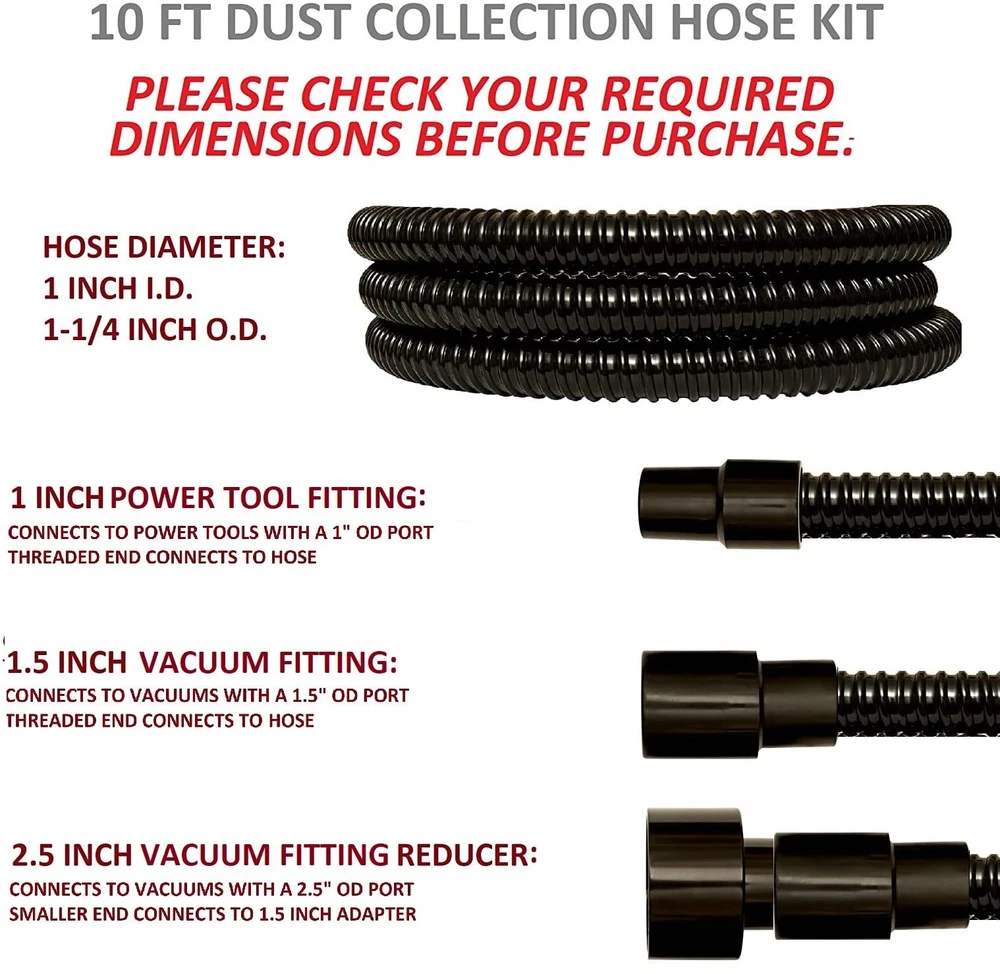 Please check your size needs prior to purchasing. Our premium quality, American Made PVC vacuum hose is the perfect answer for your dust collection needs. With multiple adapters, our dust collection kit will work with most vacuums and power towels alike to get rid of dust, sawdust, and debris quickly and efficiently. Flexible and lightweight yet durable and rigid, the corrugated PVC hose is perfect for every day use. Includes: 10 FT Premium Quality PVC Hose (1 Inch Diameter) 2.5 Inch Reducer 1.5 Inch Fitting1 Inch Port Fitting. 10 Ft Extension for your vac and dust collecting power tools. Works with most vacs, random orbital sanders, palm sanders, busicuit joiners and jigs, dust extractors, table saws, compact routers, small vaccums and other workshop power tools. Please check your sizes prior to purchase. Kit is for use with power tools that have 1" OD Dust Extraction Ports. For use with vacuums that have 1-1/2" ID or 2-1/2" OD ports .Made in USA: Durable and rigid, yet lightweight and flexible kink-proof phthalate free PVC that is easy to cut to any desired length. Premium Quality PVC with an excellently tight bend radius that ensures maximum durability. Please confirm the ID and OD of your vaccum and power tool outlets to ensure the correct fit prior to placing your order. Kit includes: Premium grade PVC 10 FT Hose (1 Inch ID, 1.25 Inch OD)