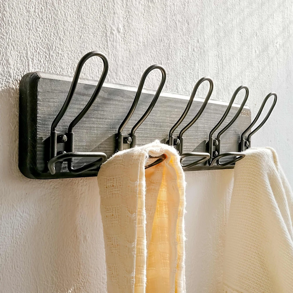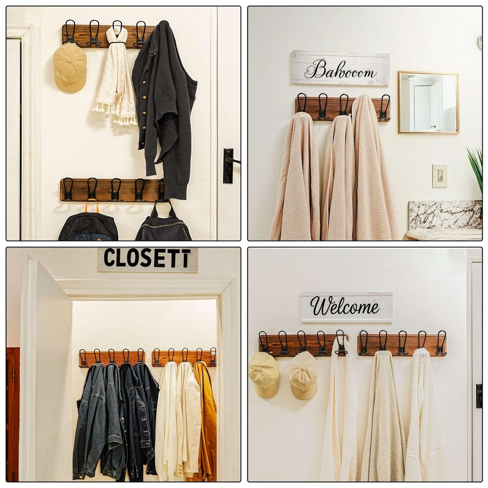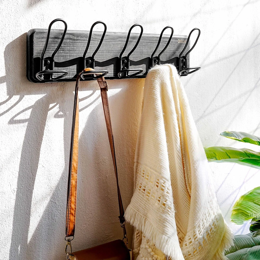 RusticWire Series Wall Mounted Coat Rack with 5 Coat Hooks Material: Solid pine wood backing & metal hooks Dimension: Mounting hole to hole: 16 Inches L*W*T=xxxxxxxxxx Inches; Package Includes: 1* 5-hook Wall Mounted Coat Hook Mounting Hardwares for both drywall and stud or concrete Application Scope: coat hanger wall mount is perfect for hanging your clothes, clothing, jackets, coats, hats, baseball caps, key, scarf, backpack and others. The well-organizing coat and hat rack is a must to your entryway,mudroom, closet, bedroom, kitchen, hallway and more. 【HEAVY DUTY:】Exclusive-molded, patented metal wire hooks and a sturdy pinewood back ensure our wall coat rack's unmatched durability. 【RUSTIC CHARM:】The coat wall hanger, with wire hooks and unique finish, adds a charming country style. 【NO ASSEMBLY NEED:】Easy to install, 16” spacing stud-mountable and improved hardware for increased loading. 【Handpicked Wood Grain:】Each wood hook rack rail is crafted from individually selected wood for optimal beauty. Size: 17-1/4 x 4-7/8 x 3 inches; Material: pinewood & metal; Package: 1x wall mount coat rack with 5 wire hooks; Color: black.