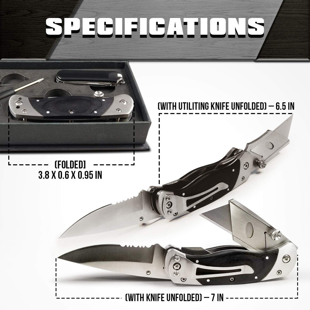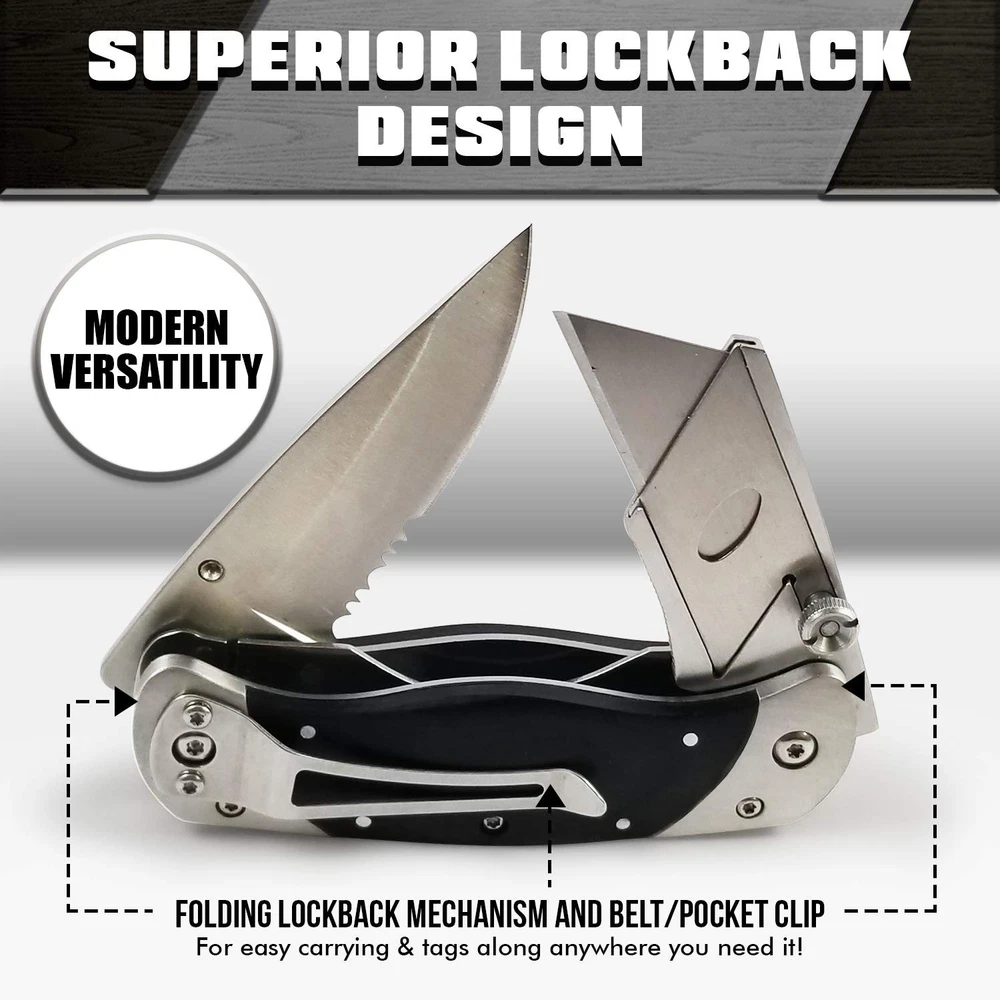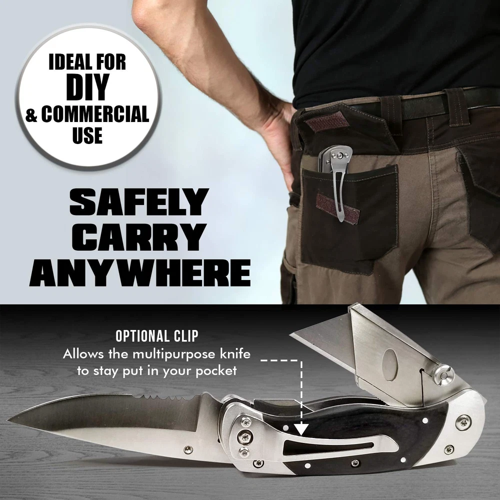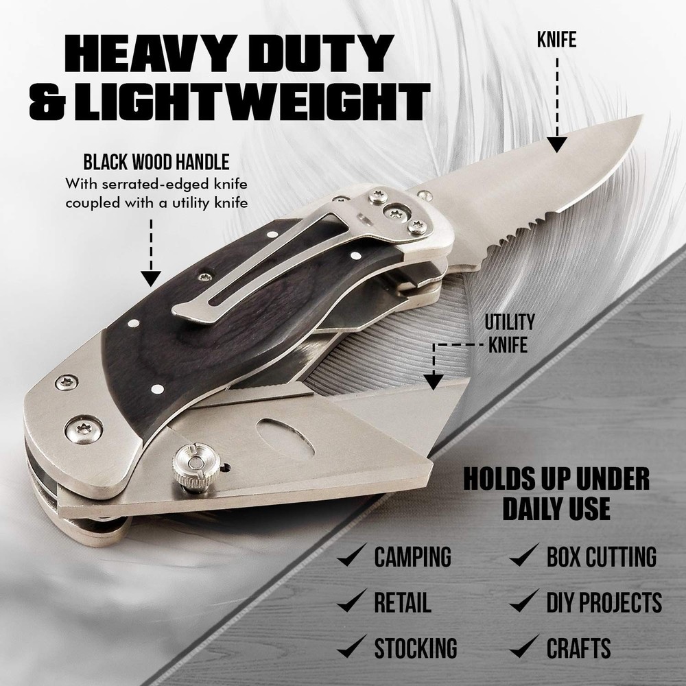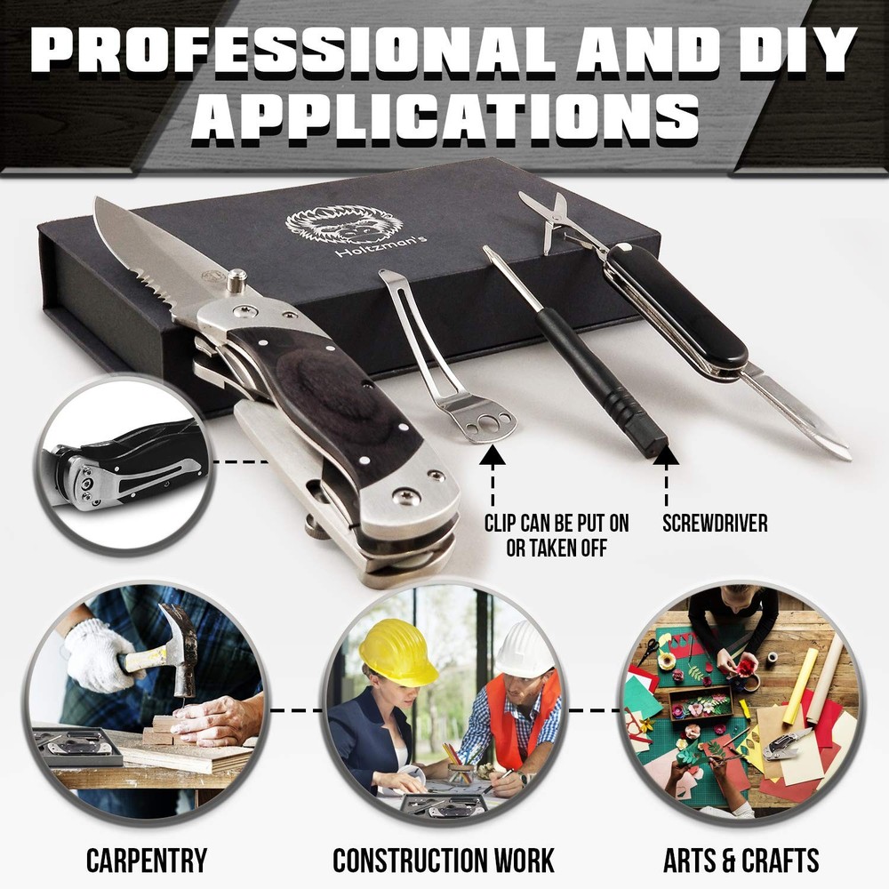The Only Utility Knife You'll Ever Need Are you finally ready for a box cutter that folds up for easy, compact carrying? Do you want a blade that stays sharper for longer to get the job done right? Enjoy a multi-function utility knife from Holtzman's that lets you slice, score, mark, strip wire and unscrew for whatever the task might be! Superior Lockback Design This isn't your dad's box cutter... Holtzman's brings modern versatility to this classic staple of toolboxes everywhere. Designed with a folding lockback mechanism and belt/pocket clip for easy carrying, this knife tags along anywhere you need it! Ultimate Versatility Made for multi-function versatility with a wire stripper and two attached aluminum alloy screwdriver bits. Professional and DIY Applications: Contractors Construction work Carpentry Retail Warehouse & Stocking Arts & Crafts Cutting drywall & vinyl flooring Slicing insulation Cutting through caulk Scraping grout Rescuing painted screws Much more! Tool Specifications Size (Unfolded) - 16.5 x 4 x 2.5 cm Size (Folded) - 10.3 x 3.5 x 2.5 cm Head Material: Zinc alloy Handle Material: Aluminum alloy Screwdriver Bits: 1 pc Philips, 1 pc Slot driver Bits Material: Aluminum alloy Blade Material: #60 Carbon Steel For professional results on the job or at home... Click ADD TO CART and order TODAY! ✅ SAFELY CARRY ANYWHERE - Handle the task quickly & conveniently with Holtzman's Utility Knife Cutter MultiPurpose tool with dual blade design! Folding design allows for safe & compact pocket storage. The enclosed optional clip attachment also allows the multipurpose knife to stay put in your pocket or wherever you choose to secure it. Ideal for DIY & commercial use. ✅ MULTI-FUNCTION TOOL - Experience 2-in-1 functionality in the palm of your hand! This knife includes a knife on one end of the handle, and the opposing side features a pop out utility knife. The box also includes a clip and screws to allow the option for the knife to be clipped onto the carrier. ✅ HEAVY DUTY & LIGHTWEIGHT - Featuring a black wood handle with a serrated-edged knife coupled with a utility knife. Holds up under daily use for camping, retail, stocking, box cutting, DIY projects & crafts. ✅ MAKES THE PERFECT GIFT – Our premium quality utility knife in out luxurious gift box makes the perfect gift for him or yourself! ✅ LIFETIME WARRANTY - We can't wait to add you to our long list of customers loving the easy access of their folding utility knife. Buy risk-free - you're covered by our Lifetime Money Back Guarantee!