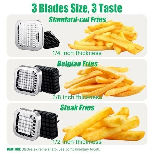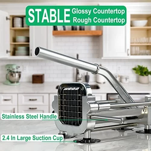 Effortless French Fry Cutter - Your Kitchen Essential! Transform your cooking experience with our top-of-the-line French fry cutter, designed for efficiency and ease of use. Here are the key features that make it a must-have: Stable on Any Countertop Equipped with 4 strong suction cups and solid stainless steel handles. Effectively adheres to both smooth and rough wooden countertops. The stabilizing handle ensures a secure grip while cutting, preventing slips. Super Sharp Blades Crafted from SUS304 stainless steel for exceptional durability. Exquisitely sharp blades make cutting potatoes, beets, sweet potatoes, and onions effortless. Large Cutting Space Generous 5.5-inch x 3.7-inch cutting area allows for whole potatoes without pre-cutting. Ideal for both home cooks and commercial use, enabling you to create Michelin star flavors effortlessly. Easy to Clean and Store Simple rinsing makes cleanup a breeze; the stainless steel material is rust-resistant. Compact design fits neatly in cabinets without taking up valuable space. Please use the provided brush for safe cleaning of the sharp blade. Easy Installation Designed for quick assembly with minimal screws—only two screws needed to replace the blade. Installation takes just one minute, making it user-friendly for everyone. Caution: Always avoid touching the blade sides with your hands due to sharpness. Upgrade your kitchen tools today and enjoy delicious homemade fries with ease!