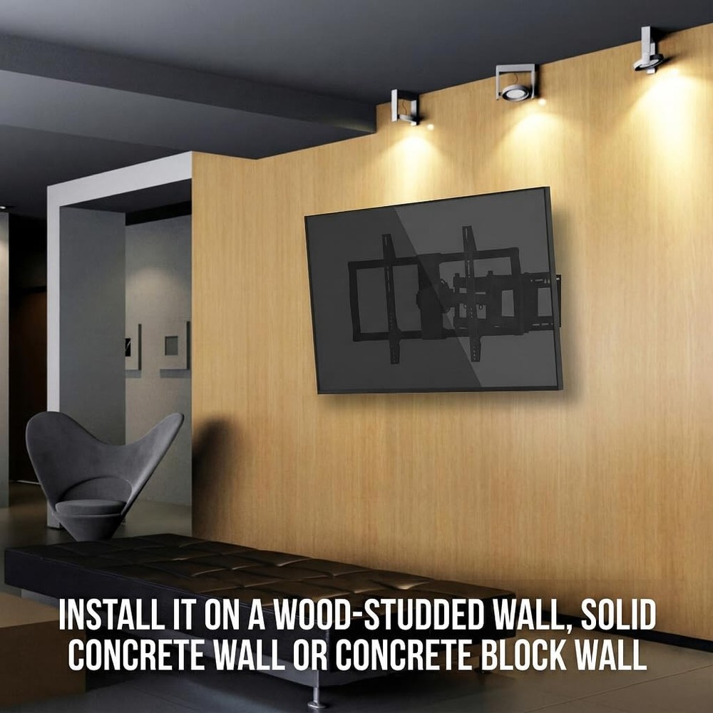 Full motion wall mount: Seamless full motion adjustments allows you to get the ideal viewing angle for you TV - tilts 15 degrees, swivels 45 degrees, extends up to 24.5 inches, and retracts to 2.75 inchesFITS MOST TVS: Supports flat and curved 60” – 100” TVs up to 176 pounds compatible with a variety of VESA mounting hole patterns (check out the photos for the full list of VESA compatibility) INSTALL ON WOOD STUDDED OR CONCRETE WALLS: Includes hardware for installation on either a wood studded wall or a solid concrete wall or concrete block wallCABLE MANAGEMENT SYSTEM: Included cable clips allow you to route unsightly cables through the mount to keep a clean and organized TV and entertainment area Full motion articulating TV wall mount: Easily tilt up to 15°, swivel 45°, extend up to 24.5 inches, and retract to 2.75 inches to get the ideal viewing angle for your 60–100 inch TV. Fits most TVs: Heavy duty TV mount supports flat and curved 60” to 100” TVs up to 176 pounds compatible with a variety of VESA mounting hole patterns. Supported VESA Patterns include 200x200mm, 300x300mm, 400x200mm, 400x400mm, 600x400mm, 600x600mm, 800x400mm, 800x600mm, and 900x600mm. Install on wood studded or concrete walls: Large TV mount full motion Includes hardware for installation on either a wood studded wall or a solid concrete wall or concrete block wall. Built as a TV wall mount 75+ inch TV, this large TV wall mount offers durability and strength, ensuring your investment is well-supported for years to come. Can be installed by homeowners or professional installers. Cable management system: Heavy duty wall mount TV bracket includes cable clips allow you to route unsightly cables through the mount, perfect for those who like to keep a clean, decluttered and organized TV and entertainment area, as well as those who want flexible viewing angles, maximum safety, and a professional-looking setup. Perfect for movie nights, gaming sessions, or enhancing your home theater experience. It's ideal for homeowners, office spaces, and entertainment enthusiasts looking for a secure and adjustable mount placed in living rooms, offices, or conference rooms,