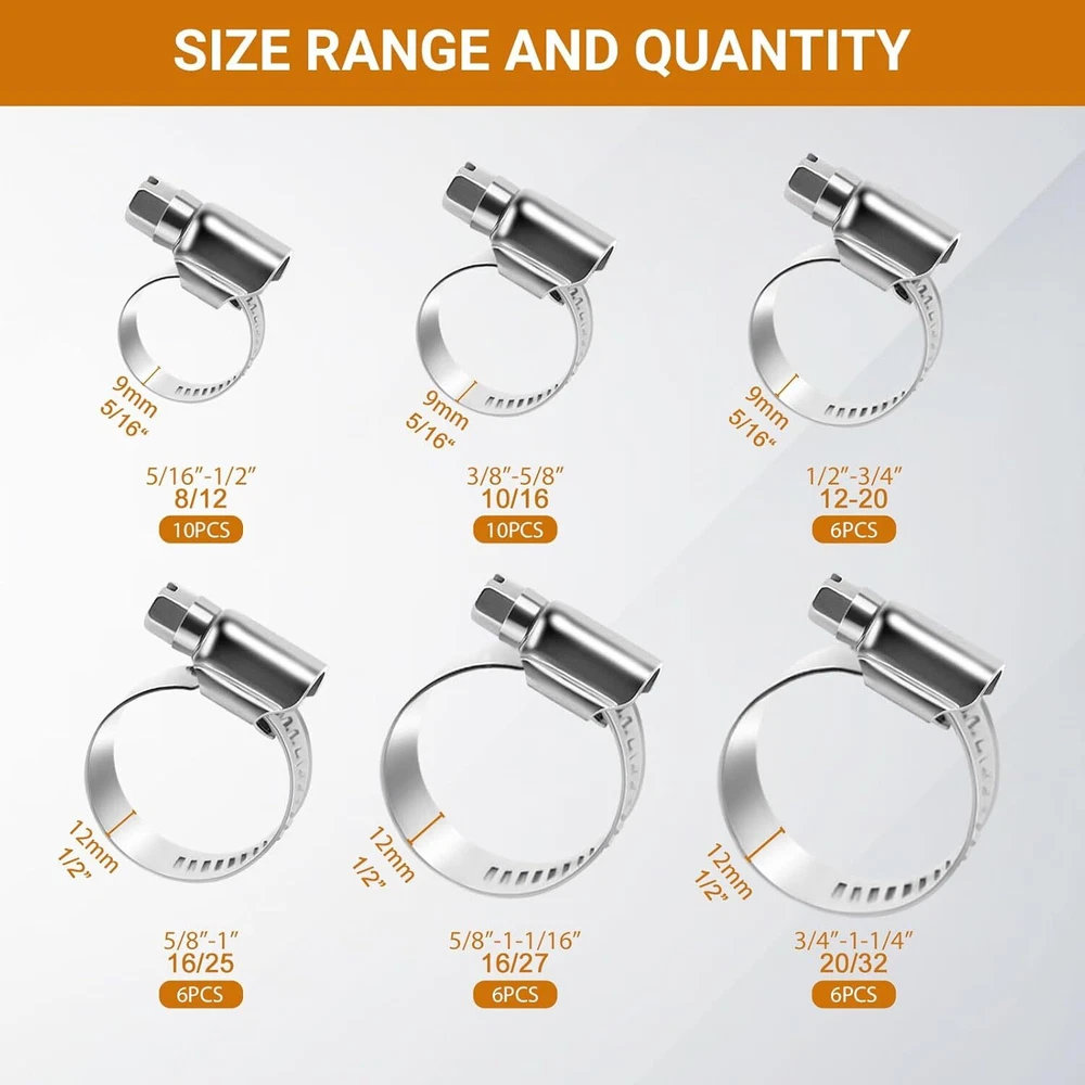 Heavy Duty Hose Clamp Kit - 44PCS,1/4''- 44 Pcs Kit, Silver Product Details Manufacturer: SMLCON Part Number: DSHG Item Weight: 1.37 pounds Product Dimensions: 7.6 x 5.3 x 1.45 inches Item model number: DSHGFT Size: 44 Pcs Hose Clamp Kit Color: Silver Style: Modern Material: Stainless Steel Included Components: hose clamps Batteries Required?: No Material: Stainless Steel Brand: SMLCON Item dimensions L x W x H: 7.6 x 5.3 x 1.45 inches Color: Silver Style: Modern Manufacturer: SMLCON 1. Upgraded Design - Compared to traditional perforated bands, our stainless steel band features a hole-free design, thick and wide, which is hardly affected by over-tightening, deformation, and peeling. This is due to its thicker metal and embossed strap, which can protect the hose from shearing or crushing. Our hose clamp screw is big with deep thread. and the welded worm gear housing can increase the breaking torque by 65%. These hose clamps are high-pressure, providing excellent clamping force and secure sealing. 2. Adjustable Size - The slotted screw is equipped with a hex head. It can be quickly tightened using a screwdriver or a nut driver.The non-perforated hose clamp is flexible and extensible, with adjustable width, and the size range is from 1/4''- 1-1/8''. 3. High Quality Material - Our tubing clamps are made of high quality 304 stainless steel, including the housing, screws, and band. They are compatible with SAE J 1508 standards and ideal for 3/4 silicone heater hose, garden sprinkler, and more. The neutral salt spray(NSS) test is 120 hours, and our SS 304 screws are plated for smooth tightening, enhancing corrosion protection level and meeting the marine grade hose clamps requirement. 4. Hose Protection - Our worm gear hose clamps are designed with a rolled band edge to prevent damage to soft silicone, PVC, or rubber hoses. The non-perforated band prevents extrusion through the band notches, ensuring reliable performance for garden water line tubing, heater pipes, and automotive repairs. 5. Versatile Use - Our clamps are perfect for securing hoses, pipes, cables, tubes, fuel lines, and more. They can be used in automotive, industrial, boat/marine, shield, household, and outdoor settings. Introducing the SMLCON Premium 304 Stainless Steel Hose Clamp Assortment Kit - the ultimate solution for enhancing your tool collection. Crafted from heavy-duty 304 stainless steel band, housing, and screw, our hose clamps offer unparalleled quality and exceptional resistance to corrosion. Featuring a flexible and ductile design, our fuel line hose clamps boast a wide adjustable size range. The worm gear mechanism enables precise adjustment of the clamp’s diameter, ensuring a tight and secure seal. Designed specifically for use in confined spaces, our hose clamps are the ideal choice for preventing flow leakage. With their easy-to-use tightening and loosening mechanism, installation becomes a breeze. Whether for industrial, automotive, electronic, or home applications, SMLCON hose clamps is a secure fitting for hoses, pipes, cables, tubes, fuel lines, and more - even in water salt environments. Package includes: 8-12mm (or 5/16 - 1/2 inch) ---10pcs 10-16mm (or 3/8 - 5/8 inch) ---10pcs 12-20mm (or 1/2 - 3/4 inch) ---6pcs 16-25mm (or 5/8 - 1 inch)---6pcs 16-27mm (or 5/8 - 1-1/16inch) ---6pcs 20-32mm (or 3/4 - 1-1/4 inch) ---6pcs