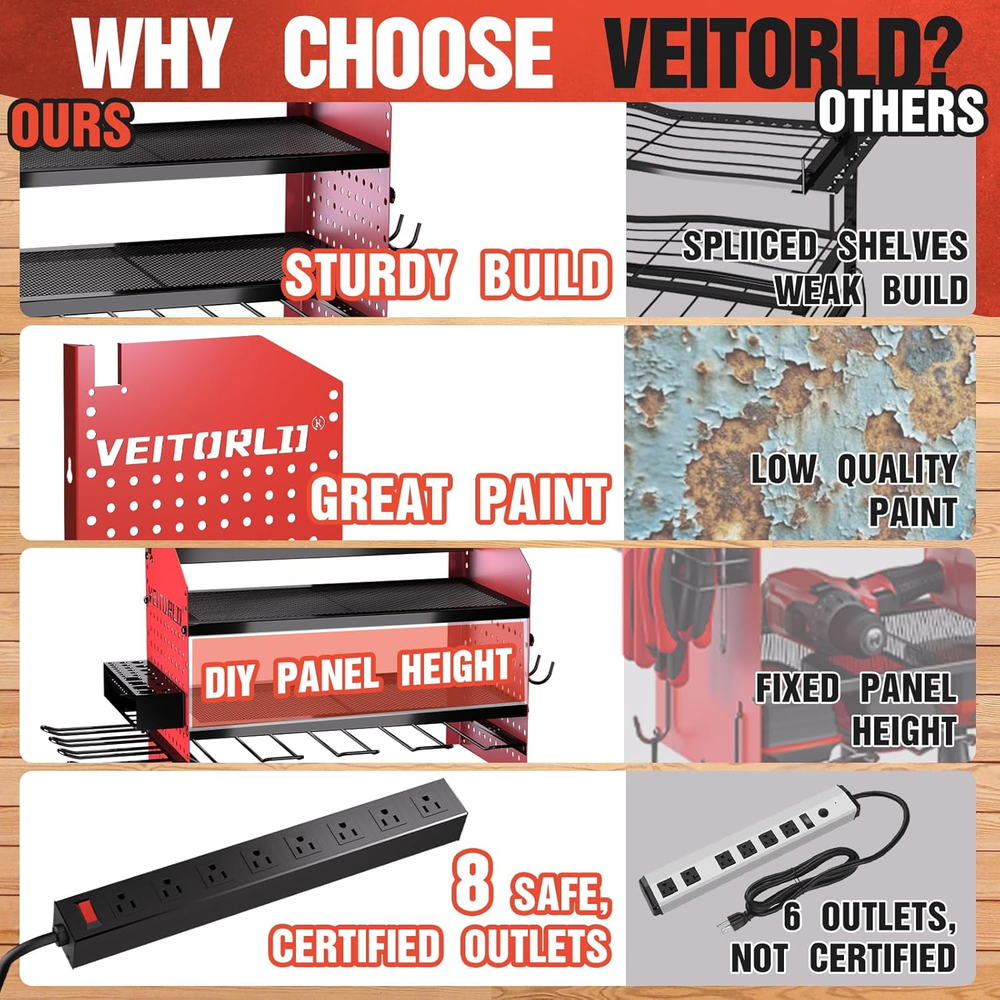 Store New Arrivals Add to Favorite View Feedback Contact Fast deliveries to the customer's home Quality customer service John Make the customers happy! Power Tool Organizer with Charging Station, 4 Drill Holders - Heavy Duty Modular Wall Mount Rack for Garage, Tool Storage Organizer - Gifts for Him Men Dad Husband Anniversary Fathers Day Description Efficient Charging Station: Keep your tools ready to go with our integrated power tool organizer wall mount, featuring 8 AC outlets with overload protection. Charge multiple devices simultaneously, boosting your work efficiency Fathers Day Gifts from Wife Daughter Son: an ideal choice among Fathers Day gifts for dads, him, men, husbands, brothers, sons, or any man in your life, maximize their garage storage with our power tool organizer blending practicality and style seamlessly Perfect Helper in Garage: Ideal for garages, workshops, homes, sheds, backyard shops and more, our garage wall organizer maximizes wall space and saves you time searching for tools. Comes in elegant packaging, making it a thoughtful gift for any man Garage Storage & Organization: Say goodbye to clutter with our garage organization designed to solve your tool organization challenges. Our tool storage features extra pegboard and hammer holders for easy access and visibility of your essential tools Sturdy and Reliable Construction: Crafted from heavy-duty metal, this tool organizer compatible with standard 16-inch wall stud spacing for durability and strength. Perfect for supporting heavy tools and work benches for garage use Customizable Storage Options: With adjustable side racks and a front panel, you can tailor this tool storage to fit your needs(Move the grid panel or side holder to your desired screw mounting holes on the pegboard for assembly) Quick and Easy Installation: Assemble your new shed organizer unit in under 15 minutes! Our utility racks comes with detailed instructions and a video guide, ensuring a hassle-free setup Holiday Gifts Guide, Xmas December Gifts for Men Who Have Everything, White Elephant Gifts, Mens Stocking Stuffers, Fathers Day Gift Ideas Product Description Best Fathers Day Gifts for Men The video showcases the product in use. The video guides you through product setup. The video compares multiple products. The video shows the product being unpacked. 1 Why Choose Veitorld 2 Super Strong 3 8-Outlet Power Strip 4 Easy to Install Stop Stressing Over Your Husband's Messy Workbench Performance Review More Veitorld Brand Power Tools Organizer Show Add to Cart Add to Cart Add to Cart Add to Cart Add to Cart Add to Cart Customer Reviews 4.6 out of 5 stars 257 4.6 out of 5 stars 257 4.7 out of 5 stars 17,925 4.7 out of 5 stars 306 4.7 out of 5 stars 17,925 4.7 out of 5 stars 2,488 Price $49.99 $ 49 . 99 $59.99 $ 59 . 99 $24.99 $ 24 . 99 $24.99 $ 24 . 99 $19.99 $ 19 . 99 $16.99 $ 16 . 99 Gifts for men ✔ ✔ ✔ ✔ ✔ ✔ Gifts for dad ✔ ✔ ✔ ✔ ✔ ✔ Gifts for husband ✔ ✔ ✔ ✔ ✔ ✔ Stocking stuffers ✔ ✔ ✔ ✔ ✔ ✔ Christmas gifts ✔ ✔ ✔ ✔ ✔ ✔ Item model number VE-GJ-03-GJJ Style Red W/Outlets Country of Origin China Batteries Included? No Room Type Garage Assembly Required Yes Product Dimensions 8.7"D x 12.6"W x 16.5"H Material Stainless Steel Included Components Utility Racks, Hardware, Charging Station Batteries Required? No Item Weight 8.95 pounds Number of Shelves 3 Special Features Detachable, Rechargeable Special Feature Detachable, Rechargeable Part Number HB-US-5 Shelf Type Hanging Shelf Mounting Type Wall Mount Color Red Recommended Uses For Product Tools Size 3 Layer ABOUT US We offer the best prices around on high quality products. Our E-store includes media such as books, movies, music and games while offering electronics, toys, sporting apparel, clothing, tools, general home, garden items and more. SHIPPING We are always working hard to ensure your package arrives as soon as possible. Please understand that some factors like weather, high postal traffic, and the performance of shipping companies are outside of our control. We offer free shipping to the lower 48 states and ship within 2 business days of payment, usually sooner. We do not accept P.O. Boxes. Please provide a physical address. For shipping outside of the continental USA, we only use eBay's Global Shipping Program. The item is shipped to KY and then sent to the rest of the world. International customers are responsible for all duties and taxes. Continue to 'check out' to calculate costs for shipping the item to your country. Messages regarding eBay's Global Shipping Program MUST be directed at eBay EXCLUSIVELY. RETURNS We offer a 30-Day Return Policy on items in which you are not completely satisfied with. You have the option of a full-refund or an exchange of the item. No returns are available on items shipped outside of the USA PAYMENT We accept PayPal. CONTACT US This page content is yet to come Please ad us to your favorite seller and visit again later Thank You CUSTOMER SATISFACTION We try our very best to make sure every customer is completely satisfied. If there's a problem, message us! We're happy to help. WE ACCEPT