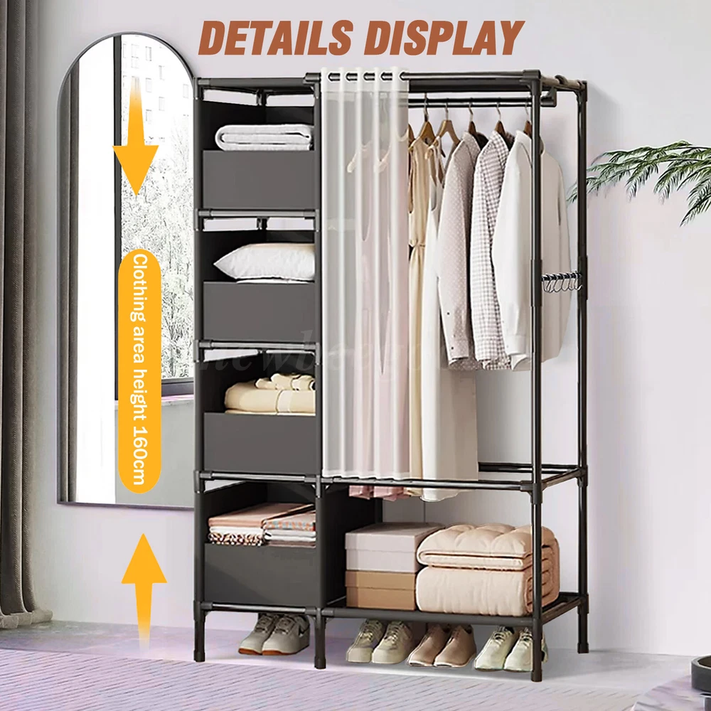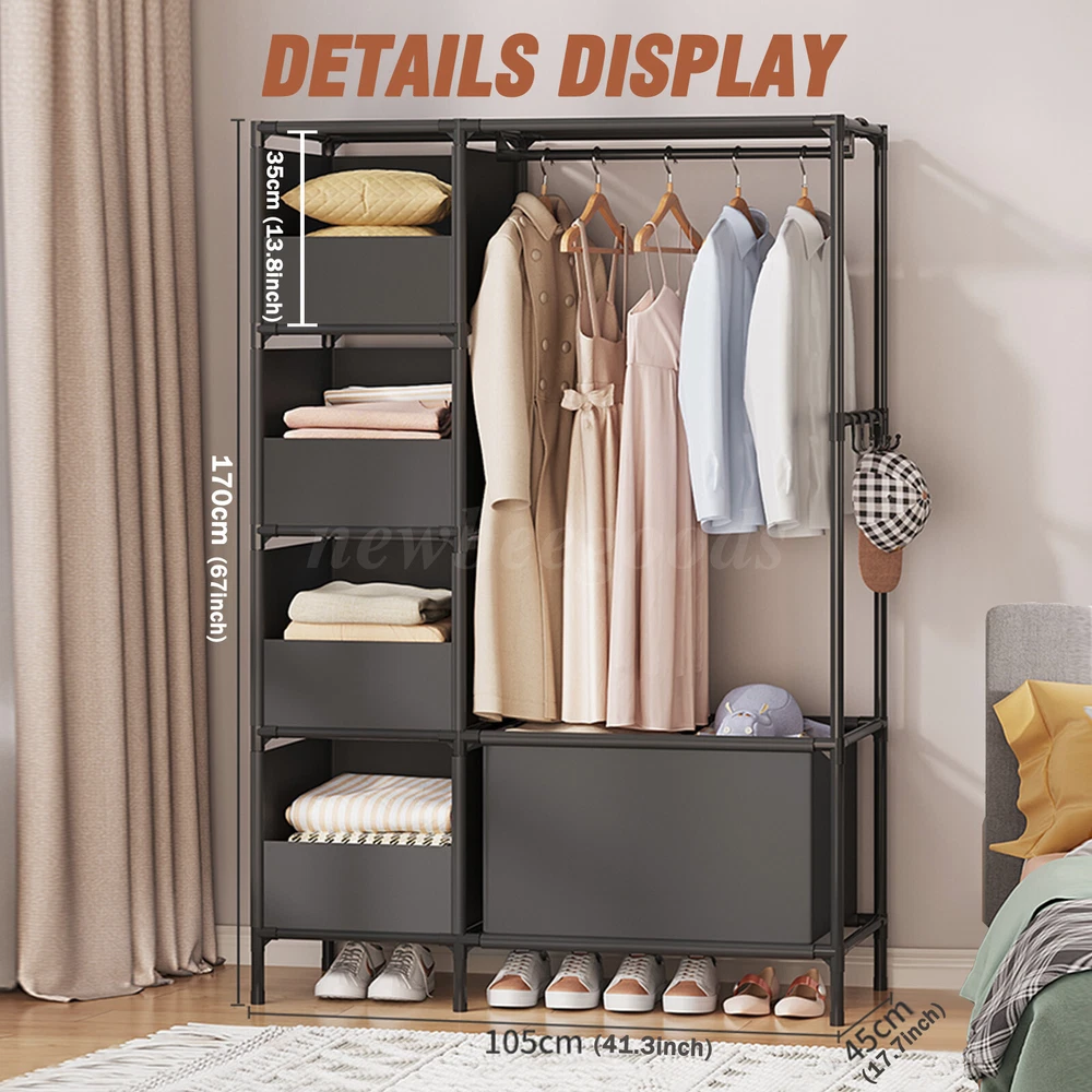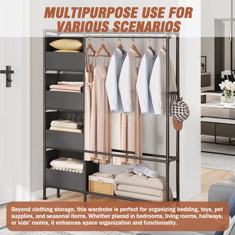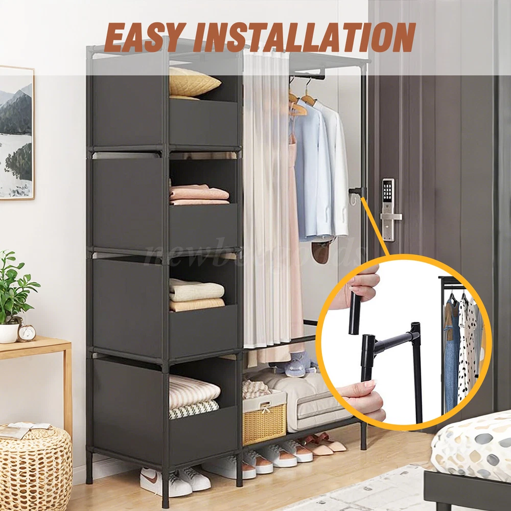 Heavy Duty Open Wardrobe Closet Garment Rack Clothing Hanging Organizer Shelves [ Description: This multifunctional portable wardrobe features a semi-open design for quick and convenient clothing selection, complemented by an upgraded curtain for privacy protection. It includes a clothes hanging rod, storage shelves, and 4 storage drawers, with elevated legs for hidden shoe storage, catering to diverse storage needs. Made with non-woven fabric and galvanized steel tubes, it is sturdy, durable, and built to last. Ideal for organizing clothes, bedding, toys, pet supplies, and more, it adapts seamlessly to various spaces. Its tool-free assembly makes setup simple and enjoyable, offering an efficient storage solution to keep your space tidy and elevate your lifestyle. Features: 【Semi-Open Design for Easy Clothing Access】 Unlike traditional enclosed wardrobes, the semi-open design offers clear and convenient clothing selection. The upgraded curtain design operates smoothly while ensuring privacy and a serene living environment. 【Versatile Storage Configuration for Varied Needs】 The wardrobe features a hanging rod, storage shelf, and 4 storage drawers designed for outerwear, dresses, bed linens, and folded clothes. Its elevated legs not only enhance stability but also provide a dedicated space for shoes, whether heels, sneakers, or casual footwear. 【Premium Materials for Durability】 Constructed with a non-woven fabric cover, fabric shelves, and galvanized steel tubes, the wardrobe ensures long-term stability and durability. It withstands daily wear and tear, maintaining its form even during relocations. 【Multipurpose Use for Various Scenarios】 Beyond clothing storage, this wardrobe is perfect for organizing bedding, toys, pet supplies, and seasonal items. Whether placed in bedrooms, living rooms, hallways, or kids’ rooms, it enhances space organization and functionality. 【Easy Tool-Free Assembly】 Designed for straightforward assembly, users can easily connect tubes to plastic connectors by following the manual—no additional tools required—making the DIY process effortless and enjoyable. Specification: Type: Portable Wardrobe Material: Galvanized Steel Tubes, Non-Woven Fabric Color: Black Dimensions: 41.3×17.7×67in / 105×45×170cm Style: Modern Minimalist Package Contents: Fabric Drawers × 4 Long Tubes × 11 Short Tubes × 42 Leg Tubes × 6 3-Way Plastic Connectors × 20 4-Way Plastic Connectors × 6 Straight 3-Way Connectors × 2 Large Shelf Fabric × 2 Small Shelf Fabric × 1 Hanging Hooks × 2 S-Shaped Hooks × 4 Foot Caps × 6 Note: 1.Please allow slight deviations due to manual measurements. 2.The actual product may differ slightly from the images due to display settings and lighting conditions. 3.Product details may vary slightly between manufacturing batches. If minor differences are a concern, please purchase with caution. Thank you for your understanding. 4.If you have any questions about the product, please feel free to contact us. We can only accept Paypal payment only. You can send payment to our paypal account by many payment methods(Credit or debit card through PayPal). 1. Items are US stock. 2. Item will be shipped out within 1- 2 Working days upon your payment completed. 3.Please do not hesitate to contact us if you have any questions about our products. We will be responsible for any damages or losses incurred in the shipping process. 1.If there are any problems with our products,Please feel free to contact us.We will always here to solve them for you.You don't need to contact ebay or paypal.And please DO NOT leave us Neutral/Negative feedback,It won't help the problem to be solved.And it is the worst hurst to a seller.We should try our best to make a happy easy transaction. 2.If you are satisfied with our products and our service,please tell your friend and leave us positive feedback;if you are not satisfied with our products or service,please DO tell us. 3.After receiving the item,you could contact us within 30 days.Refund will be given as money back or item exchange. 1. Usually, we reply for the messages within 24 hours, if you do not get response within 1-2 Working days , please check your Messages box one more time or Please email us AGAIN. 2. Email is the priority of our customer service, if you can't get us, please choose live response. 3. Positive feedback is automatically done once the payment is cleared. We appreciate your feedback. 4. The star-scores are very important to us. If anything about your transaction did not meet your expectations. Please let us know and give us the opportunity to work out for you before you leave feedback. Working Day: Monday to Friday Working Time: 9:00 am to 18:00 pm On Jan 16, 2025 at 03:22:49 PST, seller added the following information: