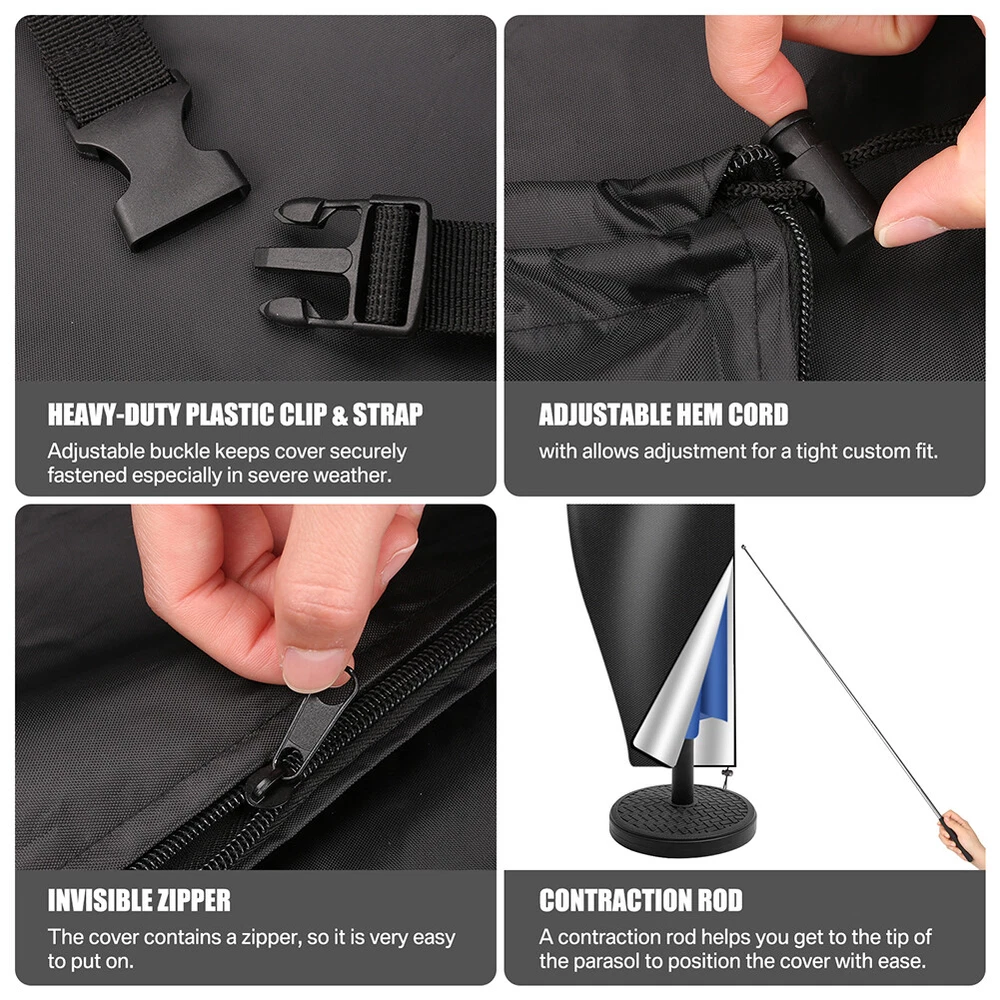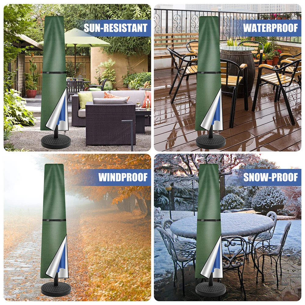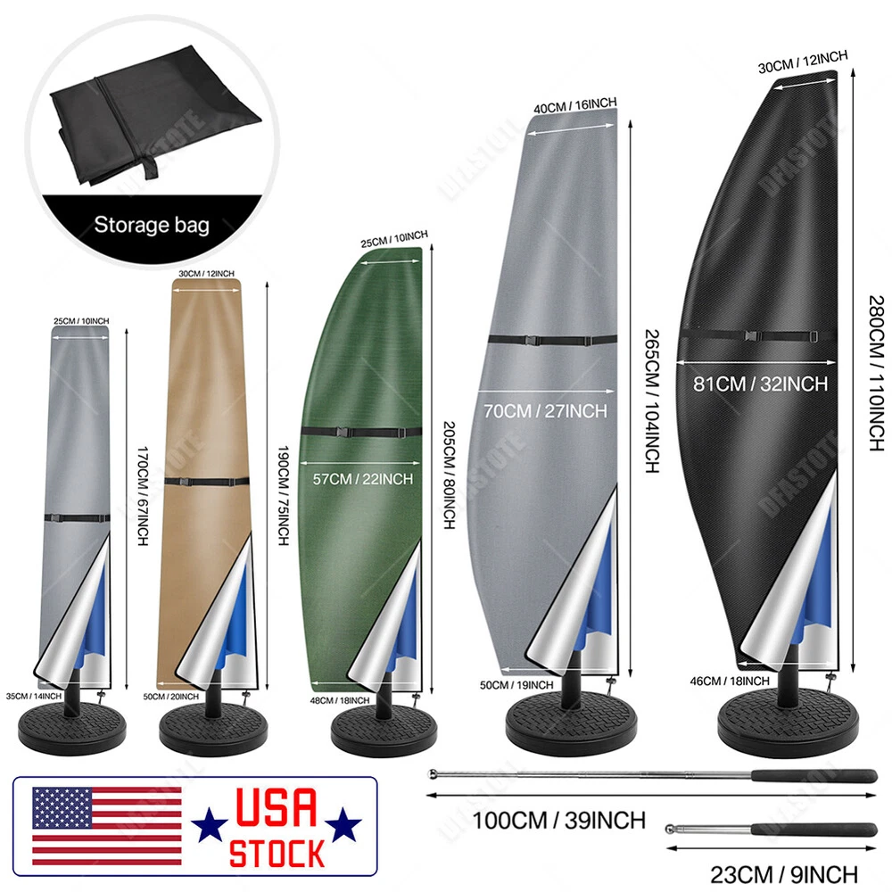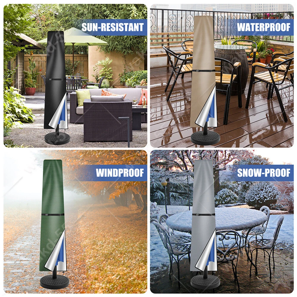 Features: 【 Heavy Duty Waterproof Material】- Made from 210D PVC-lined oxford fabric, this heavy-duty parasol cover is waterproof, UV-resistant, tear-resistant and fade-resistant, better protect your parasol from harsh environments such as strong sunshine, rain, snow, dust and more 【Wide Compatibility Size】- Our parasol cover fits most of parasols on market. Ideal size for a comprehensive range of waterproof patio offset umbrella covers. Fits 1.8 to 3.9 m (6 to 13ft) parasols.Check your parasol's dimensions for proper fit. 【WINDPROOF】 Easy to put on and take off with parasol cover with zip.There is a drawstring and belt which are specially designed to keep the cover secure on your umbrella. You can adjust them to ensure the cover will not be blown away by the wind, increasing the stability of the cover. 【WATERPROOF】Strong waterproof Oxford fabric, PU coated, breathable, lightweight, comfortable fitting and sturdy. The cover will not shrink, fade or deform in harsh conditions such as rain, snow, frost or bird droppings. cantilever parasol cover with ingeniously designed waterproof zipper. 【UV RESISTANT】Parasol cover prevents the sun's harmful rays from discoloring and fading your parasol, which is the right choice for keeping your parasol protected all year long. Especially to fit all weather conditions: rain, snow, sun exposure, etc. It is a right and modern way to apply a cheaper cover to protect the more expensive parasol. 【Parasol cover with telescopic pole】- you can use the telescopic pole to place the parasol cover on a standing canvas and complete the installation. Easily remove or hang up the protective cover. 【Easy to Clean and storage】 Come with a storage bag, easy to storage when not in use. The parasol protective cover is black, dirt and wear resistant. You can wipe with a damp cloth to quickly clean the cover. If you don't want to use it, you can put the parasol cover in a practical storage bag that doesn't take up any space. Specification: Material: 210D Oxford Color: Black,Green,Grey,Khaki Telescopic Pole Size:23-100cm Storage bag:25x18cm The size of the Parasol Umbrella Cover: 【SIZE】: 280cm (High) : 30cm (Top) x 81cm (Middle) x 46cm (Bottom ),Fits offset umbrella up to 9ft/2.7m DIA (Round) or 13ft/3.9m L (Square) 【SIZE】: 265cm (High) : 40cm (Top) x 70cm ( Middle ) x 50cm (Bottom) , Fits offset umbrella up to 8ft/2.4m DIA (Round) or 12ft/3.6m L (Square) 【SIZE】: 205cm (High) : 25cm (Top) x 57cm (Middle) x 48cm (Bottom) , Fits offset umbrella up to 7ft/2.13m DIA (Round) or 11ft/3.35m L (Square) 【SIZE】: 190 CM( High) x 30m (Top) x 50cm (Bottom), Fits market umbrella up to 8ft/2.4m DIA (Round) or 11ft/3.35m L (Square), but can NOT fit for cantilevered umbrellas any size. 【SIZE】: 170 CM ( High) x 25cm (Top) x 35cm (Bottom),Fits market umbrella up to 6ft/1.8m DIA (Round) or 9ft/2.7m L (Square), but can NOT fit for cantilevered umbrellas any size. Please measure your umbrella dimensions before order. umbrella dimensions before order. Why choose our cantilever parasol covers? ✓ The parasol covers are easy to Use and Storage ✓ This garden parasol covers are waterproof, it can be left outside all year round ✓ Can withstand extremes in temperature, frost, snow, rain and UV ✓ Against rain, snow, dust, and bird droppings How to find the perfect cover? 1.In order to properly measure your umbrella, crank it to the closed position so that the umbrella material closes completely around the umbrella pole. 2.With the umbrella closed, measure the circumference around the widest part of the umbrella material. You can also measure the diameter across the umbrella material at the widest point. 3.Measure the height (sometimes referred to as length) from the top of the umbrella to where the material ends. 4.Compare your dimensions to the sizes of our patio umbrella covers shown above and select the size that is equal to or slightly larger than your umbrella dimensions from the drop down menu above. Package List: 1 x Parasol Cover 1 x Storage Bag 1x 100cm Telescopic Pole