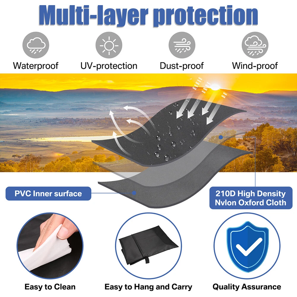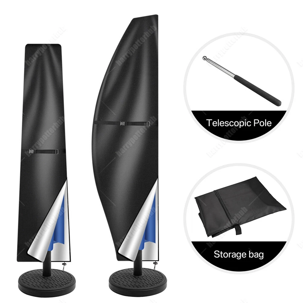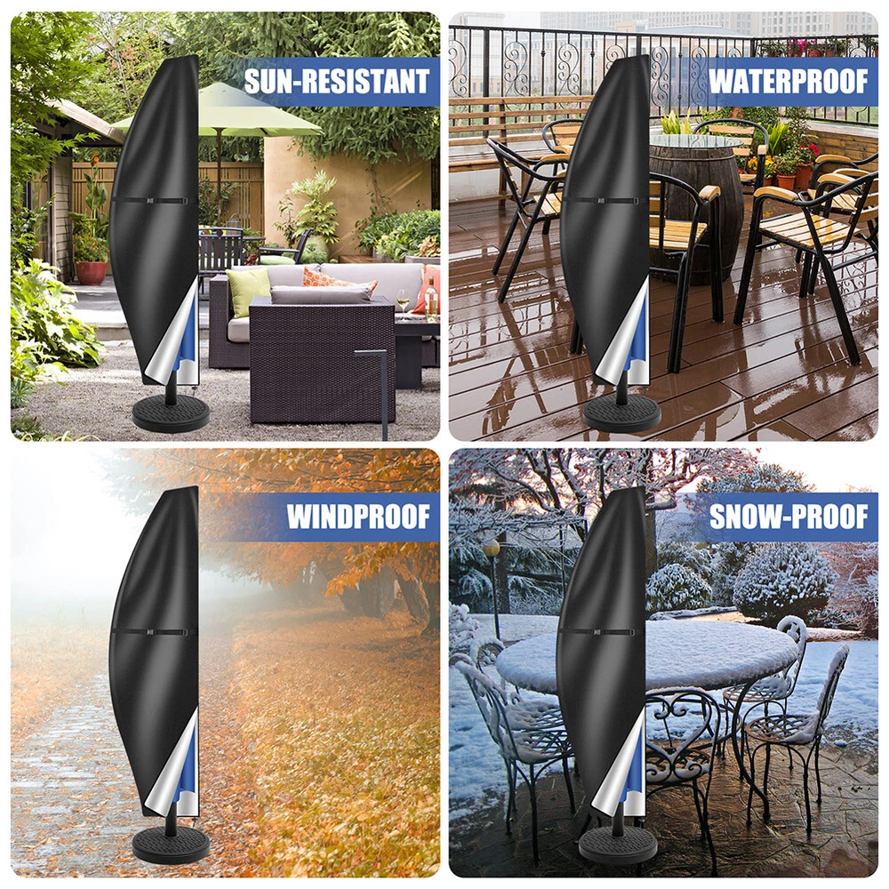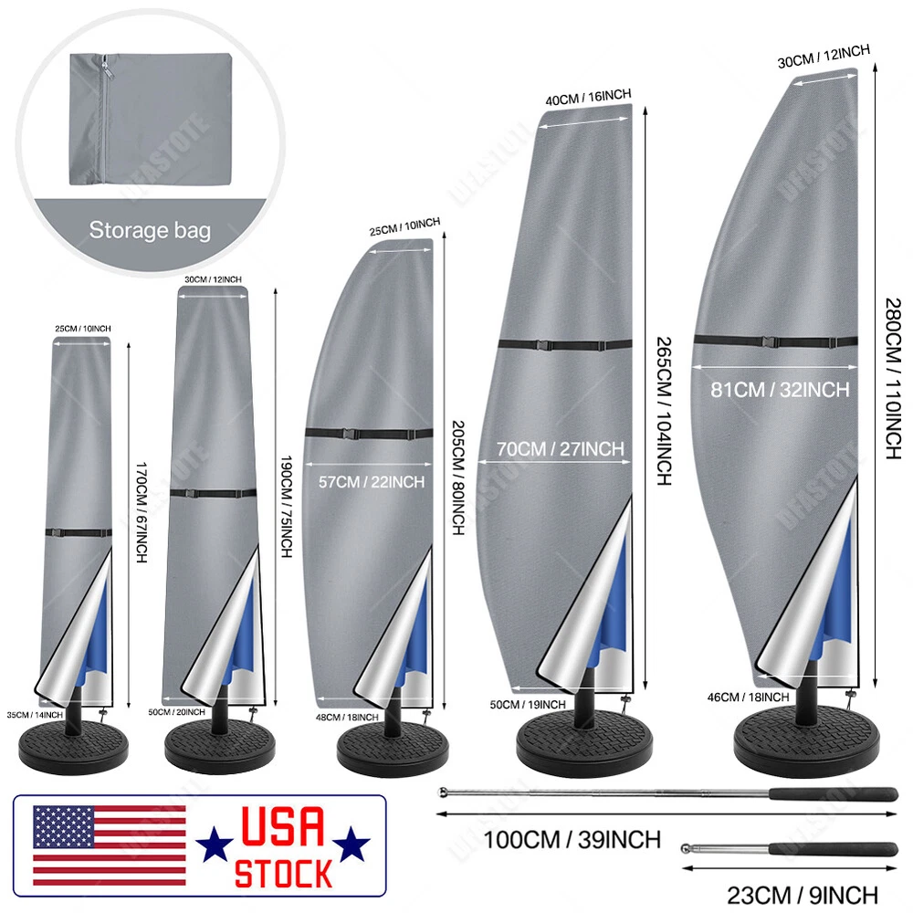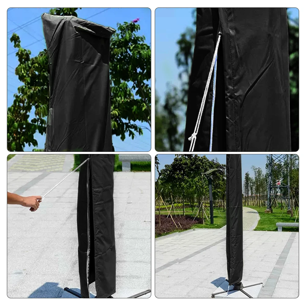 Features: 【 Heavy Duty Waterproof Material】- Made from 210D PVC-lined oxford fabric, this heavy-duty parasol cover is waterproof, UV-resistant, tear-resistant and fade-resistant, better protect your parasol from harsh environments such as strong sunshine, rain, snow, dust and more 【Wide Compatibility Size】- Our parasol cover fits most of parasols on market. Ideal size for a comprehensive range of waterproof patio offset umbrella covers. Fits 1.8 to 3.9 m (6 to 13ft) parasols.Check your parasol's dimensions for proper fit. 【WINDPROOF】 Easy to put on and take off with parasol cover with zip.There is a drawstring and belt which are specially designed to keep the cover secure on your umbrella. You can adjust them to ensure the cover will not be blown away by the wind, increasing the stability of the cover. 【WATERPROOF】Strong waterproof Oxford fabric, PU coated, breathable, lightweight, comfortable fitting and sturdy. The cover will not shrink, fade or deform in harsh conditions such as rain, snow, frost or bird droppings. cantilever parasol cover with ingeniously designed waterproof zipper. 【UV RESISTANT】Parasol cover prevents the sun's harmful rays from discoloring and fading your parasol, which is the right choice for keeping your parasol protected all year long. Especially to fit all weather conditions: rain, snow, sun exposure, etc. It is a right and modern way to apply a cheaper cover to protect the more expensive parasol. 【Parasol cover with telescopic pole】- you can use the telescopic pole to place the parasol cover on a standing canvas and complete the installation. Easily remove or hang up the protective cover. 【Easy to Clean and storage】 Come with a storage bag, easy to storage when not in use. The parasol protective cover is black, dirt and wear resistant. You can wipe with a damp cloth to quickly clean the cover. If you don't want to use it, you can put the parasol cover in a practical storage bag that doesn't take up any space. Specification: Material: 210D Oxford Color: Black,Green,Grey,Khaki Telescopic Pole Size:23-100cm Storage bag:25x18cm The size of the Parasol Umbrella Cover: 【SIZE】: 280cm (High) : 30cm (Top) x 81cm (Middle) x 46cm (Bottom ),Fits offset umbrella up to 9ft/2.7m DIA (Round) or 13ft/3.9m L (Square) 【SIZE】: 265cm (High) : 40cm (Top) x 70cm ( Middle ) x 50cm (Bottom) , Fits offset umbrella up to 8ft/2.4m DIA (Round) or 12ft/3.6m L (Square) 【SIZE】: 205cm (High) : 25cm (Top) x 57cm (Middle) x 48cm (Bottom) , Fits offset umbrella up to 7ft/2.13m DIA (Round) or 11ft/3.35m L (Square) 【SIZE】: 190 CM( High) x 30m (Top) x 50cm (Bottom), Fits market umbrella up to 8ft/2.4m DIA (Round) or 11ft/3.35m L (Square), but can NOT fit for cantilevered umbrellas any size. 【SIZE】: 170 CM ( High) x 25cm (Top) x 35cm (Bottom),Fits market umbrella up to 6ft/1.8m DIA (Round) or 9ft/2.7m L (Square), but can NOT fit for cantilevered umbrellas any size. Please measure your umbrella dimensions before order. umbrella dimensions before order. Why choose our cantilever parasol covers? ✓ The parasol covers are easy to Use and Storage ✓ This garden parasol covers are waterproof, it can be left outside all year round ✓ Can withstand extremes in temperature, frost, snow, rain and UV ✓ Against rain, snow, dust, and bird droppings How to find the perfect cover? 1.In order to properly measure your umbrella, crank it to the closed position so that the umbrella material closes completely around the umbrella pole. 2.With the umbrella closed, measure the circumference around the widest part of the umbrella material. You can also measure the diameter across the umbrella material at the widest point. 3.Measure the height (sometimes referred to as length) from the top of the umbrella to where the material ends. 4.Compare your dimensions to the sizes of our patio umbrella covers shown above and select the size that is equal to or slightly larger than your umbrella dimensions from the drop down menu above. Package List: 1 x Parasol Cover 1 x Storage Bag 1x 100cm Telescopic Pole