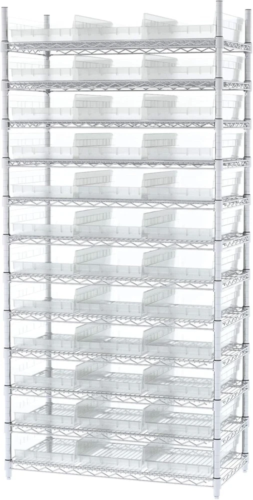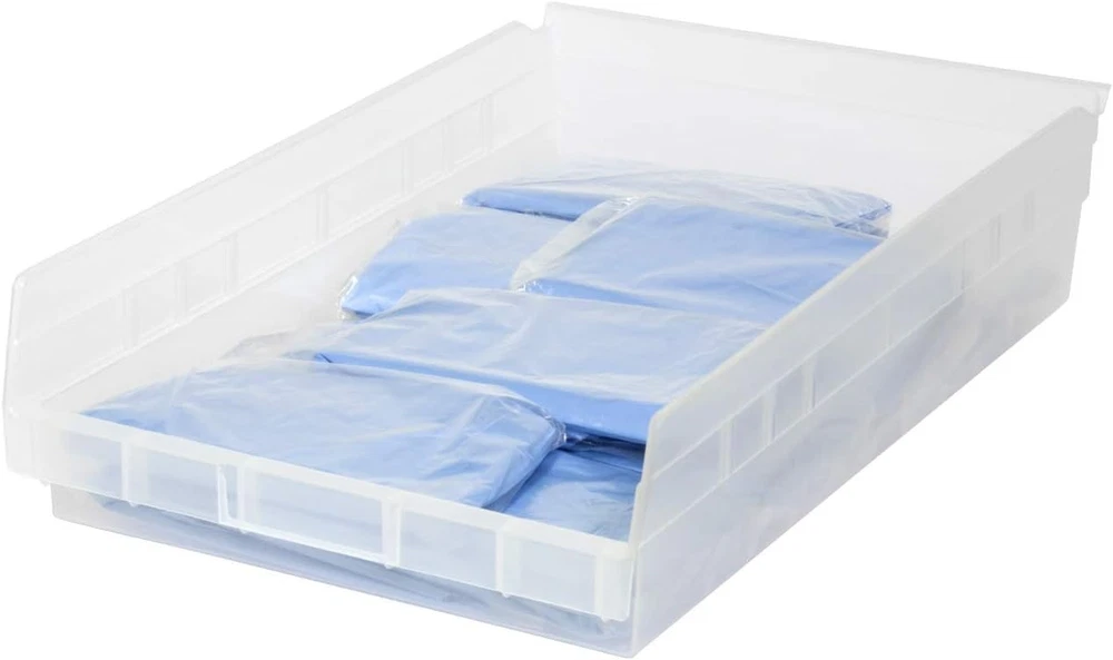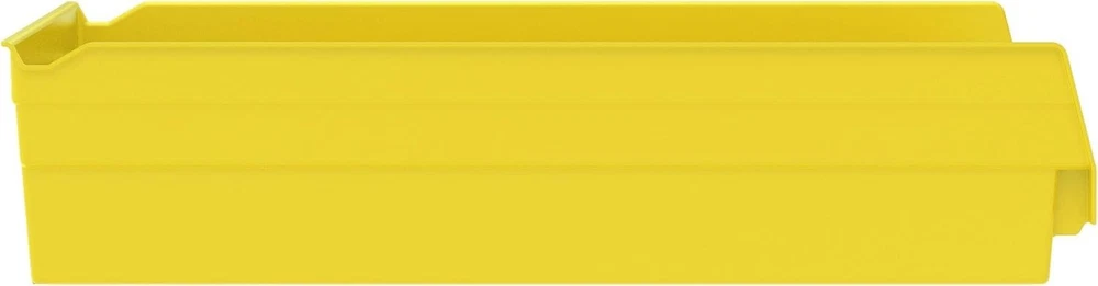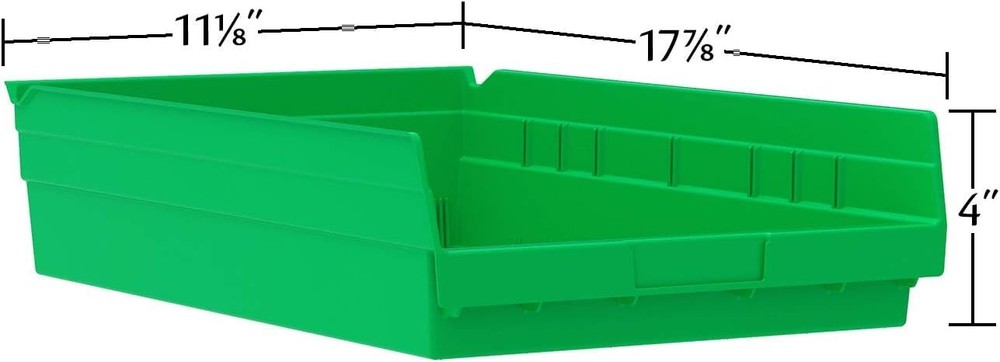 VERSATILE STORAGE CONTAINERS: Shelf Bins are great for any space; Use them on shelves, as an under sink organizer, cabinet organizer, or for garage storage; Bins fit with 12", 18", and 24" deep storage shelves, vertical storage, and pick racks DURABLE ORGANIZATION: These storage bins are made from industrial-grade polymers, offering a strong, long-lasting alternative to weak cardboard bins; Each storage bin is easy-to-clean and can be used indoors or outdoors; Shelf bins are waterproof SPILL-FREE RETRIEVAL: Lip design allows effortless forward tilting of the bin on racks, ensuring spill-free retrieval; Heavy duty plastic storage bins are great for parts storage, kitchen utensils, kitchen cabinet organization, closet storage, and more CUSTOMIZABLE SHELF ORGANIZER: Optional bin cups, dividers, and label holders (sold separately) let you tailor the heavy duty storage bins to your specific needs; Bins come in a variety of colors to color code your storage; Empty bins can be nested DIMENSIONS: Outside Dimensions - 17-7/8" x 11-1/8" x 4"; Inside Dimensions - 16-1/2" x 10" x 4"; Curved-bottom hopper front makes it easy to retrieve small parts; Weight capacity is limited to shelf weight capacity; Proudly made in the USA; Storage bins are NOT stackable