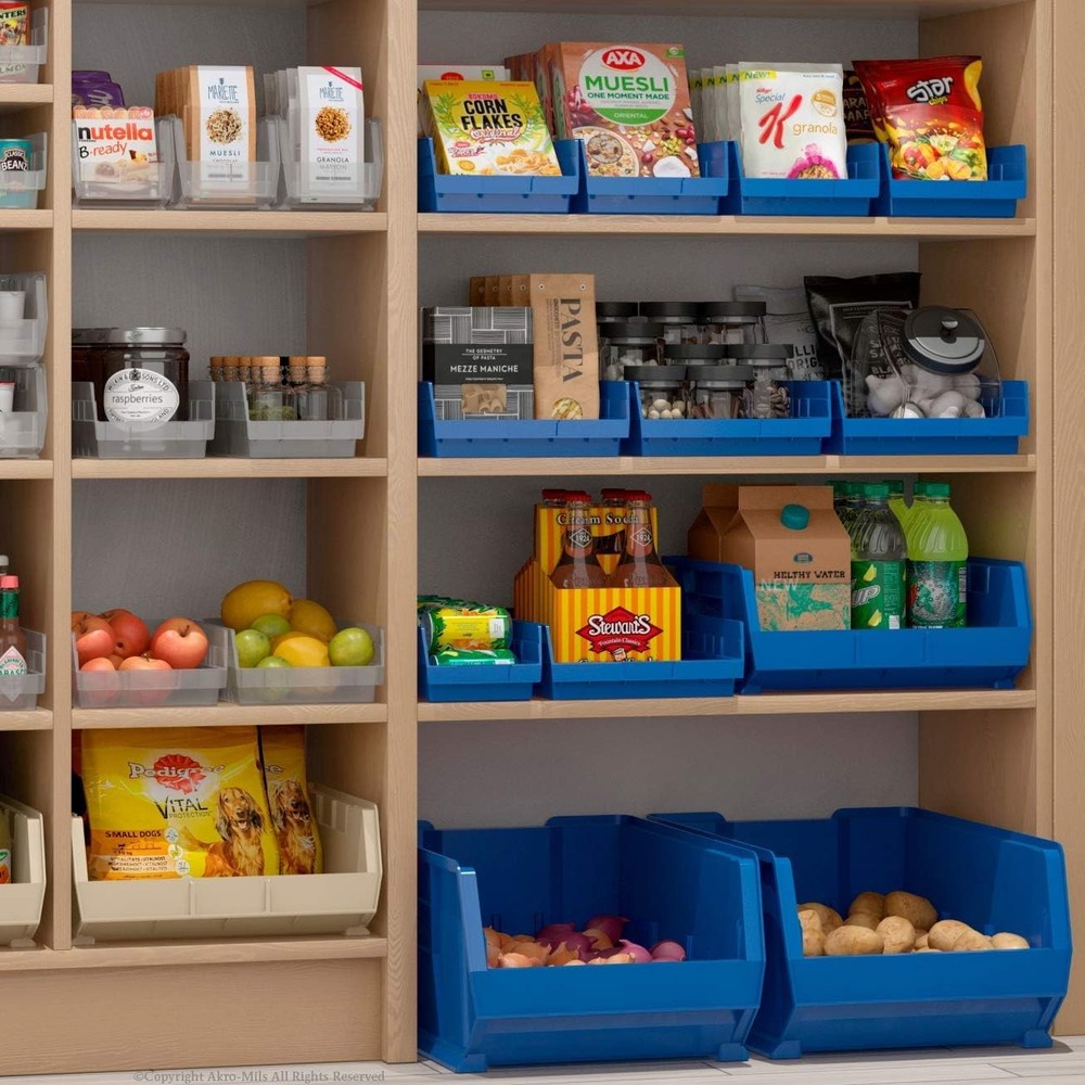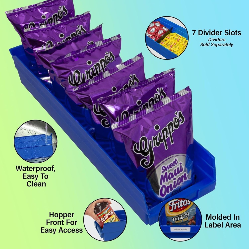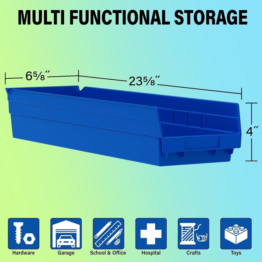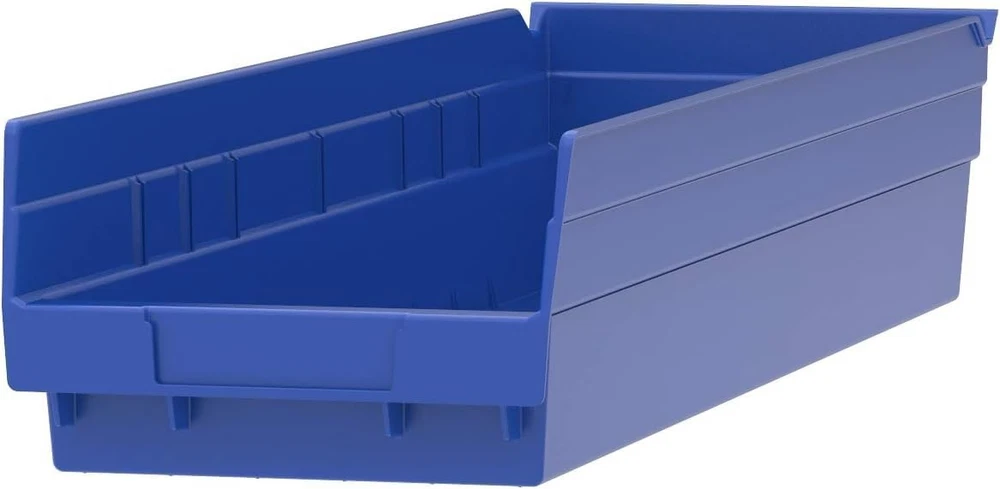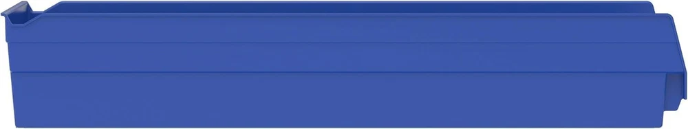 VERSATILE STORAGE CONTAINERS: Shelf Bins are great for any space; Use them on shelves, as an under sink organizer, cabinet organizer, or for garage storage; Bins fit with 12", 18", and 24" deep storage shelves, vertical storage, and pick racks DURABLE ORGANIZATION: These storage bins are made from industrial-grade polymers, offering a strong, long-lasting alternative to weak cardboard bins; Each storage bin is easy-to-clean and can be used indoors or outdoors; Shelf bins are waterproof SPILL-FREE RETRIEVAL: Lip design allows effortless forward tilting of the bin on racks, ensuring spill-free retrieval; Heavy duty plastic storage bins are great for parts storage, kitchen utensils, kitchen cabinet organization, closet storage, and more CUSTOMIZABLE SHELF ORGANIZER: Optional bin cups, dividers, and label holders (sold separately) let you tailor the heavy duty storage bins to your specific needs; Bins come in a variety of colors to color code your storage; Empty bins can be nested DIMENSIONS: Outside Dimensions - 23-5/8" x 6-5/8" x 4"; Inside Dimensions - 22-1/8" x 5-1/2" x 4"; Curved-bottom hopper front makes it easy to retrieve small parts; Weight capacity is limited to shelf weight capacity; Proudly made in the USA; Storage bins are NOT stackable