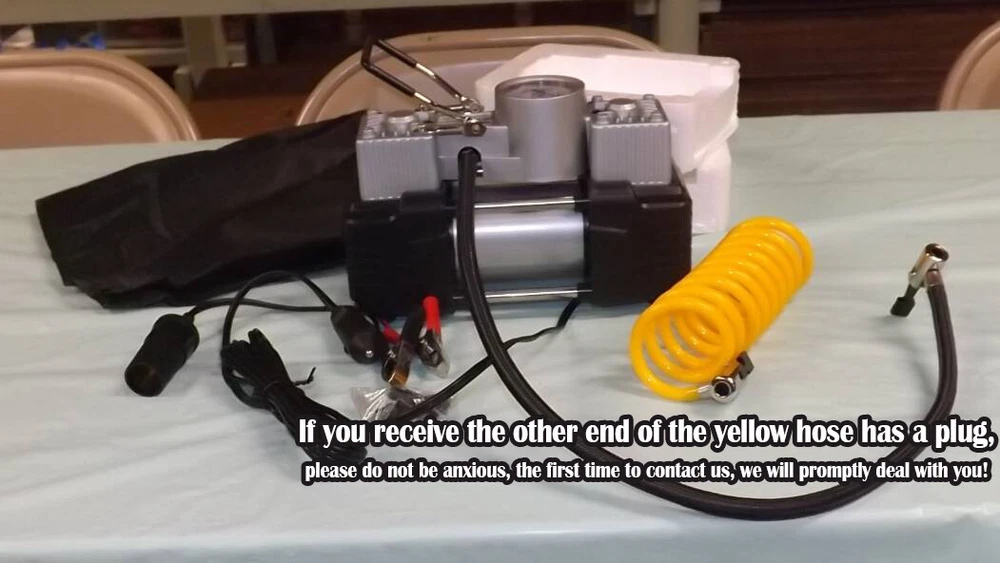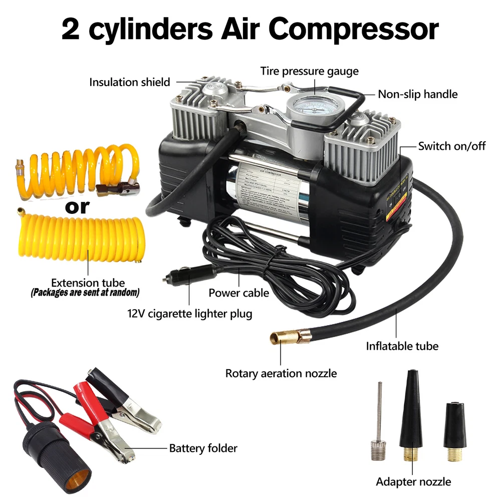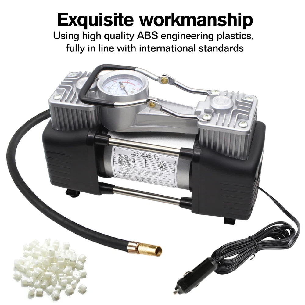 Product Description: 🥳 Feature : 【Inflate in seconds】 Unlike ordinary air compressor tire inflators that take a long time, ours does the job in 1.5 minutes or less. This 12V portable air compressor has dual cylinders with a maximum pressure of 150Psi and a flow rate of 60L/min; 4 times faster than other products. 【Equipment included】 Considering the problem of tire leaks, we put a tire repair tool in the tool pouch. The tire repair tool kit includes pliers, knife, screwdriver, tire repair strip, split-eye pins, and sharpeners. It also comes with 3 nozzle adapters and locking air clips to easily inflate air cushions/bikes/toys/inflatables. 【LCD Digital Pressure Gauge (with backlight)】 In addition to inflating the tire pump, the built-in digital air gauge checks and monitors tire pressure with a large bright LCD backlit digital display. 【Application scope】 Especially suitable for SUV, truck, van, RV, crossover, MPV, camper, trailer, van, also can be used for car, motorcycle, golf cart, bicycle, etc. 【Travel Gift】 Carry our small air compressor on your car trip, it's easy to use and keep your tires in good condition, you can buy a small tire inflator as a gift for your friends or family. 🚗 Specification: Air Flow: 60L/min Use 12 Volt DC 23A Only Color: Silver Material: Carbon Steel+Plastic+Electronic Component Power: DC 12V 280W Power Cord Length: 300cm Current: 23A(Max) Maximum Output: 150 PSI Working Temperature: -55°C to 60°C Size: 9.6*4.7*4.7inch (L x W x H) 🎁 Package Include: Package Included 1 x Portable Air Compressor Pump 1 x Power Cord with Battery Clip 1 x Extended Air Hose 3 x Inflation Adapters 1 x tool pouch 1 x User Manual 【Application scope 】 Especially suitable for SUV, truck, van, RV, crossover, MPV, camper, trailer, van, also can be used for car, motorcycle, golf cart, bicycle, etc. 【 Inflate in seconds 】 Unlike ordinary air compressor tire inflators that take a long time, ours does the job in 1.5 minutes or less. This 12V portable air compressor has dual cylinders with a maximum pressure of 150Psi and a flow rate of 60L/min; 4 times faster than other products. 【 LCD Digital Pressure Gauge (with backlight) 】 In addition to inflating the tire pump, the built-in digital air gauge checks and monitors tire pressure with a large bright LCD backlit digital display.