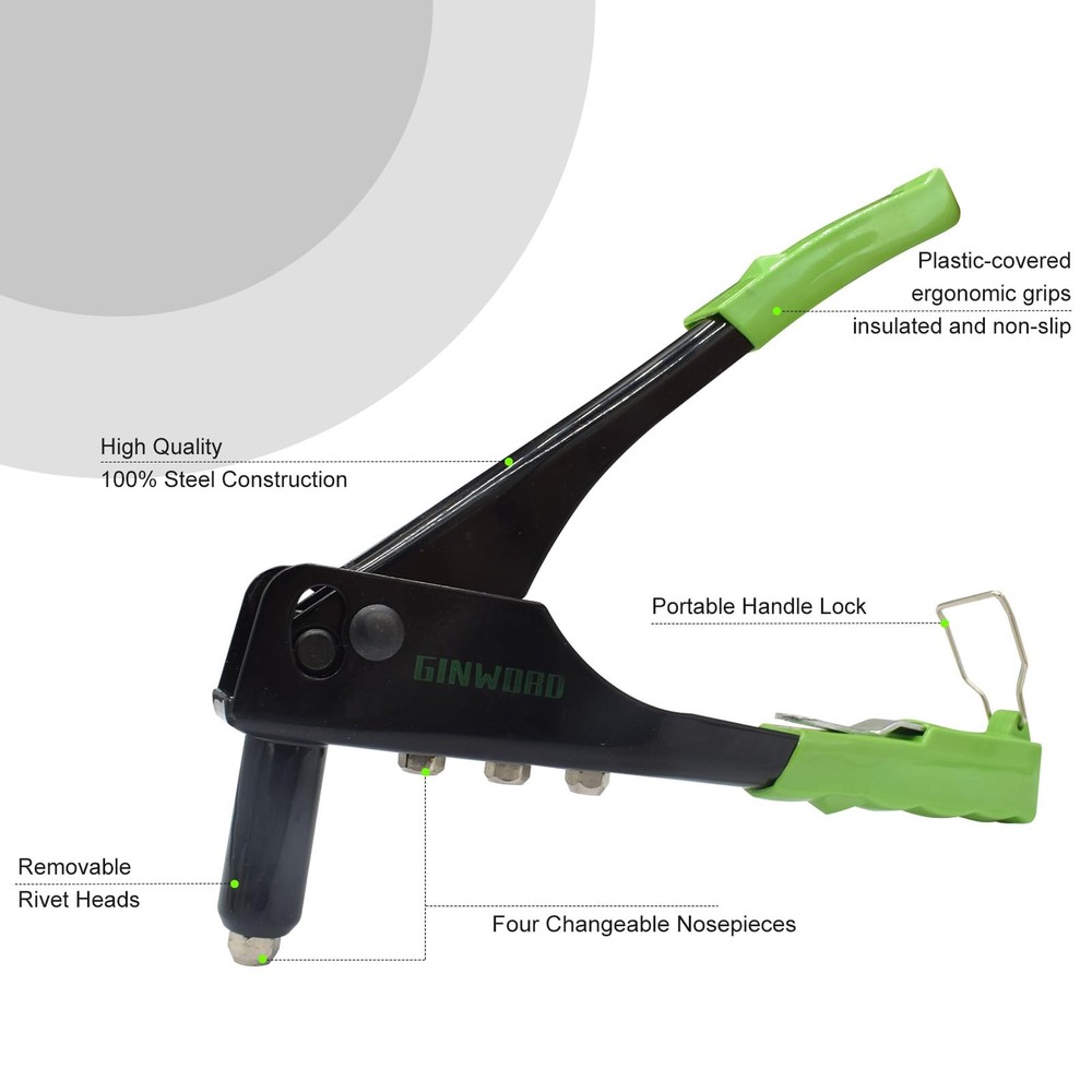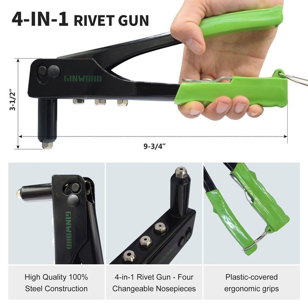 This rivet gun kit is a game-changer for DIY and professional projects! The solid steel construction feels durable, and the four interchangeable heads make installing different-sized rivets effortless. I love that it includes 200 rivets and HSS drill bits—no extra trips to the hardware store. Perfect for auto repairs, furniture fixes, or HVAC work. Smooth operation with no slipping or bending. Great value for the price!