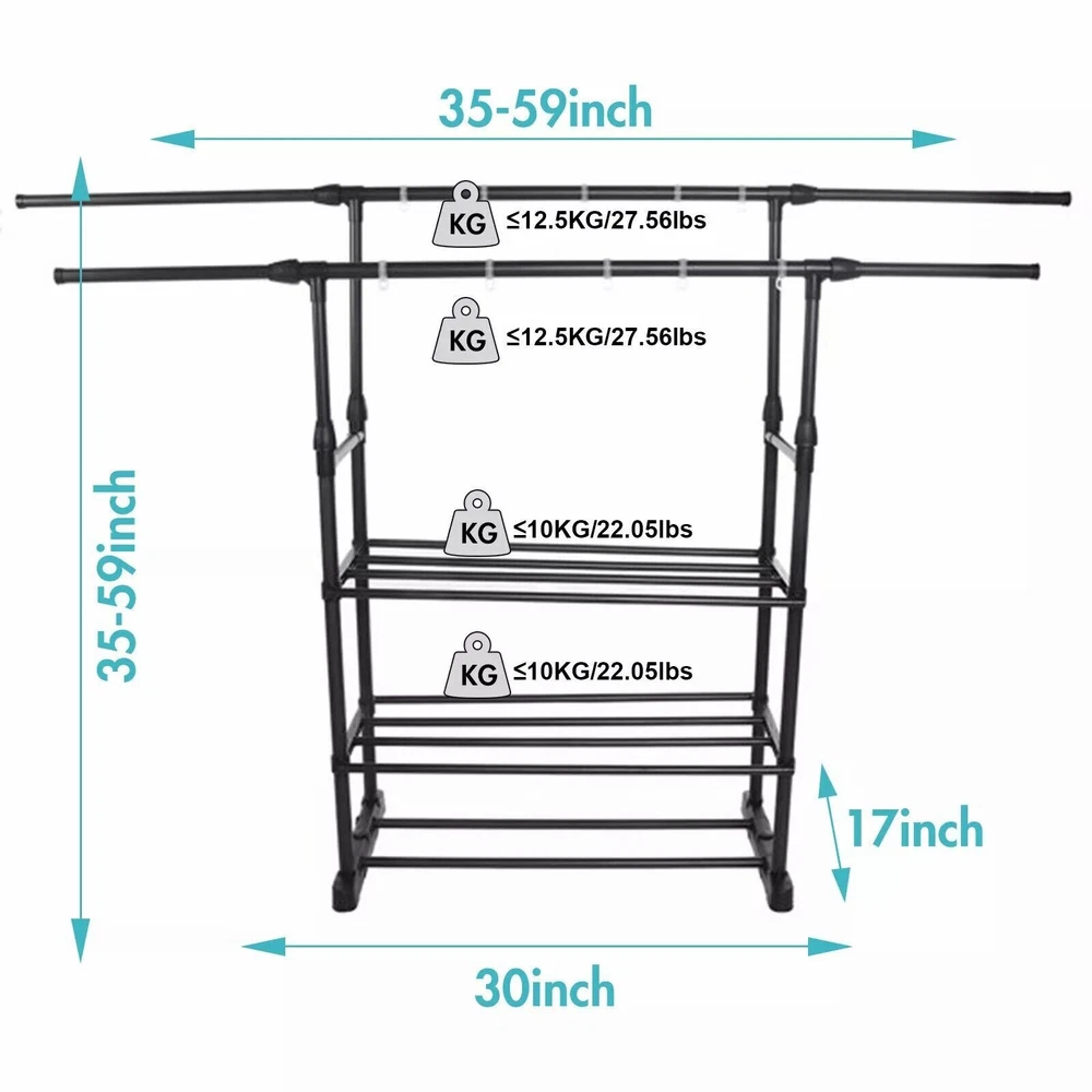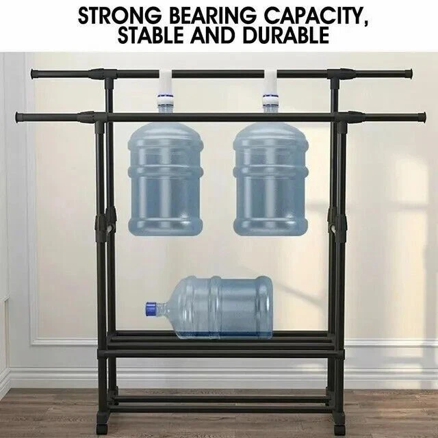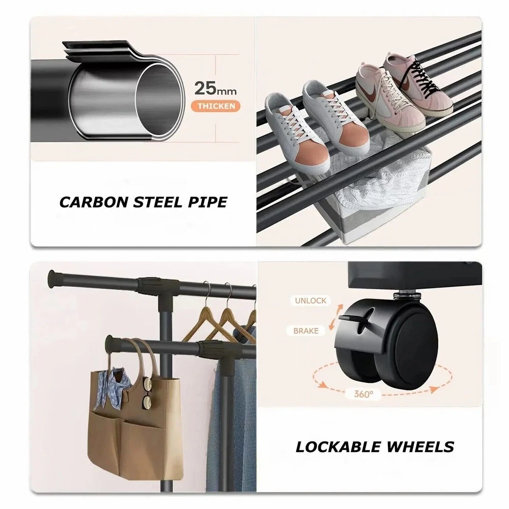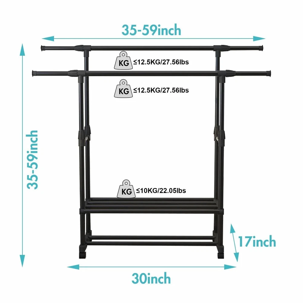 About Our Garment Rack 【Multifunctional】 This clothing rack is designed as a high-low rod style, the hanging area gives you enough space to place your clothes, shirts, pants, and even long skirts. The bottom shelf is great for storing shoes, or storage boxes. 【Movable & Heavy Duty】 There are 4 wheels with 360°rotation on the clothes rack, and 2 lockable wheels allow a stable stop. At the same time, the wheels will not make noise or scratch the floor when moving. 【Save Space】 This portable garment rack fits anywhere you want, such as your bedroom, cloakroom, laundry room, or entryway, organizing and storing your clothes to make your room neat and clean. 【Easy to Assemble】 We have bagged and differentiated each part, but some parts must be placed in a specific position, to avoid installation errors, please confirm the number of parts and read the product manual carefully before you start assembling. 【Professional Service】 We have a professional design team, strict product quality control, and are committed to providing the best products for each customer. If you have any questions, you can contact us and we will respond within 24 hours. Product Dimension Package Weight: 5.1/5.8 kg Color: Black Material(High-quality metal Overall) Dimensions: The left and right extensions are about 90-150cm, the height of the two poles is about 90-155cm, and the width between the two poles is about 32cm. The bottom is 42cm*76cm Freestanding drying rack suitable for any place of your home, such as bedroom, hallway, balcony and laundry room. This is a decorative and functional garment rack that provide you a large storage space, but also look pretty. Make your bedroom tidy and orderly. Double pole hanging clothes The thick bars provide stability to this garment rack so it can easily hold heavy coats Extended bottom storage shelf The clothes rack have 360°wheels in the bottom,easy mobility and great practicality.