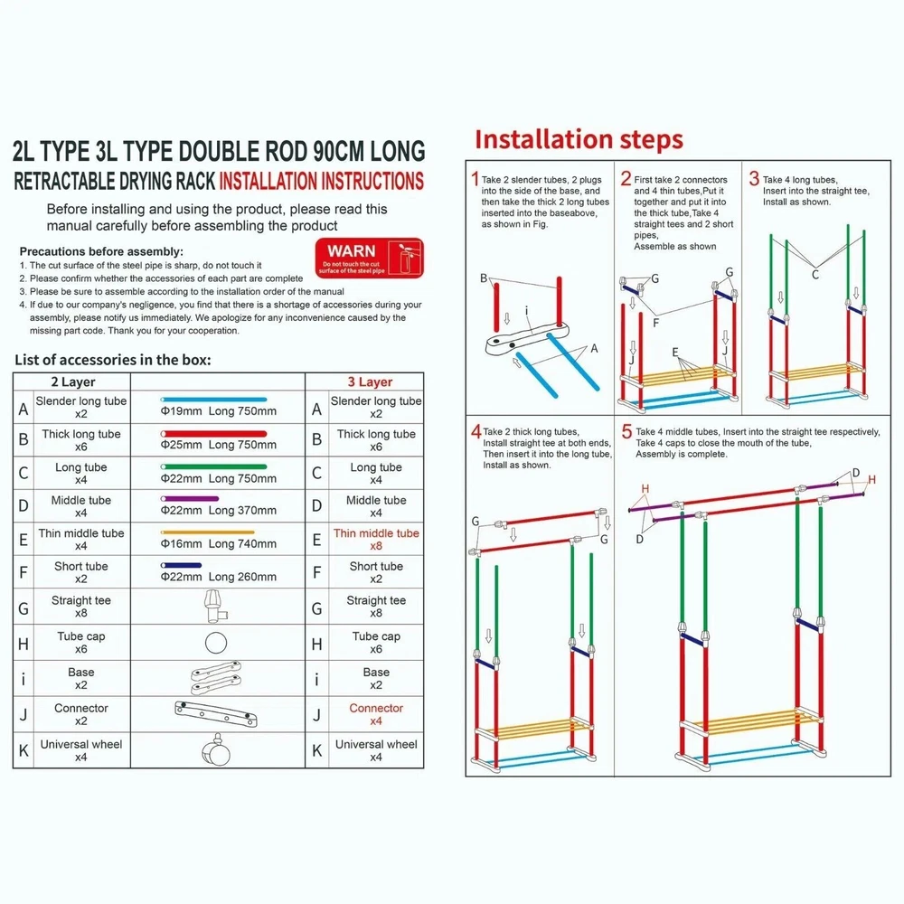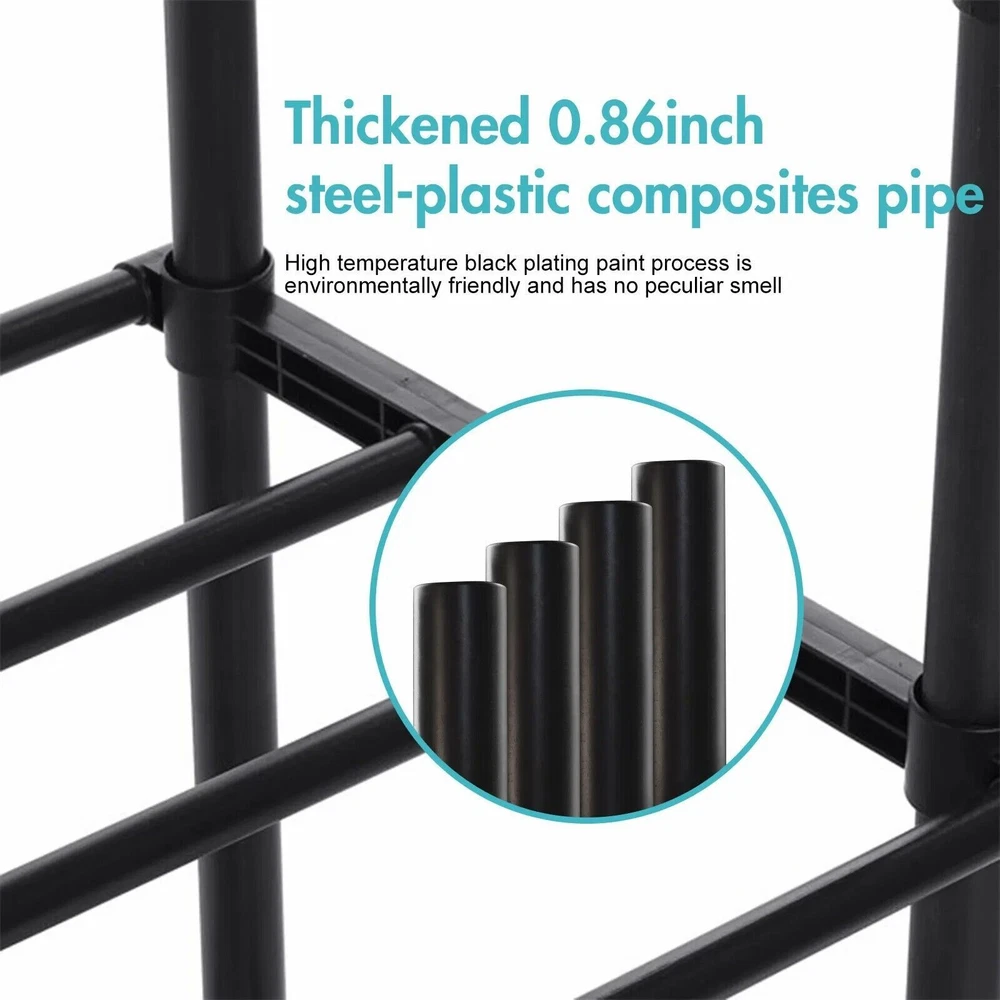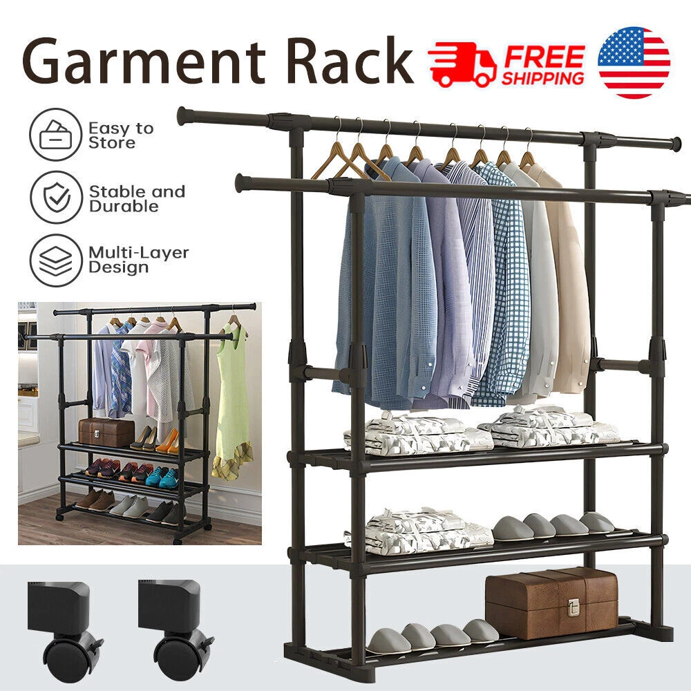 About Our Garment Rack 【Multifunctional】 This clothing rack is designed as a high-low rod style, the hanging area gives you enough space to place your clothes, shirts, pants, and even long skirts. The bottom shelf is great for storing shoes, or storage boxes. 【Movable & Heavy Duty】 There are 4 wheels with 360°rotation on the clothes rack, and 2 lockable wheels allow a stable stop. At the same time, the wheels will not make noise or scratch the floor when moving. 【Save Space】 This portable garment rack fits anywhere you want, such as your bedroom, cloakroom, laundry room, or entryway, organizing and storing your clothes to make your room neat and clean. 【Easy to Assemble】 We have bagged and differentiated each part, but some parts must be placed in a specific position, to avoid installation errors, please confirm the number of parts and read the product manual carefully before you start assembling. 【Professional Service】 We have a professional design team, strict product quality control, and are committed to providing the best products for each customer. If you have any questions, you can contact us and we will respond within 24 hours. Product Dimension Package Weight: 5.1/5.8 kg Color: Black Material(High-quality metal Overall) Dimensions: The left and right extensions are about 90-150cm, the height of the two poles is about 90-155cm, and the width between the two poles is about 32cm. The bottom is 42cm*76cm Freestanding drying rack suitable for any place of your home, such as bedroom, hallway, balcony and laundry room. This is a decorative and functional garment rack that provide you a large storage space, but also look pretty. Make your bedroom tidy and orderly. Double pole hanging clothes The thick bars provide stability to this garment rack so it can easily hold heavy coats Extended bottom storage shelf The clothes rack have 360°wheels in the bottom,easy mobility and great practicality.