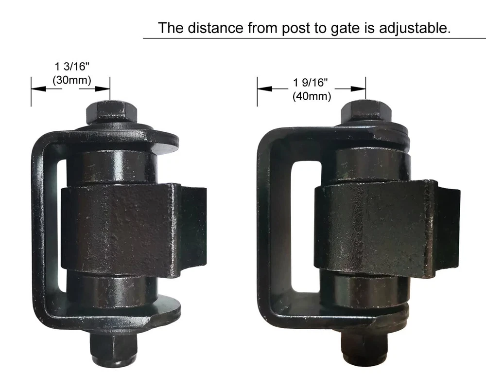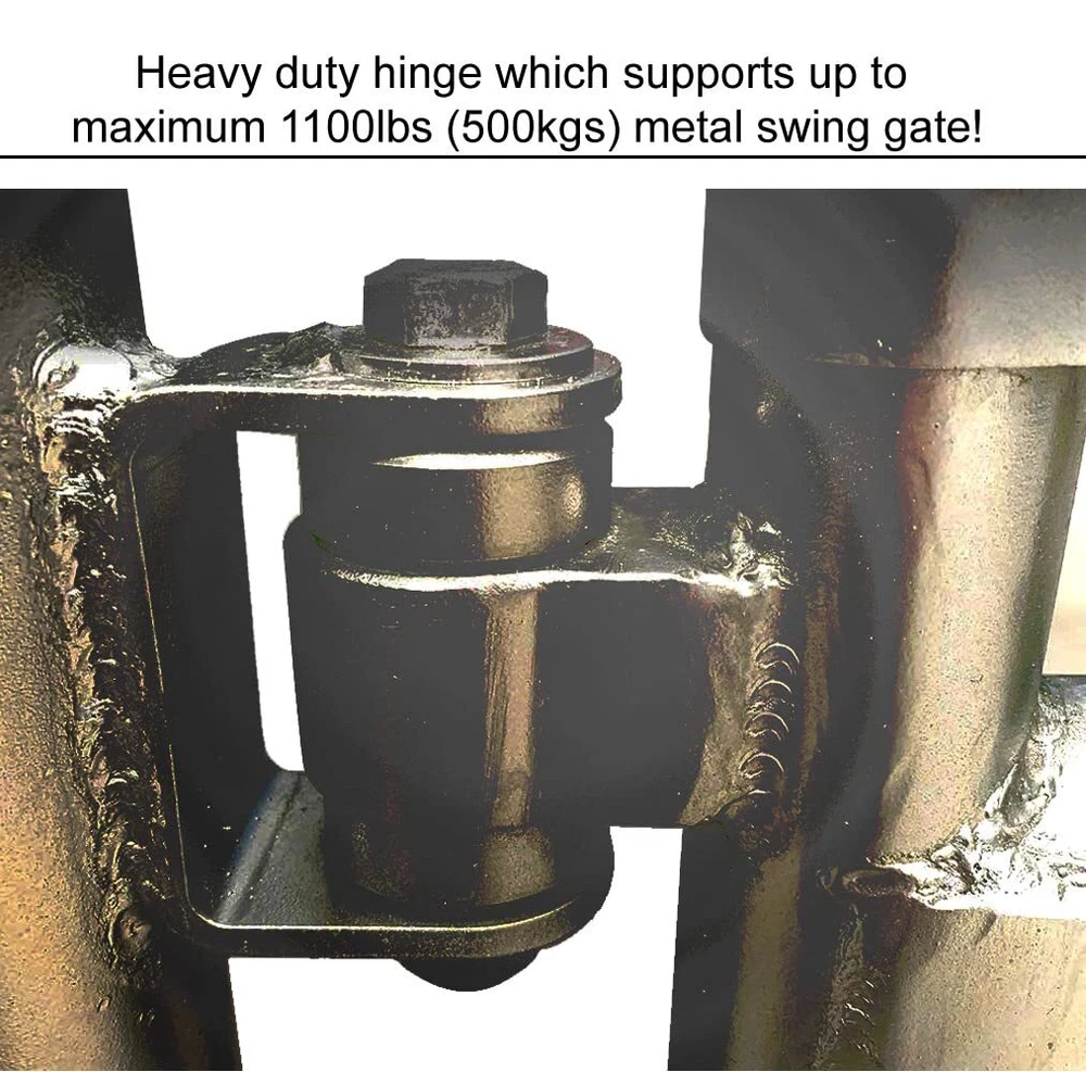 The sold on to gate roller hinge is designed for the metal swing gates. It is maintenance free - you'll never have to grease them! The super strong hinges are adjustable for perfect installations and offer near frictionless movement. It's ideal for estate, commercial, industrial, ornamental iron and access controlled gates. The slotted yoke is for on site adjustment! HEAVY DUTY INDUSTRIAL- The gate hinge is made of high quality steel so that each pair of the hinge can hold up to 1100lbs driveways and swing gates! ADJUSTABLE - The distance between the gate post and the gate can be adjusted horizontally for perfect installations! EASY TO INSTALL - Weld the flat backing plate to the mounting post and the rotating part to the gate! It's ideal for both flat and round post! TOUGH & DURABLE - Highest weight ratings, tested to over 1 Million open/close cycles! MAINTENANCE FREE - The hinges contain high-temperature sealed bearings, safe to -coat after installation: No greasing - no maintenance.