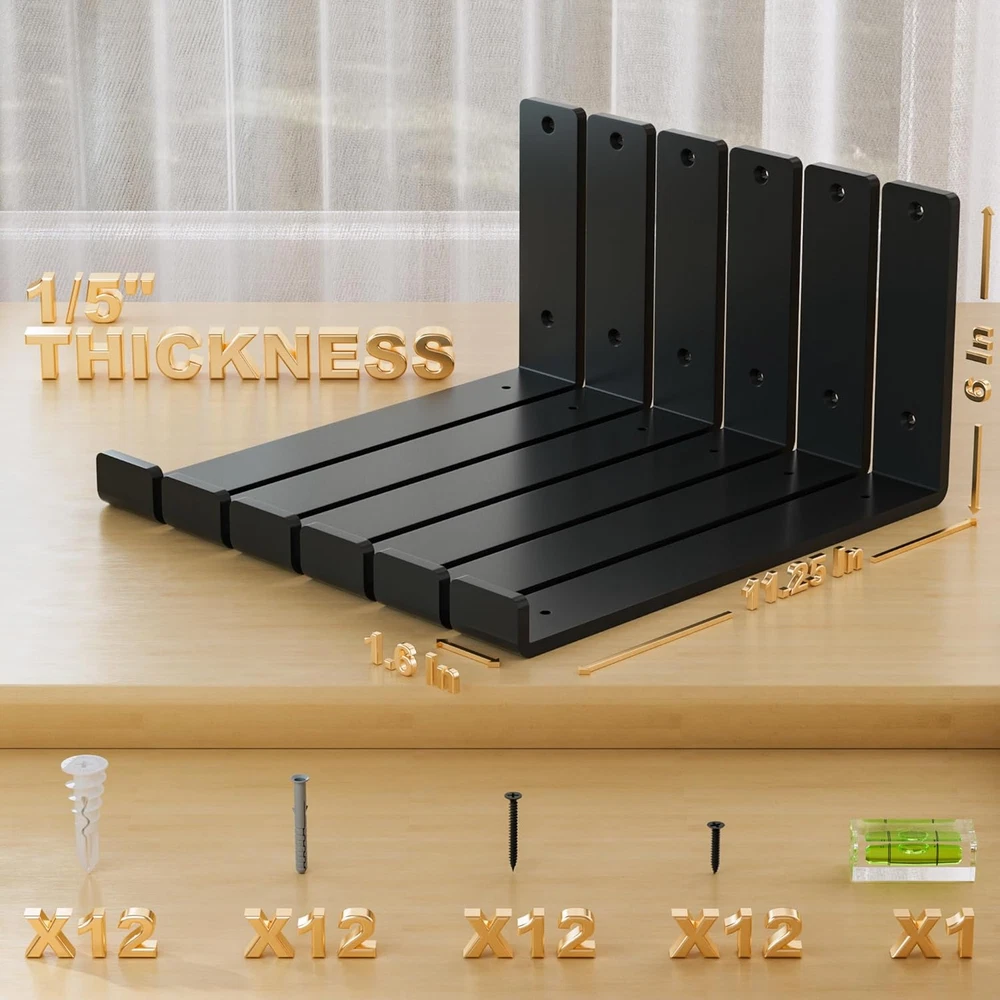 Menu Other Items Feedbacks About Us Contact Us Add To Favorites Heavy Duty Shelf Brackets 12 Inch (1/5") Thick, 6 Pack Floating Hidden Shelf Brackets, Rustic Industrial Shelf Brackets with Modern Iron Finish 【Thicker Heavy Duty Shelf Bracket 】:1/5 Inch thickness,MaybeRain 7.25 inch iron finish shelf brackets, which is thick as hell!These black shelf brackets are made of high quality steel. With high strength screws it can carry up to 100lbs.It is worth mentioning that, when used with 1.5-inch thick wood, it will have a hidden function to increases modern fashion sense for your room, also saves you lots of free space. 【90-Degree Angle】:The shape of floating shelf brackets are different from other brackets for shelves. With exquisite bending process we asure you that the bracket is totally 90° in horizontal,you can rest assure to put anything you want and it will not tilt. 【12inch Iron Finish Shelf Brackets】:With iron matte finish it will looks more special.Quality black protective coating, these shelf brackets adopt high temperated black powder coating tech, the surface is anti-rust and anti-corrosion. Weld-free construction appearance fits all areas of your home, making your kitchen, study, workbench look neat and organized. You'll be surprised how good and beautiful the quality is when you get it. 【Perfect DIY Shelving】:Our rustic industrial yet modern floating DIY L shelf brackets set includes 6 brackets for your wall mounted open shelves.Great for open shelving concept in a kitchen, displaying a library of books in a study or even for extra storage in a powder room.Use with an unfinished wood board for a more contemporary look. A stark contrast between metal and wood, or with a piece of weathered wood for a more farmhouse vibe. Product Description Carbon Steel Bracket Series Add to Cart Add to Cart Add to Cart Add to Cart Customer Reviews 5.0 out of 5 stars 1 5.0 out of 5 stars 2 5.0 out of 5 stars 2 — 3.0 out of 5 stars 2 Price $16.99 $ 16 . 99 $7.99 $ 7 . 99 $11.99 $ 11 . 99 $16.99 $ 16 . 99 — Quantity Included 6 4 8 8 8 Load Capacity 100 50 50 260 150 Dimensions 7.25", 9.25", 11.25" 4“, 5", 6" 3x5" 7", 9", 11", 14", 18" 4", 6", 8", 10" Material Carbon Steel Carbon Steel Carbon Steel Carbon Steel Carbon Steel Color Black Black Black Black Black With Accessories ✔ ✔ ✔ ✔ ✔ Item Specification Item dimensions L x W x H 11.25 x 9 x 6 inches Mounting Type Wall Mount Item Dimensions 11.25 x 9 x 6 inches Color Black Item Depth 9 inches Material Steel Material Type Steel Model Number Bracket-01 Finish Types Matte Iron Finish Type Matte Iron Size 11.25inch Dimensions Shipping Returns Additional Info Product Dimensions: 9.0 inches x 11.25 inches x 6.0 inches. Fast shipping is very important for us. Our standard shipping service is FREE. Your order will be shipped within 1-3 business days upon full payment received. Most items are delivered within 3-5 business days, however, please allow 3-10 business days. We are shipping only to USA. We only ship to the confirmed Paypal address. We reserve the right to cancel any order for any reason at any time. We are not responsible for undeliverable addresses. We offer a 30 day return policy from checkout winning date. Your satisfaction is guaranteed! If for any reason you are unhappy with your item, just return it within 30 days for a full refund, minus shipping cost. Please contact us prior to initiating a return so that we can issue you a refund authorization. Items defective upon receipt must be packaged in their retail packaging as if new and returned with a detailed description of the problem. Return shipping fees are not refundable. We reserve the right to decline any returns if the above guidelines are not followed. All of our items, unless otherwise stated, will only run on 120 volts. Please check to make sure your country complies with these specifications. If you have a problem or question regarding your transaction please contact us before leaving any type of feedback. We will work with you to resolve any problem you may have.