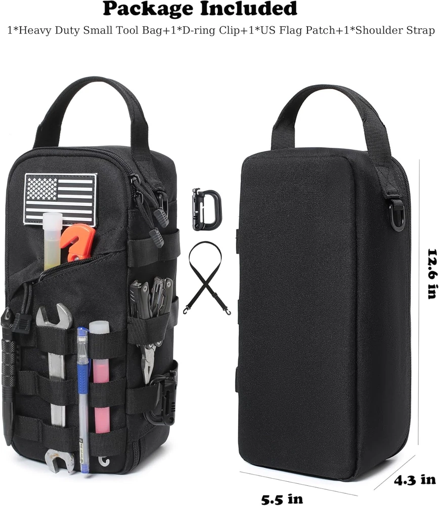 Package Included:1*Heavy Duty Small Tool Bag+1*D-ring Clip+1*US Flag Patch+1*Shoulder Strap. Size:12.6*5.5*4.3 in Partition Storage:The Small Tactical Tool Pouch features a main compartment with a front zipper pocket,a top zipper pocket and two detachable storage panels to hold your tool gadgets.Unique tactical Molle element design, cool and practical.Sturdy double zippers for the top to the sides quickly ,easily see what you have,easy access and no noise Durable and Long Lasting: Small Tactical Molle Zipper Tool Bag Pouch is made of 1000D nylon,all straps are stitched using tough to withstand strong forces and prevent tears over time. Durable and water-resistant and provide anti-scraping protection for even the most rugged user Portable Design:The compact and portable multi-purpose tool bag design is the perfect choice for beginner and professionals. The widened handle makes it easy to carry wherever you go. Convenience meets functionality in this must-have tool storage solution TACTICAL MUST HAVES:It is great tactical accessories and wonderful choice for men. The molle tool pouch can be used as tool storage box, electrician tool bag, motorcycle tool bag, art supply storage organizer, craftsman tool bag. Alternatively, use as medicine bag at home or travel Heavy Duty Small Tool Bag Pouch Portable Utility Organizer Case with Zipper Handle. Perfect for EDC, Motorcycle, Road Bike, Electricians & More