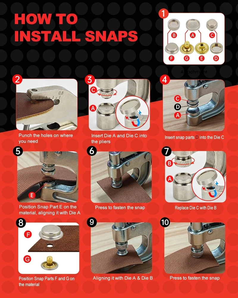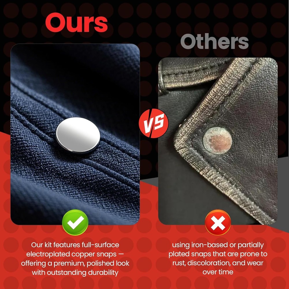 This snap button kit is a game-changer for DIY projects! The heavy-duty tool feels sturdy, and the built-in hole punch makes installation a breeze. The included snaps are high-quality and hold securely on leather and fabric. Love that it comes with everything needed—no extra purchases! Perfect for repairing bags, jackets, or crafting. Highly recommend for durability and ease of use.