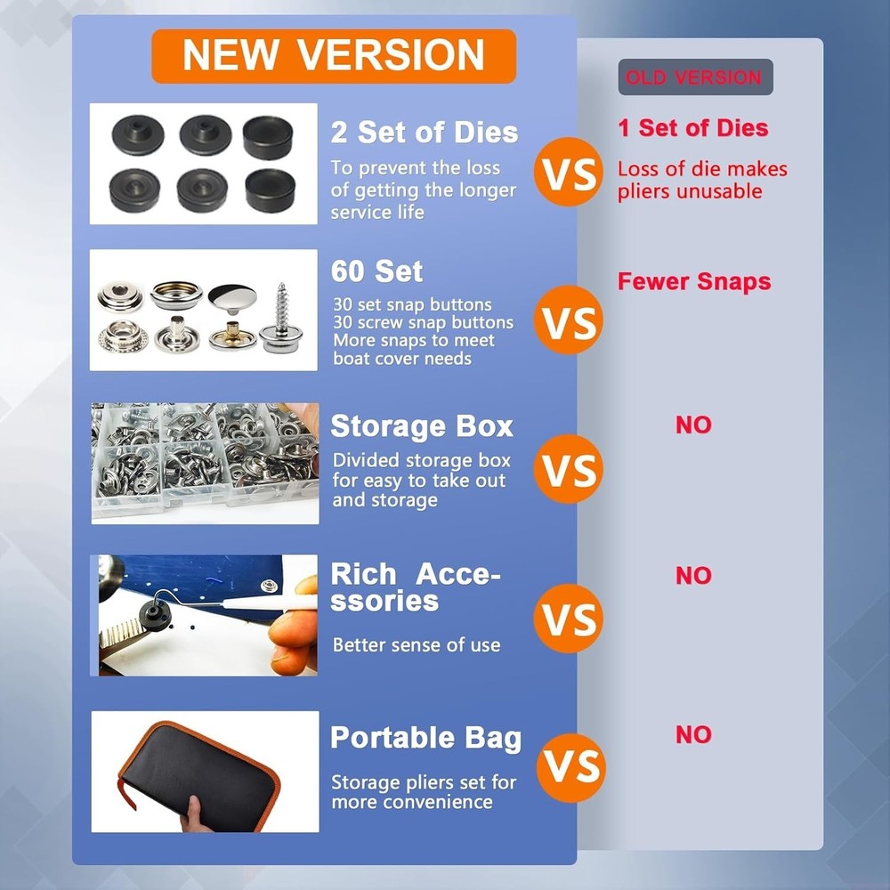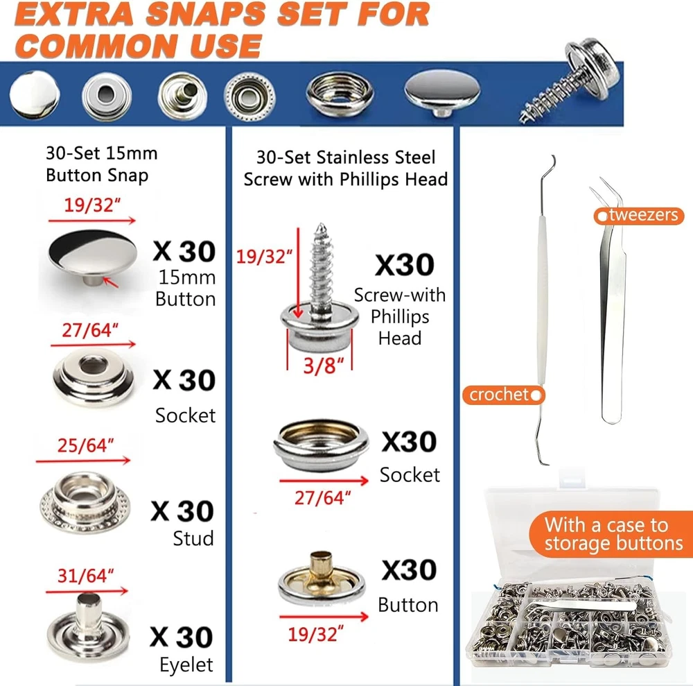 Heavy Duty Snap Fasteners Kit with Magnetic Tool for Marine & Upholstery Use ‹ › ‹ › ‹ › ‹ › ‹ › ‹ › ‹ › ‹ › ‹ › ‹ › ‹ › Heavy Duty Snap Fasteners Kit with Magnetic Tool Your ultimate solution for secure and efficient fastening, this Heavy Duty Snap Fasteners Kit is specifically designed for marine and upholstery use, combining functionality with durability. Features: Magnetic Design: Equipped with a magnetic die holder to prevent falling off when snapping, ideal for boat covers, tarps, marine canvas, furniture, and leather. Process for Quench Hardening: Crafted with surface plating to ensure anti-corrosion and rust-proof performance, this tool is sturdy and durable. Precise Welding: The die holder is aligned for accuracy, ensuring that jaws close fully for reliable fastening. Secure Closure: This upgrade snap fasteners kit guarantees a tighter snap that is not easy to fall off, utilizing dies and snap tools effectively. Complete Kit: Includes 1 snap button fastener, 3 dies, 30-set screw snap buttons, 30-set 15mm snap buttons, a crochet for punch die, a tweezer, all in a convenient carrying bag. Customer Satisfaction Guarantee: We offer a 120-Day Money-Back policy to ensure your satisfaction. Benefits: Effortless installation from punching to fastening, with no additional tools required. Comes with 60 sets of snap buttons (210 pcs) to cover all your daily fastening needs. Portable design with a carrying bag makes it easy to store and transport. Durable materials ensure long-lasting performance even in challenging environments. Efficient design provides enhanced leverage for quicker installations. Your satisfaction is highly valued; customer support is available for any inquiries. Why choose our Heavy Duty Snap Fasteners Kit? Say goodbye to unreliable fasteners and embrace the sturdy, reliable performance of our Heavy Duty Snap Fasteners Kit. Designed with a precision-engineered magnetic die holder, this kit simplifies the installation process while ensuring a tight and secure fit. Whether you're working on marine applications or upholstery, our kit provides everything you need for a seamless installation experience. Don't settle for less when it comes to your fastening needs—order your Heavy Duty Snap Fasteners Kit today and enjoy the peace of mind that comes with quality and durability! Shipping Free & Fast Shipping - We offer free shipping to most of the USA with a normal delivery time of 3-10 businessdays. However, due to various situations, additional delivery time (up to 3 weeks) may be required for some items. Alternative Carriers - We may use alternative carriers (e.g. USPS, FedEx, UPS, etc.) to ensure your package arrives safely and on time. Due to the use of multiple carriers, we are unable to provide a tracking number automatically. Handling Time - Orders are processed and shipped within 1-5 business days of receiving cleared payment. Shipping Restrictions - Shipping to Alaska, Hawaii, Puerto Rico, Guam, and other US territories may incur shipping charges or delivery restrictions. Please contact us before ordering, or your order can be refunded/cancelled. State Restrictions - There may be restrictions based on your state of purchase. For example, certain items may not be shipped to California due to state regulations. Contact for Tracking Updates - If you require tracking updates or have any concerns about the delivery of your order, please feel free to contact us, and we will be happy to assist you. Return Please see our ebay return policy. We do not accept return on most products. This is to avoid customers mis-using ebay returns. All sales are final. Please be sure to check the return policy listed at the top of the listing. In rare cases, we may accept returns, if the buyer pays both ways shipping and 20% restocking fee. If you are un-sure of return policy of a particular item, please ask before buying. Payment We accept all major credit cards, PayPal, and Apple Pay for your convenience. Your payment information is secure and encrypted to ensure a safe and seamless transaction. Please complete your payment within 3 days of purchase to avoid any delays in shipping. Feedback Your feedback is extremely important to us. We strive to provide the best products and customer service possible. If you are satisfied with your purchase, please take a moment to leave us a positive review. If you have any concerns or issues with your order, please contact us before leaving negative feedback. We are committed to resolving any problems and ensuring your satisfaction. Contact Us If you have any questions or concerns, please feel free to reach out to our customer support team. You can contact us through the eBay messaging system. We are available Monday to Friday, 9:00 am to 5:00 pm EST, and we will do our best to respond to your inquiry within 24 hours. Buy it now and enjoy a pleasant shopping experience! UPC: Not Set MPN: Not Set Unit Quantity: 60-Set Suitable For: Upholstery,Boat Covers,Tarp,Canvas,Leather,Marine Fabric,Furniture Color: Stainless Steel Material: Metal Type: Press Button Brand: Unbranded Shape: Round Unit of Sale: Mixed Lot