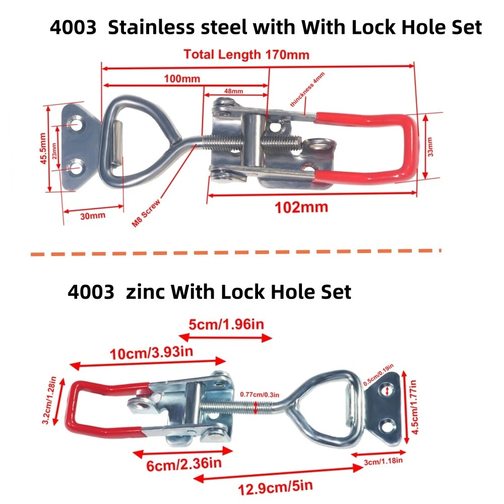 ★Feature★-------------------------------------------------------------------------------------- 1, Solid joints: compression state Anti-corrosion and anti-rust wear-resistant, sturdy and thick, with a longer service life. 2 ,Adjusting shaft: flexible adjustment, more flexible installation, easy to use. 3, Rubber handle: comfortable to hold, made of nylon rubber, non-slip and wear-resistant, safer to use. 4, Thick base: stable installation, durable and not falling off 5, complete specifications: 304 stainless steel material / iron galvanized material / you choose Complete varieties Complete size 6,Wide range of uses: outdoor activities in the wild (rocks, ice, mountains), outdoor activities or fixed fishing boats. ★Description★--------------------------------------------------------------------------------- 4003 Stainless steel with With Lock Hole Set Model: 4003 Material:Stainless steel Size: as shown 4003 zinc With Lock Hole Set Model: 4003 Material: zinc 4001 Stainless steel with 2 holes set Model :4001 Material:Stainless steel 4001 zinc with 2 holes set Model: 4001 Material: zinc Size: as shown 4002 zinc With Lock Hole Set Model: 4002 Material: zinc Size: as shown ★Package Content★--------------------------------------------------------------------------- 2/4/8 PCS Toggle Latch AS YOU CHOOSE Payment Shipping Returns Contact Us ★We accept Paypal payment only. ★We will leave a positive feedback immediately after payment is received. We appreciate a positive feedback as much as you do. If for some reason there is any issue with the purchase, please contact us prior to leaving feedback, we will be glad to work together and provide a satisfying solution. Package handling only takes 1 business day at our warehouse, so please make sure entering correct payment and shipping information before checking out. Please contact us before you open a return case,we'd offer you the best solution. Please contact us if you have any questions about the product,we're waitting to help you all the time.
