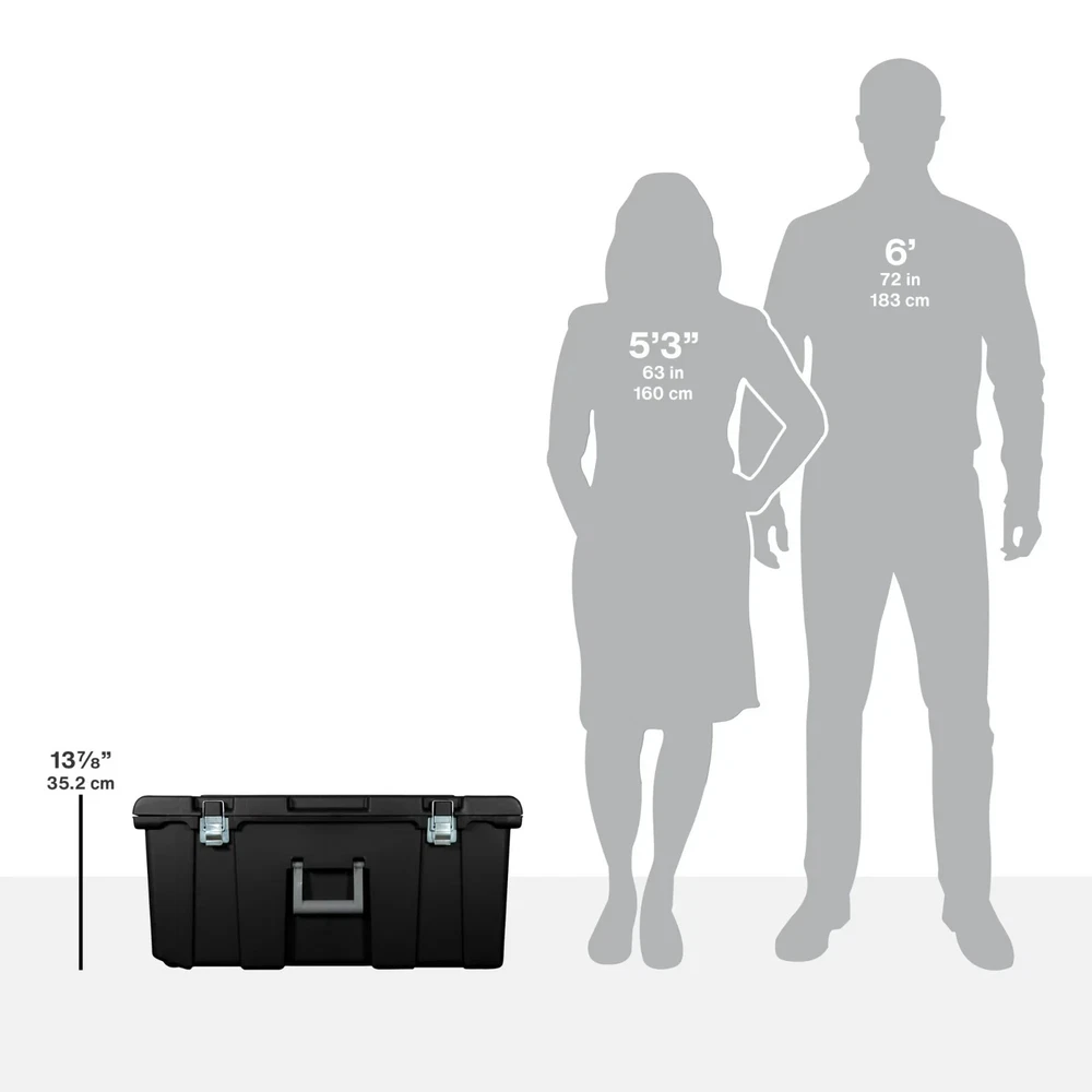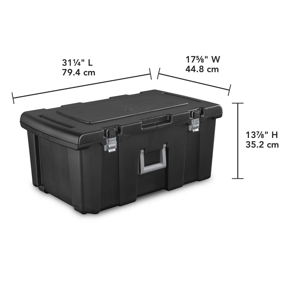 Features: Lockable, Lockable Lid, Wheels, Carry Handles, Durable Item Height: 13 7/8" H Item Length: 31 1/4" L UPC: Does Not Apply gtin13: Does Not Apply Item Width: 17 5/8" W Size: 31 1/4" L x 17 5/8" W x 13 7/8" H Room: Garage, Dorm, Bedroom, Basement Color: Black Brand: Unbranded Type: Storage Trunk / Footlocker Material: Plastic