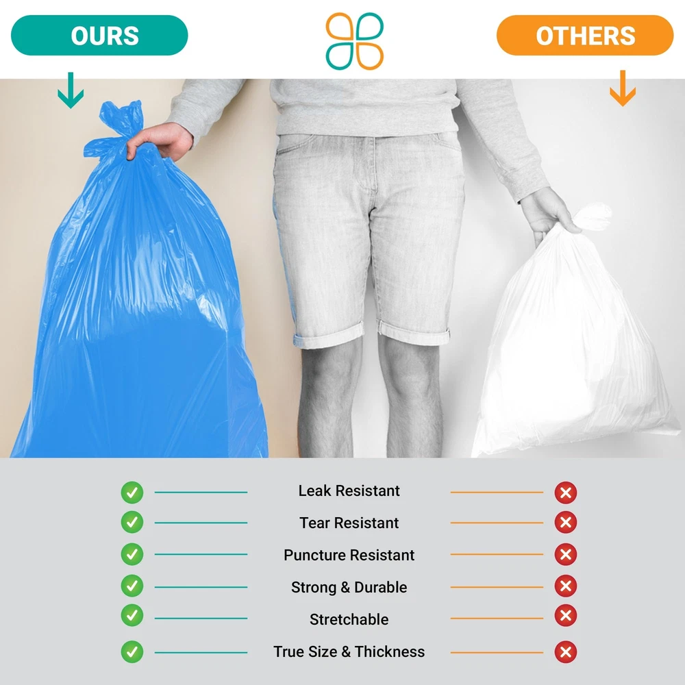 These bags pack a powerful punch. They are made with superior clear resins in the USA. Designed with you in mind, these trash can liners are 1.2 Mil Thick and durable. Forget about ripped trash bags, these bags can hold up to nearly anything. Buy the brand you can trust with quality you can count on. . "One in a Mil". Size & Fit: 12-16 gallon trash bags, measuring 24" x 31", designed to fit standard kitchen, bathroom, and office trash cans, providing an ideal everyday solution. Thick & Durable: Made from 1.2 mil low-density plastic, these bags resist punctures and tears, offering strength and reliability for handling various types of waste. Versatile Use: Suitable for kitchens, offices, backyards, and even storage. These flexible bags are perfect for both indoor and outdoor tasks, ensuring adaptability in different settings. Durable Flexibility: Designed with durability and flexibility in mind, these bags can handle various tasks while maintaining their strength and shape. Conveniently Packed: The bags are packed to ensure easy access and efficient waste management.