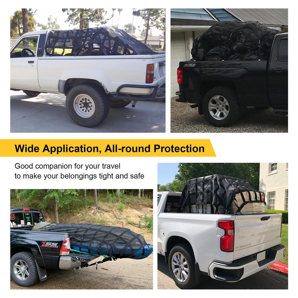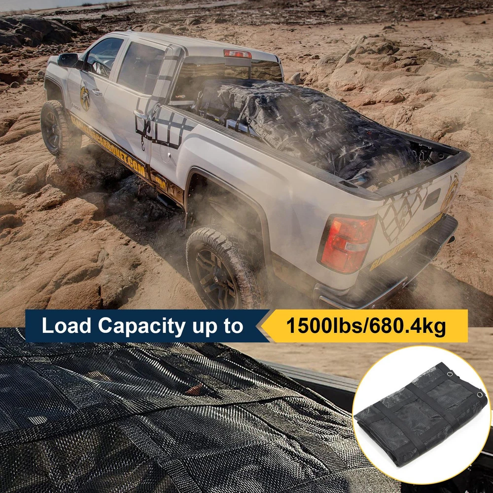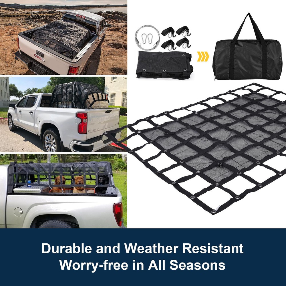 Description: Stable and Safe: With a powerful fixing ability and a multiple connection point design, our truck net ensures stable and safe goods transportation. This results in all-round protection for your cargo during transit, making it a excellent choice for maximizing delivery efficiency while maintaining cargo security Long Seive Life: Made of high-strength and weather-resistant materials, this truck net maintains excellent performance for secure cargo fixation on closed truck bases, trailers, or ships, ensuring unmatched durability and security Added Protection: Uniquely designed with a middle mesh, effectively fixes the goods while providing additional privacy protection, ensuring secure and discreet coverage Conveniently Travel: Our truck net adds convenience to travel with a ready-to-use portable storage bag. Effortlessly save space when not in use, and modernize your storage needs with this portable net solution Cargo Adaptability: Suitable for all your transportation needs, this truck net's wire ropes and carabiners provide flexible and enhanced fixing capabilities for luggage or goods. Experience versatile cargo security and peace of mind outdoors This high-quality net for truck bed is stable and safe, featuring wire ropes and carabiners. It can maintain excellent performance while providing additional privacy protection. Perfect for adding convenience to travel and securing your cargo. Specification: Product name: truck bed net Specifications: 8.75 x 10ft (267x305cm) with fixing strap Product size: about 267x305x1cm/105.12x120.08x0.39 inches Packaging size: about 42x32x16.5cm/16.54x12.6x6.5 inches Packaging weight: about 6140g/13.5lbs Stainless steel holes: 124 Fixing straps: 4 Material: webbing Packing List: Netx1 Storage bagx1 Fixing strapx4 Wire ropex1 Carabinerx2 Notes: 1. Due to different lighting and screen settings, the item color may be slightly different from the picture. 2. Due to different manual measurements, please allow a 1-2cm difference in size.