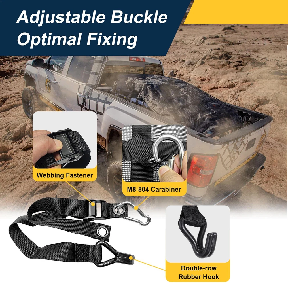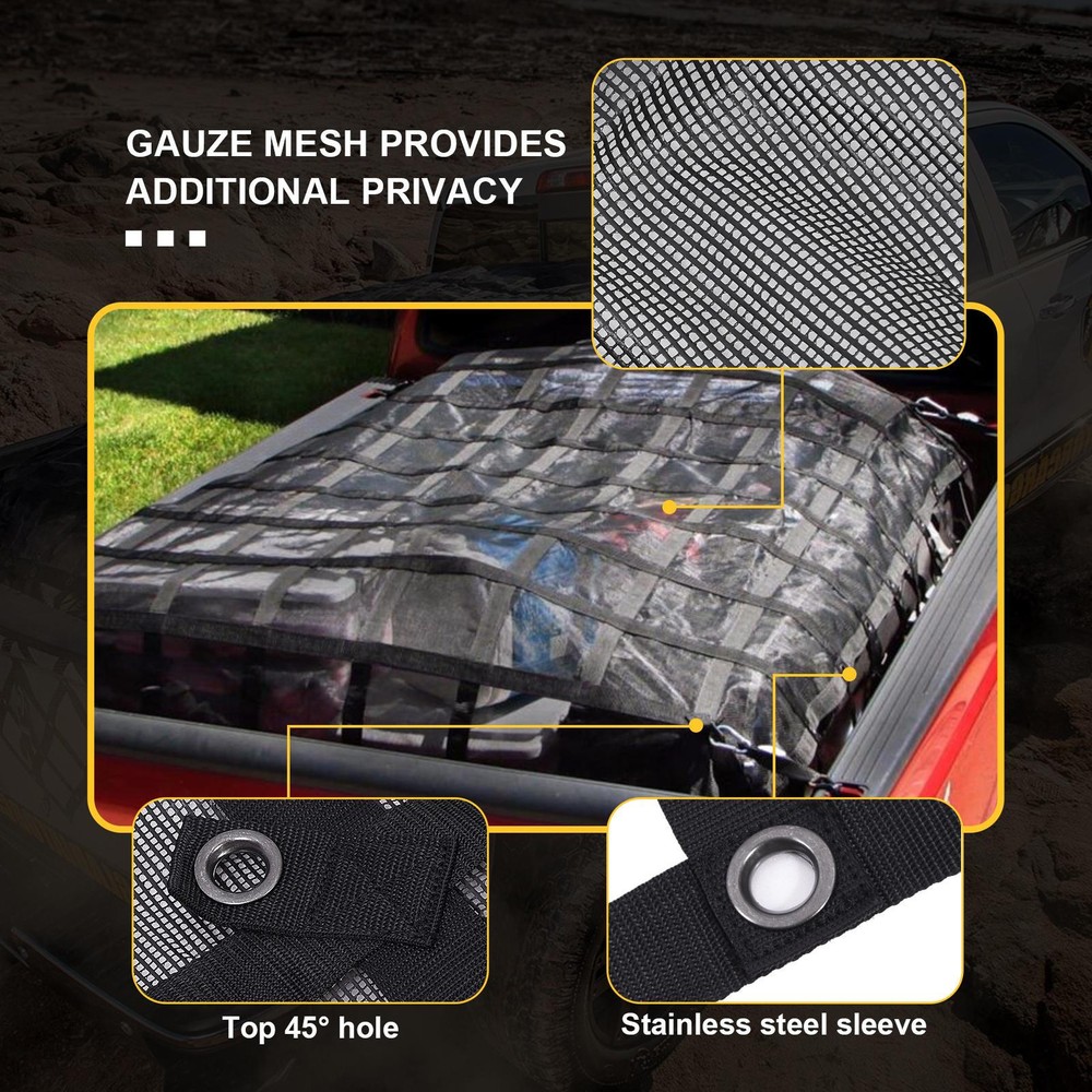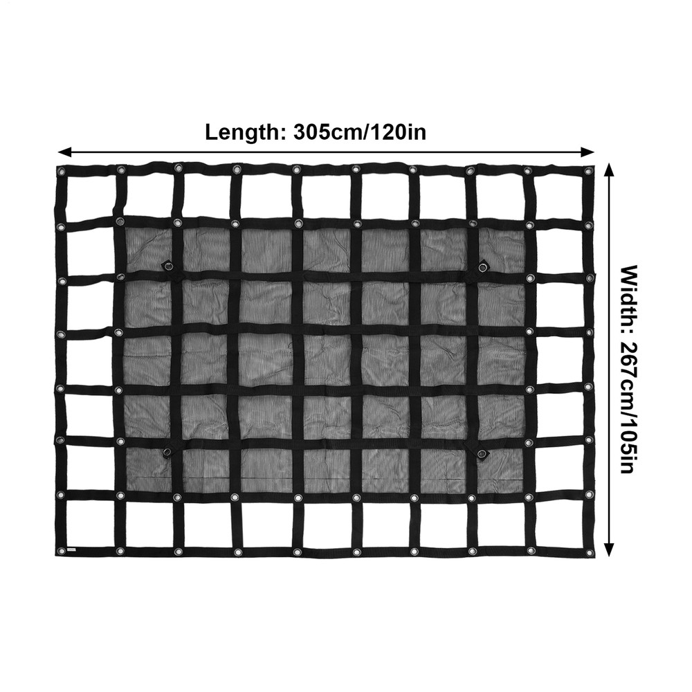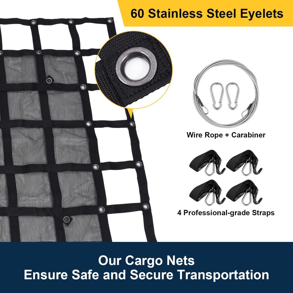 Description: Stable and Safe: With a powerful fixing ability and a multiple connection point design, our truck net ensures stable and safe goods transportation. This results in all-round protection for your cargo during transit, making it a excellent choice for maximizing delivery efficiency while maintaining cargo security Long Seive Life: Made of high-strength and weather-resistant materials, this truck net maintains excellent performance for secure cargo fixation on closed truck bases, trailers, or ships, ensuring unmatched durability and security Added Protection: Uniquely designed with a middle mesh, effectively fixes the goods while providing additional privacy protection, ensuring secure and discreet coverage Conveniently Travel: Our truck net adds convenience to travel with a ready-to-use portable storage bag. Effortlessly save space when not in use, and modernize your storage needs with this portable net solution Cargo Adaptability: Suitable for all your transportation needs, this truck net's wire ropes and carabiners provide flexible and enhanced fixing capabilities for luggage or goods. Experience versatile cargo security and peace of mind outdoors This high-quality net for truck bed is stable and safe, featuring wire ropes and carabiners. It can maintain excellent performance while providing additional privacy protection. Perfect for adding convenience to travel and securing your cargo. Specification: Product name: truck bed net Specifications: 8.75 x 10ft (267x305cm) with fixing strap Product size: about 267x305x1cm/105.12x120.08x0.39 inches Packaging size: about 42x32x16.5cm/16.54x12.6x6.5 inches Packaging weight: about 6140g/13.5lbs Stainless steel holes: 124 Fixing straps: 4 Material: webbing Packing List: Netx1 Storage bagx1 Fixing strapx4 Wire ropex1 Carabinerx2 Notes: 1. Due to different lighting and screen settings, the item color may be slightly different from the picture. 2. Due to different manual measurements, please allow a 1-2cm difference in size.
