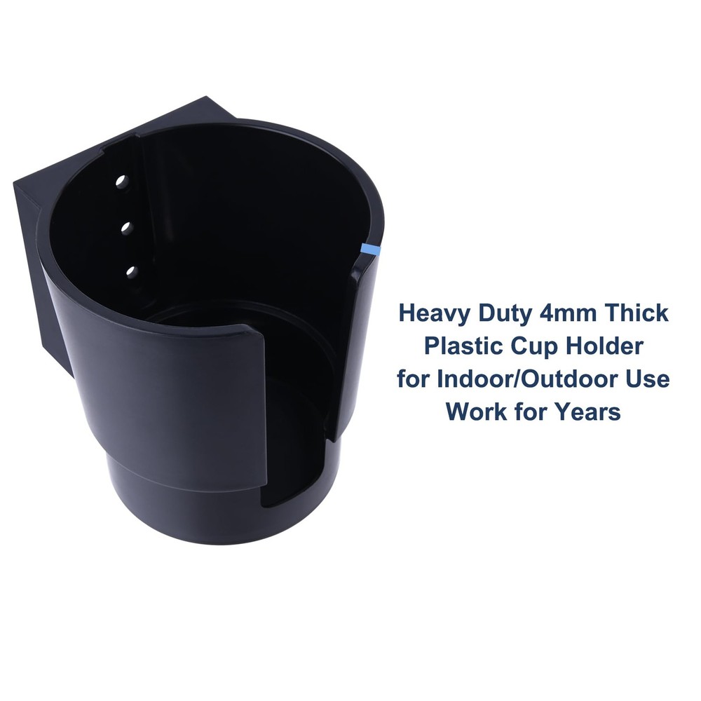 Package includes: 1*plastic cup holder Fit Various Bottles and Cups: With a top diameter of 3.7 inches and a bottom diameter of 3.2 inches, this drink holder is ideal for most cups, bottles, cans, and tumblers, including popular 20 oz, 30 oz, and 40 oz sizes. Versatile Mounting Options: Designed for both horizontal and vertical mounting, this cup holder adapts to your needs. Whether it's a wall, vehicle, or any surface, it's easy to install and secure. Sturdy and Reliable: Made from 4mm thick premium ABS material, this heavy-duty cup holder is built to last. It holds drinks of varying weights with ease, making it a dependable choice for any setting. Rustproof: Crafted with 304 stainless steel screws, the cup holder resists rust, making it perfect for indoor and outdoor use. Ideal for boats, cars, RVs, tractors, wood swing, and more. Easy Installation: Includes one sturdy plastic cup holder and 2 types of stainless steel screws for mounting on wall, wood, or plastic surfaces. With pre-drilled holes, installation is quick and hassle-free.