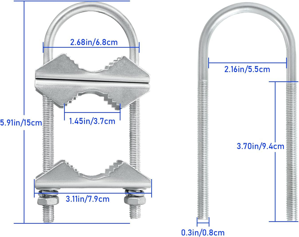 Store New Arrivals Add to Favorite View Feedback Contact Double Antenna Mast Clamp V Jaw Block with U Bolts, Heavy Duty Mast to Mast Description Item dimensions L x W x H 6 x 3 x 2 inches Color Silver Material Zinc-plated Iron Style 2 PCS Item Weight 0.25 Kilograms Product Dimensions 6 x 3 x 2 inches Nice Heavy Duty Clamps: The mast clamps are made of zinc-plated iron with anti-rust coating finish, prevent rusting in outdoor rainwater. The V-jaw brackets are what makes the assembly so good and secure in bad weather. Using the V jam brackets with U-bolt, the clamp kit can securely hold pipes and antenna tight in place, will not budge in the wind. Dimension: Support pipe with diameter raging from 0.98” to 2.1”/24mm-54mm The mast clamps are suitable to mount an antenna on a pipe/ pole, or attach one pipe to another pipe to mount an outdoor antenna. Quality hardware to connect 2 different sizes of pipe together. Package Includes: 2 sets antenna mast clamps (6pcs jaw brackets, 2pcs U bots, 4pcs nuts, 8pcs washers) Product Description Nice heavy duty Antenna mounting hardware! Quality hardware to connect 2 different sizes of pipe together. The V-jaw brackets are what makes the assembly so good and secure in bad weather. The double mast brackets handled two mast well, spaced to support the height and weight of the antenna/load. The antenna mast pole worked very well to join two pipes together when erecting satellite dish on a flag pole. Package Includes: 2 sets antenna mast clamps (6pcs jaw brackets, 2pcs U bots, 4pcs nuts, 8pcs washers) ABOUT US We offer the best prices around on high quality products. Our E-store includes media such as books, movies, music and games while offering electronics, toys, sporting apparel, clothing, tools, general home, garden items and more. SHIPPING We are always working hard to ensure your package arrives as soon as possible. Please understand that some factors like weather, high postal traffic, and the performance of shipping companies are outside of our control. We offer free shipping to the lower 48 states and ship within 2 business days of payment, usually sooner. We do not accept P.O. Boxes. Please provide a physical address. RETURNS We offer a 30-Day Return Policy on items which you are not completely satisfied with. You have the option for a full-refund or an exchange of the item. No returns are available on items shipped outside of the USA. PAYMENT We accept PayPal. CONTACT US This page content is yet to come Please ad us to your favorite seller and visit again later Thank You CUSTOMER SATISFACTION We try our very best to make sure every customer is completely satisfied. If there's a problem, message us! We're happy to help.
