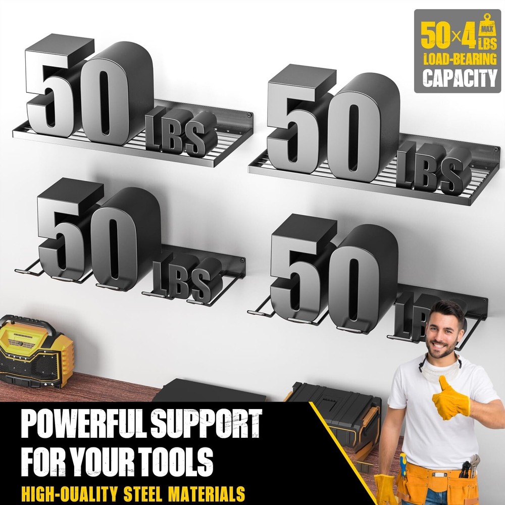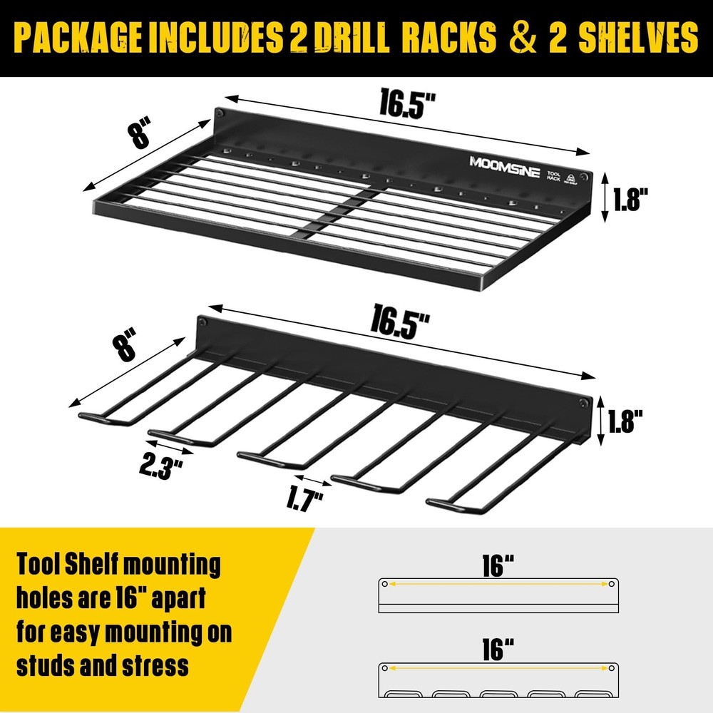 Power Tool Organizer Wall Mount, Heavy Duty Tool Organizers and Storage, Cordless Drill Holder and Battery Shelf, Metal Storage Rack for Garage Organization (Drill 2 racks & 2 shelves) Product Details Size: Drill 2 racks & 2 shelves Brand: MOOMSINE MPN: DH UPC: Does not apply EAN: Does not apply Material: Metal Color: Yellow Special Feature: Rust Resistant Product Dimensions: 8"D x 16.5"W x 1.8"H Shelf Type: Bracket Shelf Material: Metal Color: Yellow Special Feature: Rust Resistant Product Dimensions: 8"D x 16.5"W x 1.8"H Shelf Type: Bracket Shelf Number of Shelves: 2 Room Type: Garage Finish Type: Metal,Polished Finish,Steel Assembly Required: Yes Mounting Type: Wall Mount Recommended Uses For Product: Tools Included Components: Hardware Item Weight: 7 Pounds Brand: MOOMSINE Style: tool Manufacturer: MOOMSINE Part Number: DH Item Weight: 7 pounds Country of Origin: China Item model number: DH Size: Drill 2 racks & 2 shelves Finish: Metal,Polished Finish,Steel Special Features: Rust Resistant Batteries Included?: No Batteries Required?: No Date First Available: October 19, 2022 8 Drill Holder Slots & 2 shelves:Transform wasted wall space into a compact and efficient storage and display area for power and hand tools.This power tool organizer helps you keep all your frequently used project tools organized, save space and control clutter HEAVY DUTY:This cordless tool holder is made of heavy compact steel metal, and the joint of the shelf uses a reinforced design. With plenty of load-bearing testing, our storage rack can hold your power tools of any weight EASY TO INSTALL: No assembly required! Mounting hardware is included DURABLE CRAFTSMANSHIP: With high temperature matte spray paint and polished finish, our power tool holder are resistant to rust and corrosion, scratch-resistant, durable and smooth, which has a lifespan of usage decades EXCELLENT CUSTOMER SERVICE:If you are not satisfied with your purchase, please contact us at any time. The customer service team will reply and resolve your issue within 12 hours