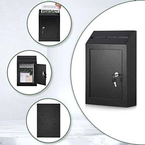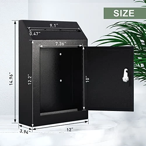Return Policy Fast Delivery Trusted seller Wall-Mount Mailbox,Heavy Duty Deposit Drop Box, Locking Metal Key Drop Box Suggestion Box with Key Lock,Secured Safe Storage Box Postbox for Home&Business Use,15x12x4 Inch,Black Product Description 【DURABLE MATERIAL】- ’s Drop Box is made of powder-coated heavy-duty steel to ensure durability and long life, and provide high-security protection and safe storage for your mails. The black textured surface is not only scratch-resistant and modern as well as beautiful. 【PLENTY OF STORAGE SPACE】- The safe storage box measures 15(H)x12(L)x4(W) inches, offering plenty of storage space for your emails, documents, letters, etc. The size of the opening slot is 9.1x0.47 inches. 【SAFETY STORAGE】 - The mailbox is designed to prevent fishing with a jagged metal baffle inside. It comes with 2 keys and a secure latch that can keep your letters in a safe space. 【MULTI PURPOSE USE】-Not only can this drop box be hung under a porch as a mailbox, but it can also be hung in a conference room or placed on a conference table as a suggestion box. 【EASY TO INSTALL】- wall-mounted mailbox package includes mounting hardware and detailed instruction for convenient installation. It can be easily installed on the wall, suitable for commercial and residential purposes. 【EXCELLENT AFTER-SALES SERVICE】-After receiving the package, please carefully check whether the package is in good condition and the hardware complete. If hardware is missing or the product is damaged during transportation, please feel free to contact us and give us a chance to solve it for you. We are glad and committed to giving you a perfect shopping experience. Shipping Returns Payment Shipping Shipping is FREE to all addresses other than APO/PO boxes in the lower 48 states. All our stock ships from US-based warehouses. Shipped via USPS or UPS (depending on location and package weight) Unless stated otherwise, all orders will ship within 24-72 hours of your payment being processed. Check our feedback to see the great reviews of FAST shipping we offer. Returns Seller does not accept returns Payment We currently accept payment via eBay managed payments only. Once payment is cleared, we will dispatch your shipment within 1-3 business days. Please refer to the "Shipping" tab for more information regarding shipping speed to your destination.