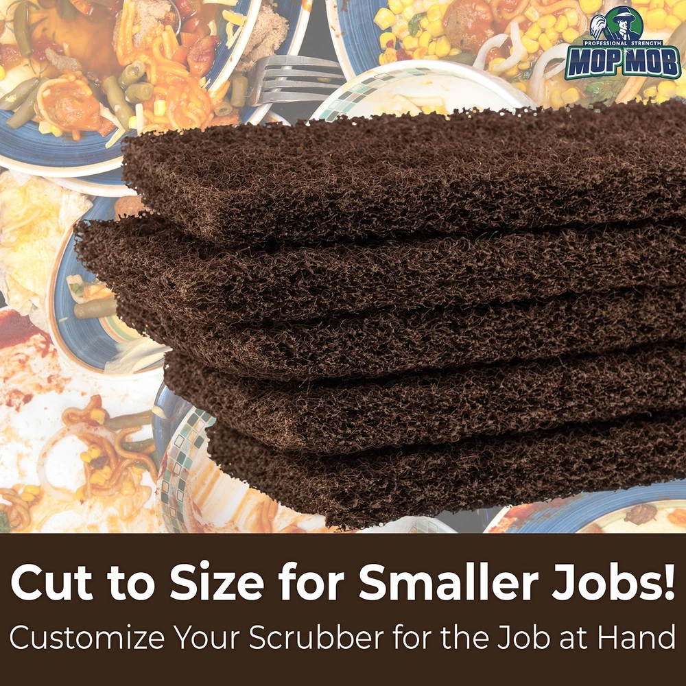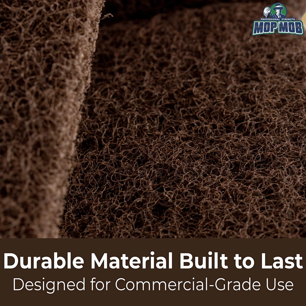 Heavy Duty Brown Scouring Pads Fight Aggressive Messes with Abrasive Cleaning Power! These pro-grade scrubbing pads provide maximum cleaning power with woven nylon designed to scour the toughest messes. These pads are great for home and commercial use for even the most demanding janitorial jobs. Use alone or with a pad holder. Fight Dirt, Grime and Stains With Ultra-Strong Abrasive Power. Our scouring pads are made with coarse nylon specialized for aggressive cleaning. These pads will combat lime scales, rust, mineral deposits, soap scum and stubborn grease, food residue and dirt. Just add a little elbow grease to make any surface spick and span. Great for Any Hard Surface, Commercial or At Home. Use on vinyl, tile, acrylic, steel grill ranges and other nonporous materials. Great for use at home and commercial settings like restaurant kitchens, bathrooms and common areas. Built to Work Harder, Longer. Our scourers are built to last. Other pads' fibers shred, disintegrate and knot, resulting in an inconsistent clean. Our scrubbing pads are designed to last longer and clean better than competitors' products. Cut to Size or Use With a Universal Pad Holder. These scour pads fit universal handles for cleaning floors. You can also cut the pad into smaller, hand-sized pieces for washing dishes and cleaning counters and hard-to-reach spaces. Get the most cleaning power out of your pads by customizing the size for each job. What’s in the Box? This pack includes 5 - 10" x 4 1/2" brown heavy-duty scouring pads. Each pad is 3/4 inches thick. Satisfaction Assured for Life! If you aren’t completely satisfied with your order, simply email us, and we will respond within 24 hours to make it right even on the weekends. We absolutely assure your satisfaction! HEAVY DUTY TO FIGHT TOUGH GRIME. Our scouring pads are designed to combat aggressive messes. Whether you're scrubbing burnt food off a stove or soap scum off a shower wall, these will get the job done MULTI-PURPOSE PAD CLEANS ANY HARD SURFACE. Use these scourers on vinyl, tile, steel and other hard surfaces. Strong yet flexible to access tight corners, and tough enough for home and commercial use. GUARANTEED FOR LIFE. We offer a No-Nonsense Lifetime Satisfaction Guarantee on all of our cleaning pads. If at any point you're not 100% happy, just send us an email, and we promise to make it right! ULTRA DURABLE MATERIAL BUILT TO LAST. While other scour sponges can wear out quickly, our nylon scrubbing pads are designed for durability and provide consistent cleaning power even after many uses EASILY CUT TO SIZE FOR ANY JOB! These 10" x 4.5" pads fit universal scrubbing pad holders for cleaning floors, but are also easy to cut into customizable, hand-sized sponges. Get more out of each pad!
