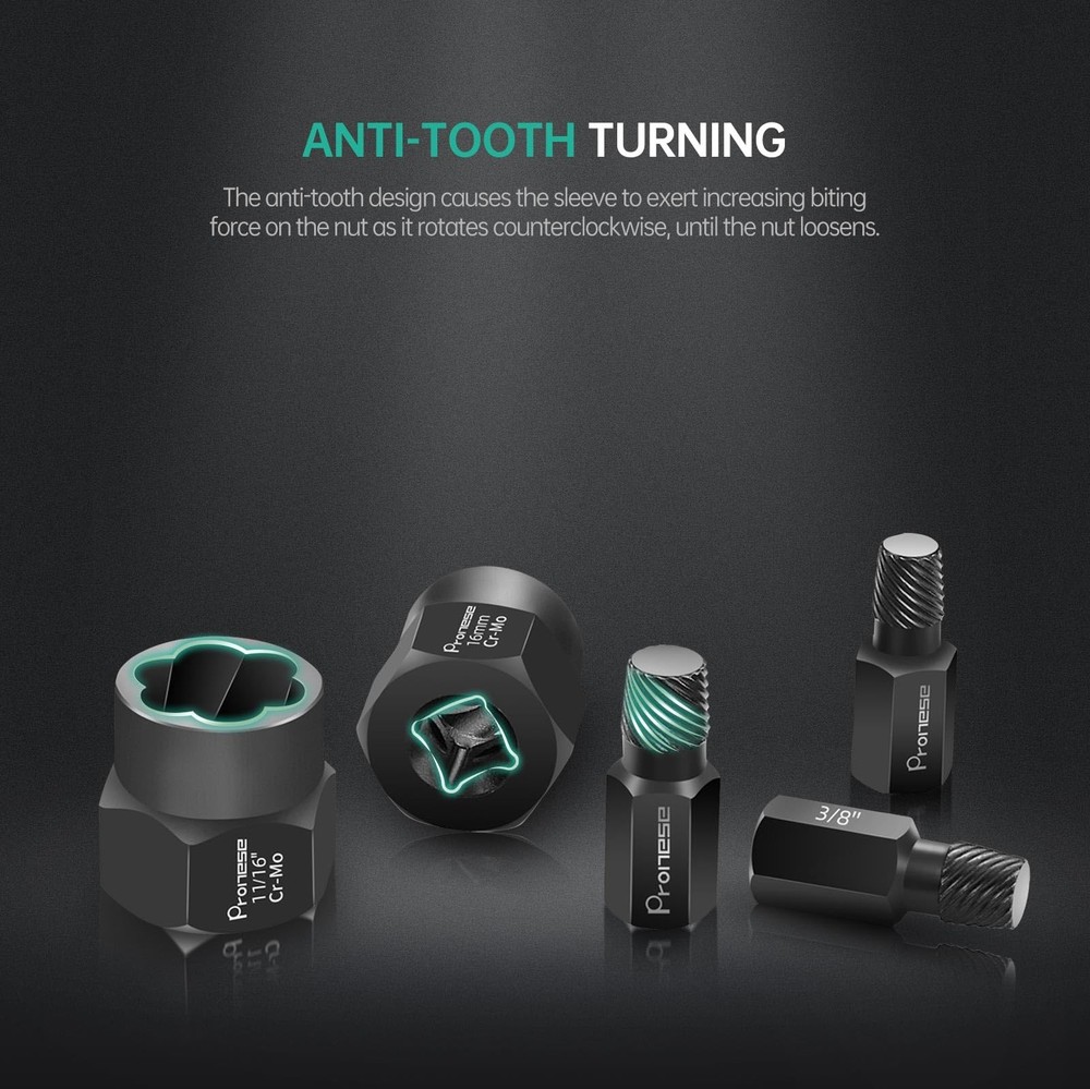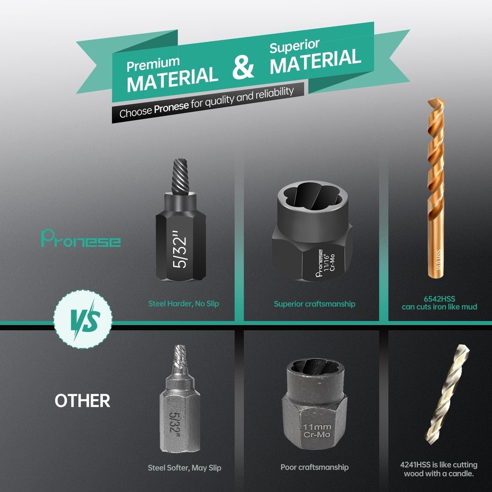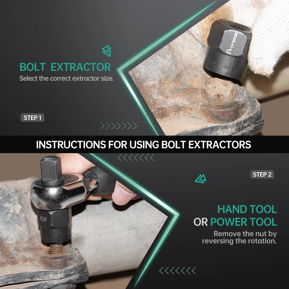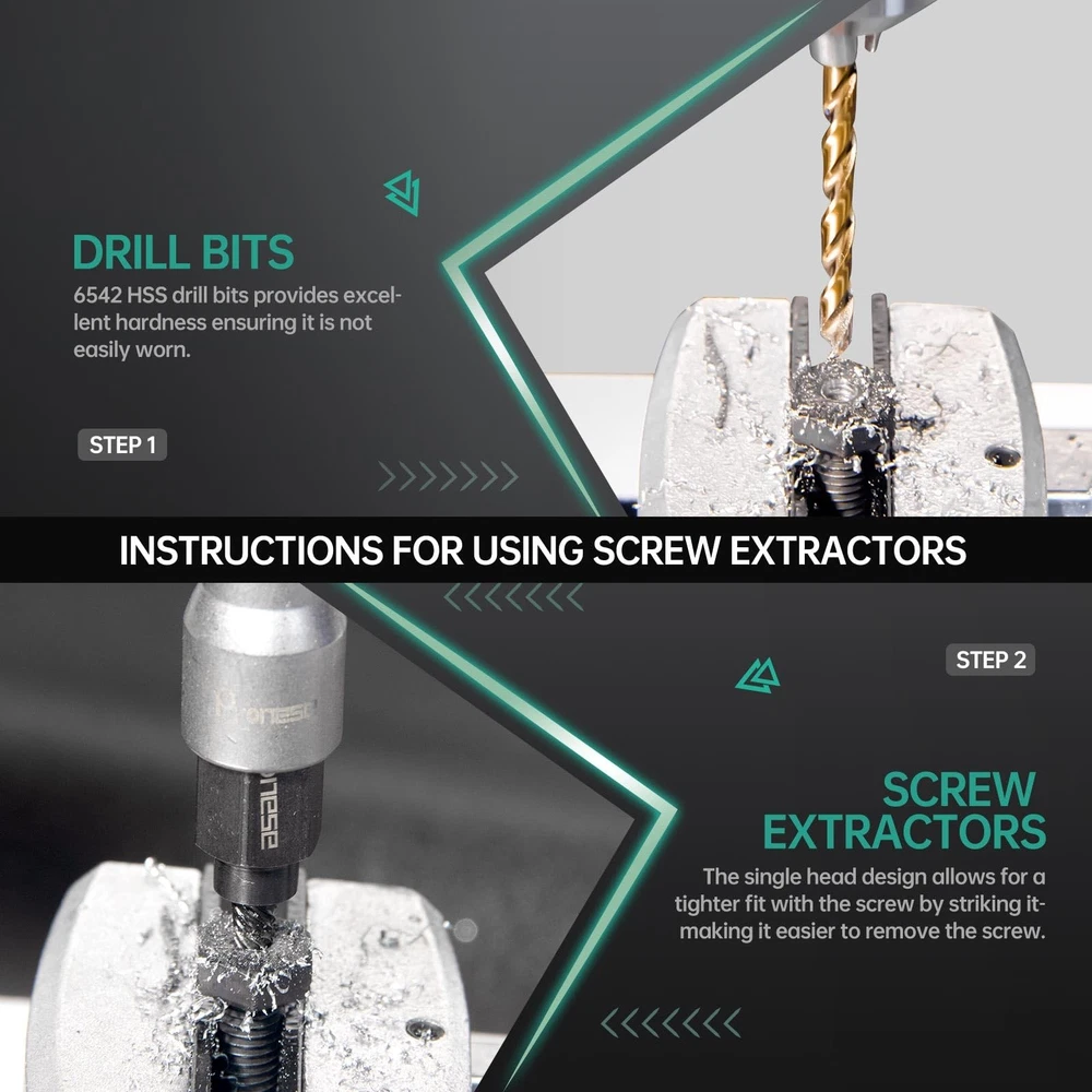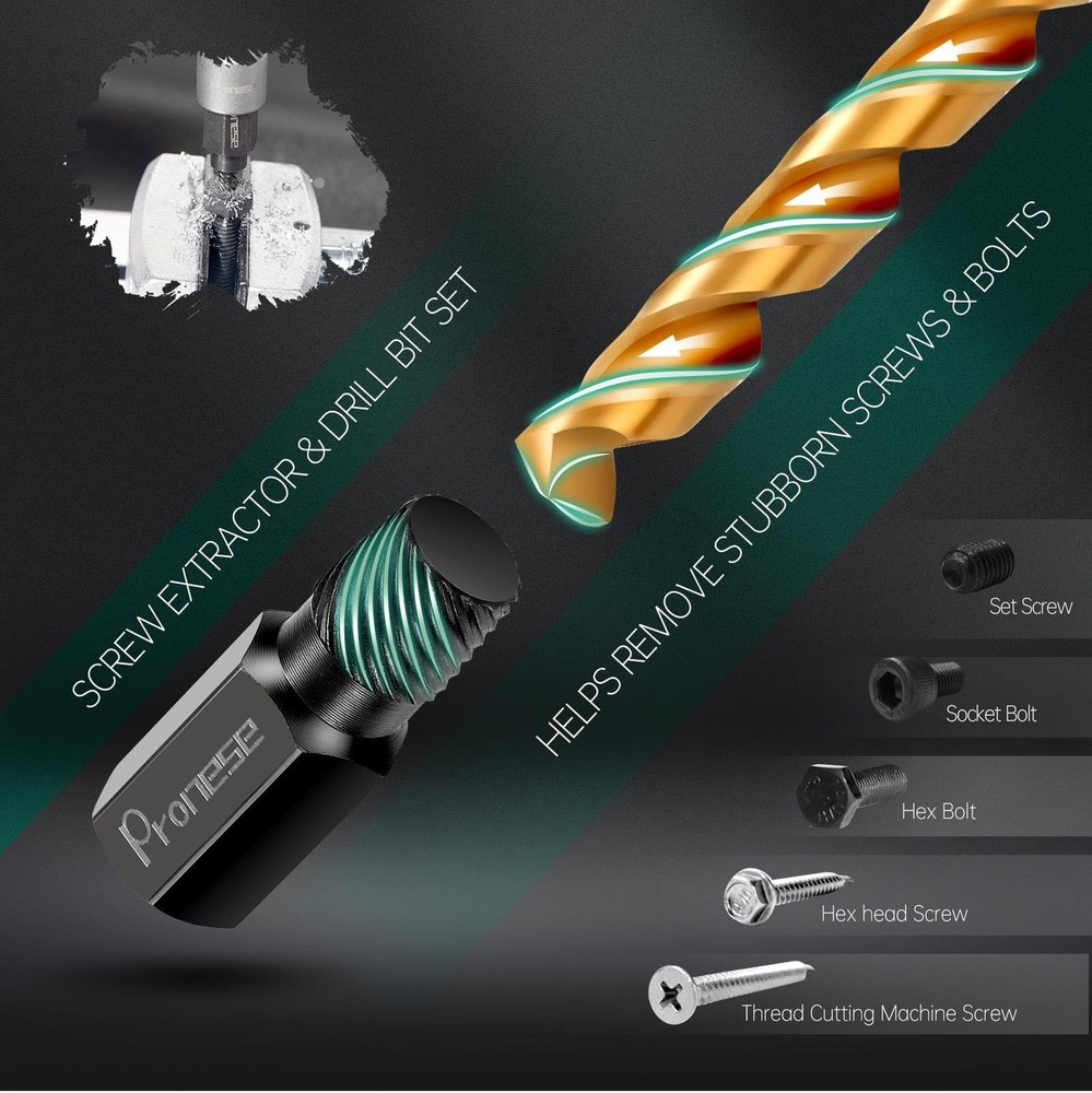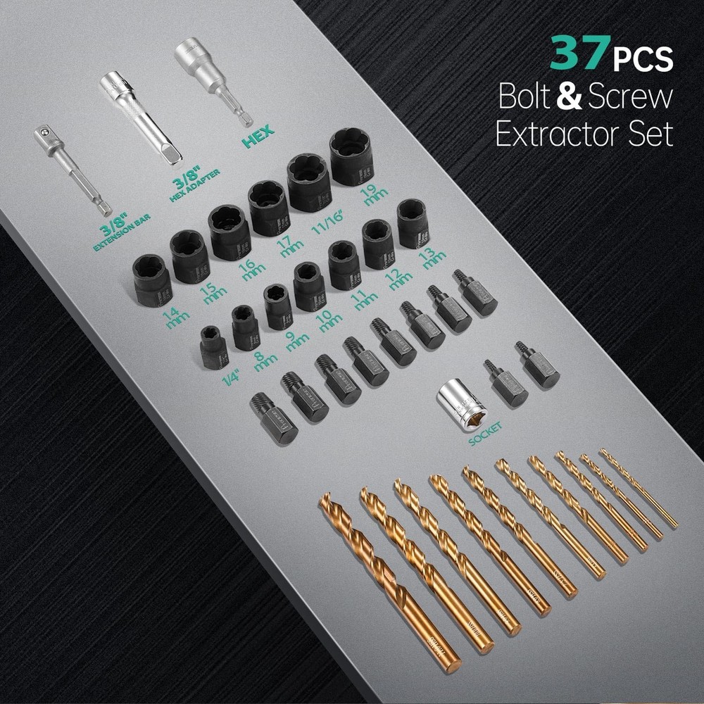 [More commonly used combinations] We have selected 13 pcs the most commonly used 3/8 inch bolt extractors, including the common 1/4''~19mm in industrial, auto repair and DIY.We also select 10 pcs easy out screw extractor set with 10 drills, which can solve the problem of removing headless screws, and also supplement the problem of removing smaller sized bolts. To make it even easier to use, we have added 2 pcs HEX adapters and 2 pcs socket adapters. [CR-MO STEEL AND 6542 HSS] The 13pcs broken bolt extractor kit and 10pcs stripped screw extractor are both made of high strength chromium-molybdenum steel, which is much stronger and more wear resistant than Cr-V steel. 6542HSS is sharp as a tack, and remains sharp even after drilling multiple holes. [Heavy duty Design] Both the easy out bolt extractor set and screw extractor kit are heavy duty design, the outer wall of the bolt extractor is thickened and the screw extractor is heat-treated to strengthen the surface hardness and release the internal stresses, making them more reliable. [WIDE APPLICATION] 13pcs ez out bolt extractor is commonly used for threaded fasteners with certain protruding parts, such as HEX bolt, Socket bolt, HEX screw; stripped screw removal tool can be used for Set Screw, thread cutting machine screw, but need to drill holes first, and then use the right size screw extractor, it is recommended to use a large size screw extractor first. [Easy To Use] All products are neatly lined up in the storage box, while the box and products are clearly printed with size or markings. Convenient to pick up and store, saving your time.