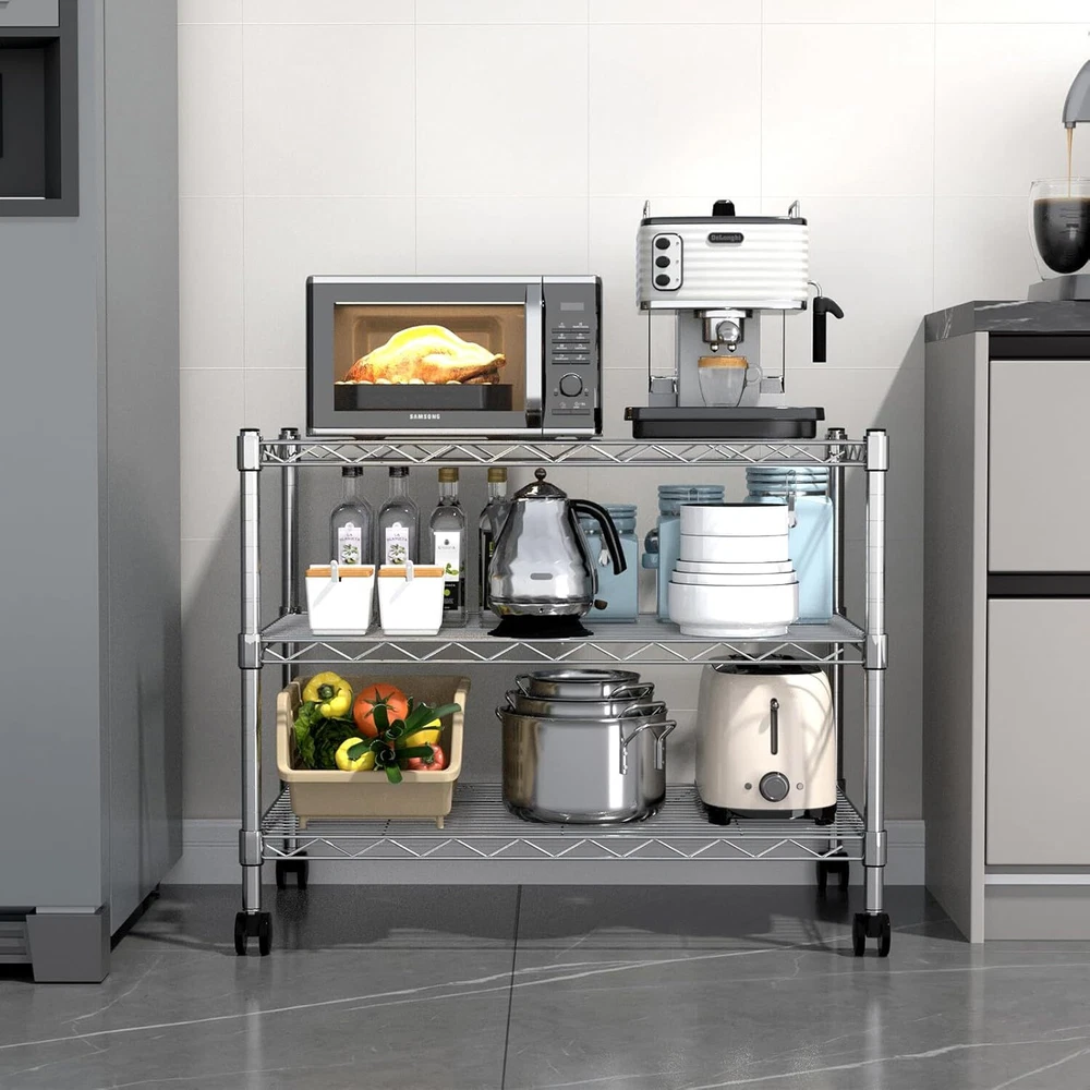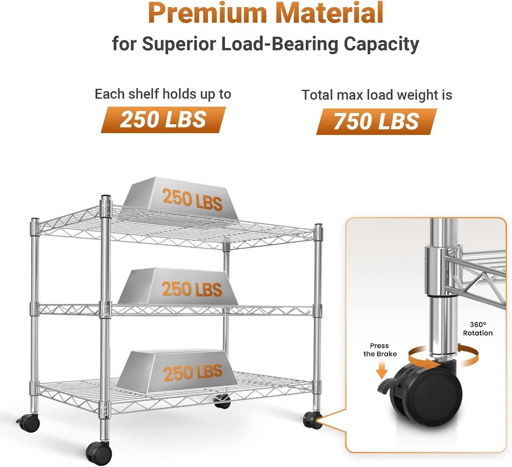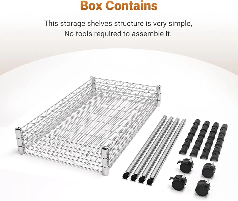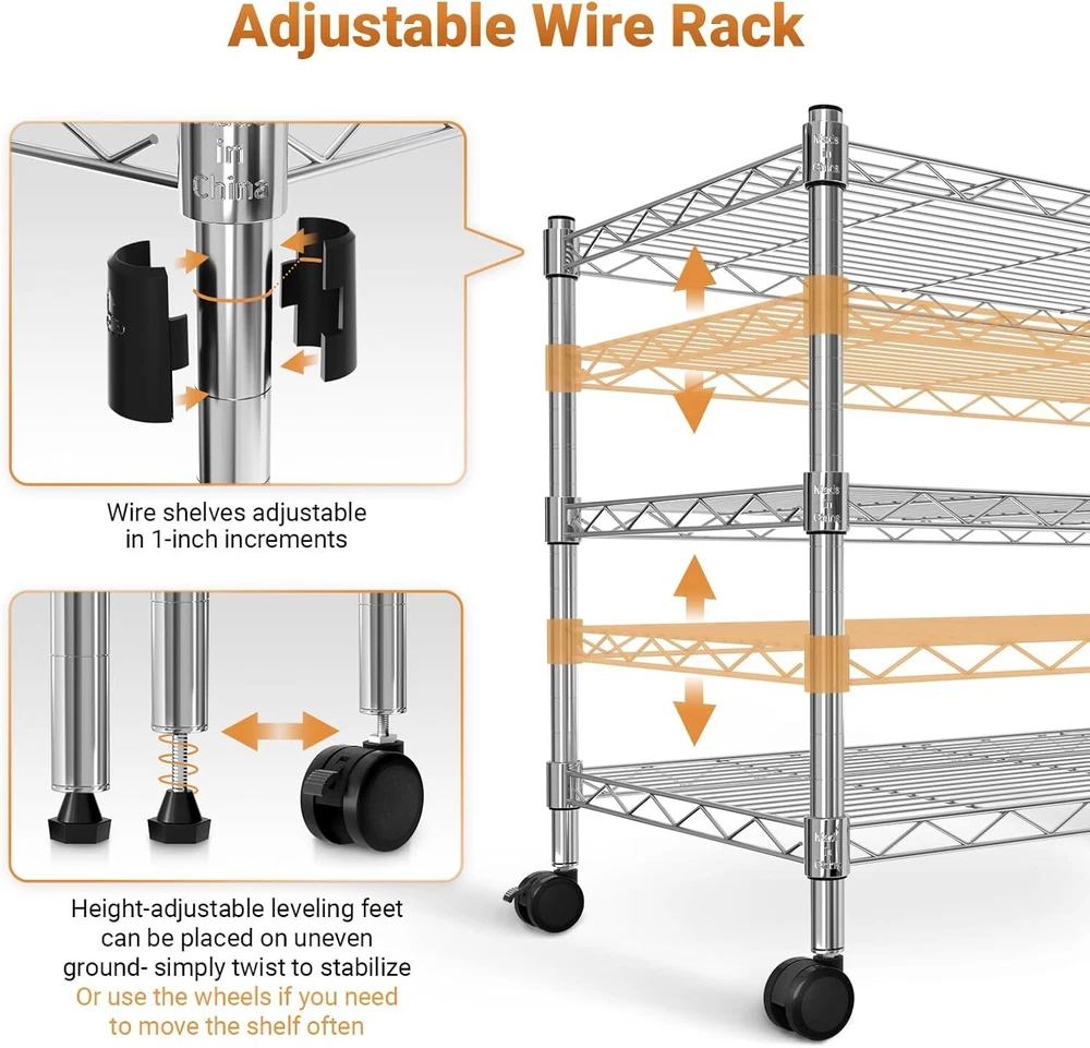 From the manufacturer Heavy Duty Metal Storage Shelving Rack Stylish wire shelving unit provide vertical space and occupy a little space, which helps keep your house tidy and orderly. Shelving unit offers remarkable strength, convenience and versatility. It is a household essential and space saver for kitchen, bedroom, bathroom, laundry room, garage, basement, office and more living space. Features: √ Easy to assemble, no tools needed. √ Sturdy metal construction, large load-bearing capacity . √ Adjustable shelving height, customize height for different things. √ Adjustable leveling feet Organize your home or office with the Shelving system. These compact shelves are perfect for adding extra storage around the house, tidying garages, and organizing office spaces. 1-Tier Shelf 3-Tier Shelf 3-Tier Shelf Taller 4-Tier Shelf 4-Tier Shelf Wider 5-Tier Shelf Add to Cart Add to Cart Add to Cart Add to Cart Add to Cart Add to Cart Customer Reviews 4.5 out of 5 stars 1,467 4.5 out of 5 stars 1,025 4.5 out of 5 stars 360 4.5 out of 5 stars 145 4.4 out of 5 stars 1,258 4.5 out of 5 stars 3,620 Price $26.99 $ 26 . 99 $36.99 $ 36 . 99 $39.99 $ 39 . 99 $59.99 $ 59 . 99 $62.99 $ 62 . 99 $74.99 $ 74 . 99 Dimension 30" L x 14" W x 15" H 23" L x 13" W x 20" H 23" L x 13" W x 30" H 36'' L x14'' W x 54'' H 35'' L x 18'' W x 61'' H 36'' L x10'' W x 70'' H Color Chrome Chrome Chrome Chrome Chrome Chrome Max load-bearing 250 lb 750 lb 750 lb 1000 lb 1400 lb 1750 lb Wheels none ✓ ✓ ✓ ✓ ✓ 3-Tier Shelf 4-Tier Shelf 5-Tier Shelf 6-Tier Shelf Corner Display Rack Shoe Shelf Storage Add to Cart Add to Cart Add to Cart Add to Cart Add to Cart Add to Cart Customer Reviews 4.4 out of 5 stars 712 4.4 out of 5 stars 1,258 4.4 out of 5 stars 205 4.2 out of 5 stars 26 4.8 out of 5 stars 28 4.0 out of 5 stars 294 Price $41.99 $ 41 . 99 $55.99 $ 55 . 99 $61.99 $ 61 . 99 $79.99 $ 79 . 99 $61.26 $ 61 . 26 $13.84 $ 13 . 84 Dimension 23" L x 13" W x 30" H 36''L x14''W x 54''H 36''L X 14''W X 60''H 29" L x 14" W x 70" H 13" D x 19" W x 43" H 24.5” L x 7.5” W x 24.5” H Color Black Black Black Black Black Black Max load-bearing 750 lb 1000 lb 1250 lb 1056 lb / / Wheels ✓ ✓ ✓ ✓ Product Description Organize your home or office with YSSOA' Shelving system. These compact shelves are perfect for adding extra storage around the house, tidying garages, and organizing office spaces. On Oct 14, 2024 at 03:11:02 PDT, seller added the following information: On Nov 21, 2024 at 23:13:15 PST, seller added the following information: