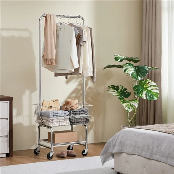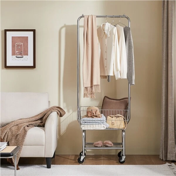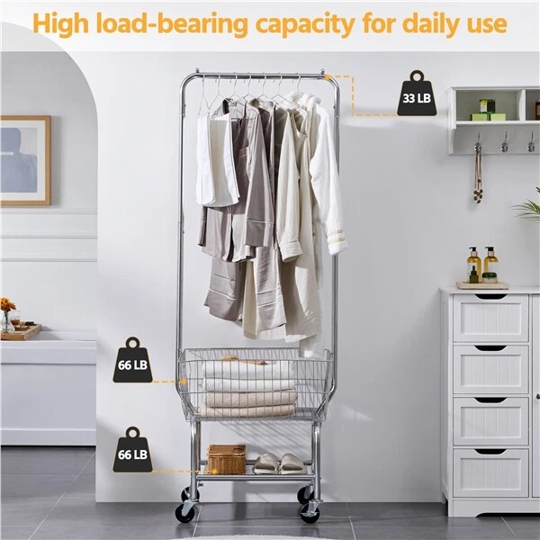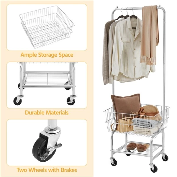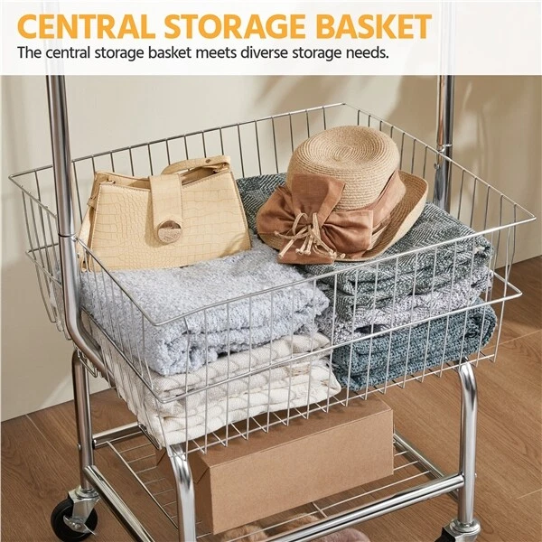 Heavy duty Garment Organizer Laundry Cart With Storage Basket Double Pole Rack