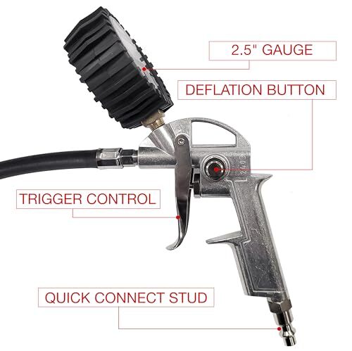 Featuring a normally closed air chuck, the Tire Inflation Gun is a perfect complement to any onboard air systems and VIAIR’s line of “Portable Automatic” compressors. Comes with a deluxe carry bag, available in with a Digital gauge, or analog versions with 160 or 200 PSI gauges. Tire Inflation gun with 2.5" white face gauge, includes protective rubber boot on the gauge for better durability. Reads up to 200PSI or 14 BAR Integrated bleeder valve for pressure adjustment 12 inch Rubber Air hose with a clamp on tire chuck. Standard industrial size quick connect stud pre-installed Folding lever air chuck Deluxe storage bag included