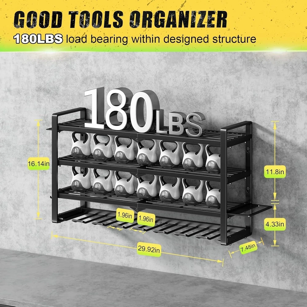 Power Tool Wall Mount - 180Lbs Load 4 Layers Storage Rack with 8 Drill Holders for Drills Cordless Tools. Heavy Duty Iron Garage Tool Storage for Workshop Shed Pegboard Basement 180 lbs Load: The 4 tier tool organizer wall mount is made of heavy compact steel metal for greater weight capacity and durability. After load-bearing testing, the utility racks can support up to 180 pounds on sturdy walls. Easy to Install: Our power tool organizer wall mount includes all necessary mounting hardware and clear instructions for easy installation. refer to the professional installation manual, you can assemble a perfect tool rack wall mount in just a few minutes. Heavy Duty Steel Construction: The power tool organizer is constructed from a high quality powder-coated alloy steel, Its sleek black finish prevents scratching, that is rust-resistant, corrosion-resistant, and scratch-resistant. Versatile Tool Storage: The tool storage can turn your tool messy workbench or wasted wall space into a tidy and efficient workplace, keep all of your power & hand tools in one central location so you can easily find them. Extra side slots and hooks allow you to organize more things. Gift for all Occasions: The tool organizer wall mount can be hung in the garage, tool room, workshop, etc. If you're looking for a Father's Day, Christmas or birthday gift, our electric tool holder is a great choice and tailored for men, husbands, or for dad who wants nothing. Birthday Gifts for Men. Power Tool Organizer Wall Mount The video showcases the product in video guides you through product video compares multiple video shows the product being unpacked.