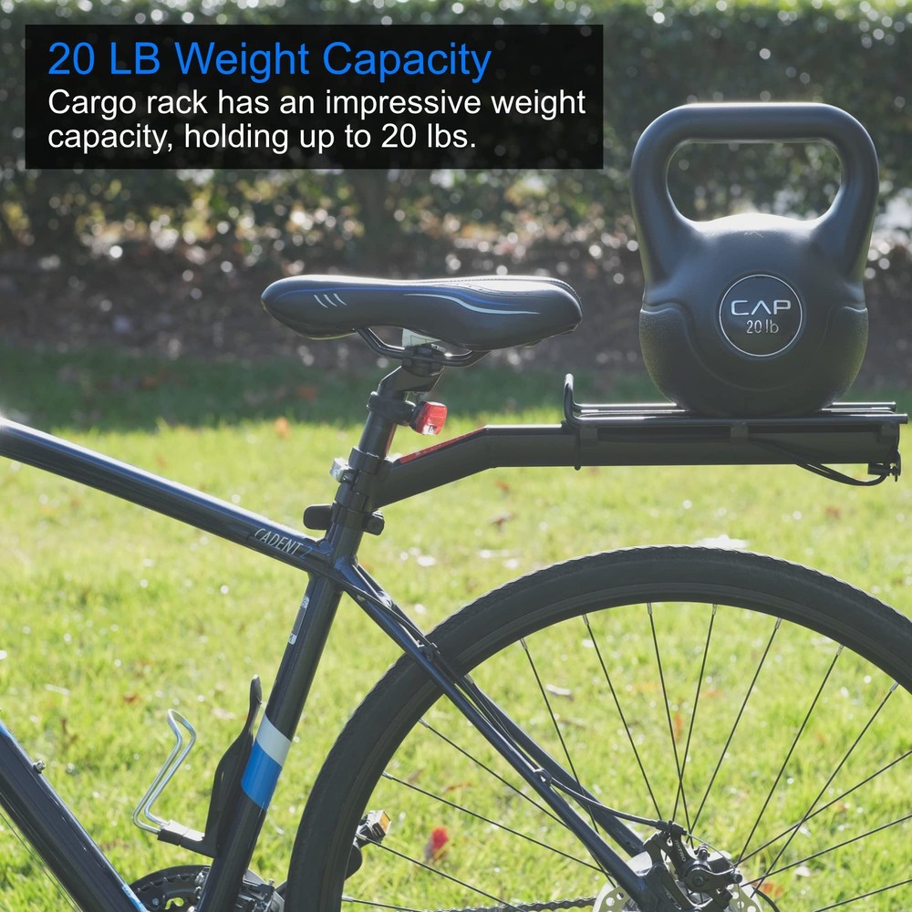 High Angle - Provides extra clearance above bicycle tires, great for larger tires or bike frames that require additional clearance Easy Installation - Fits seat post diameter of 0.90 - 1.10 inch (23mm - 28mm). Adjustable quick release clamp Durable - Strong yet lightweight Anodized Aluminum with a protective powder-coated finish Capacity - Carries up to 20 lbs. Elastic cord helps to hold your gear Includes - 1x Bicycle Rack, 1x Elastic Cord, 4x Rubber Shims / Spacers