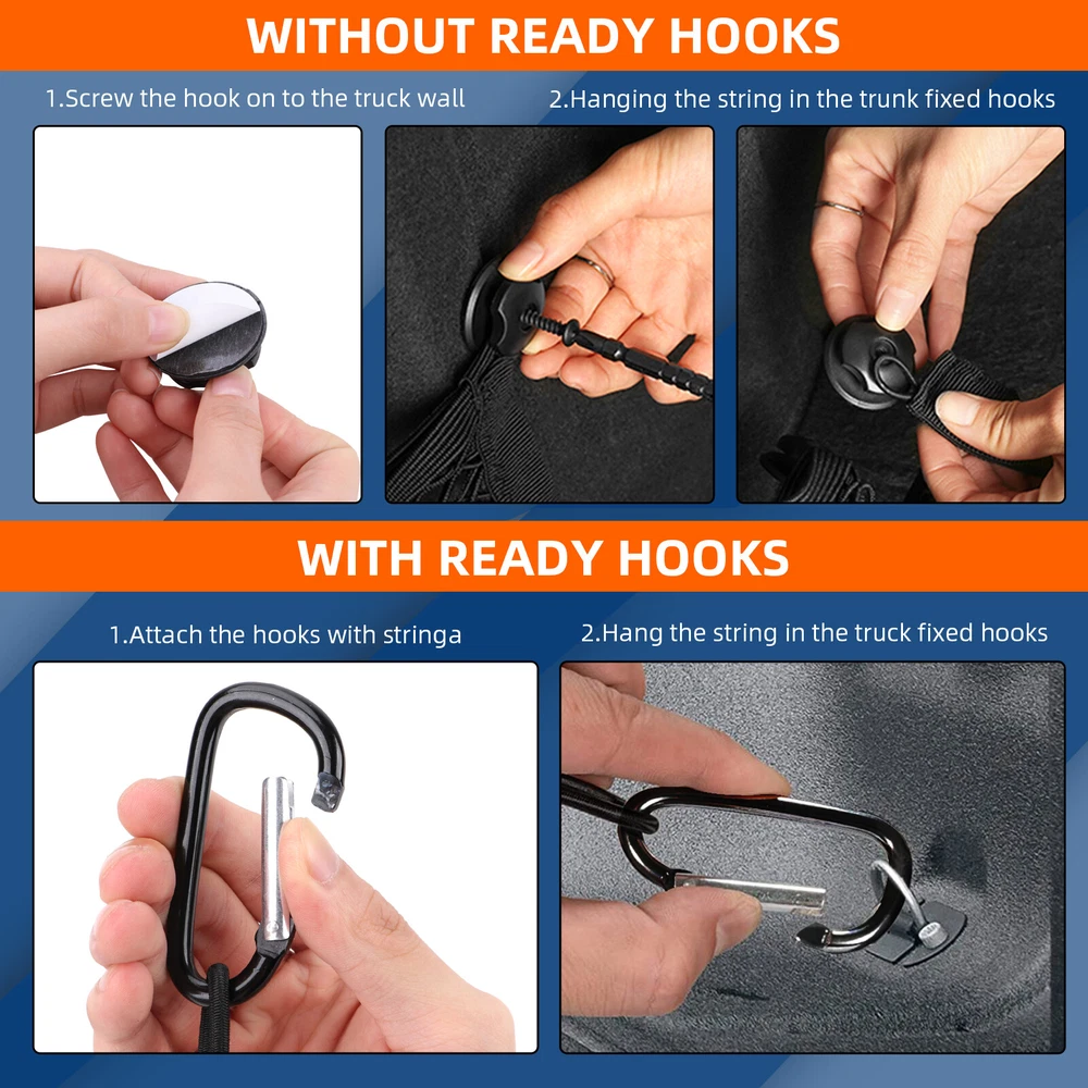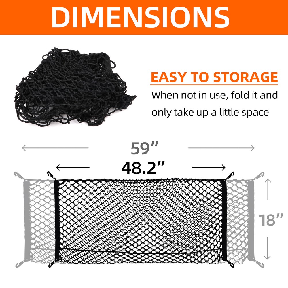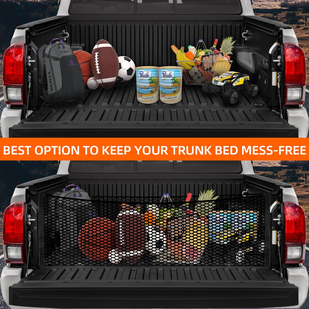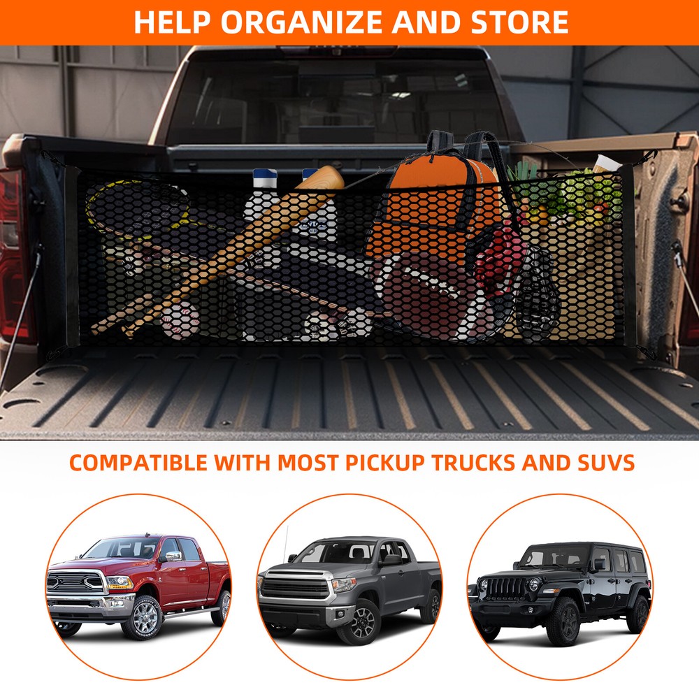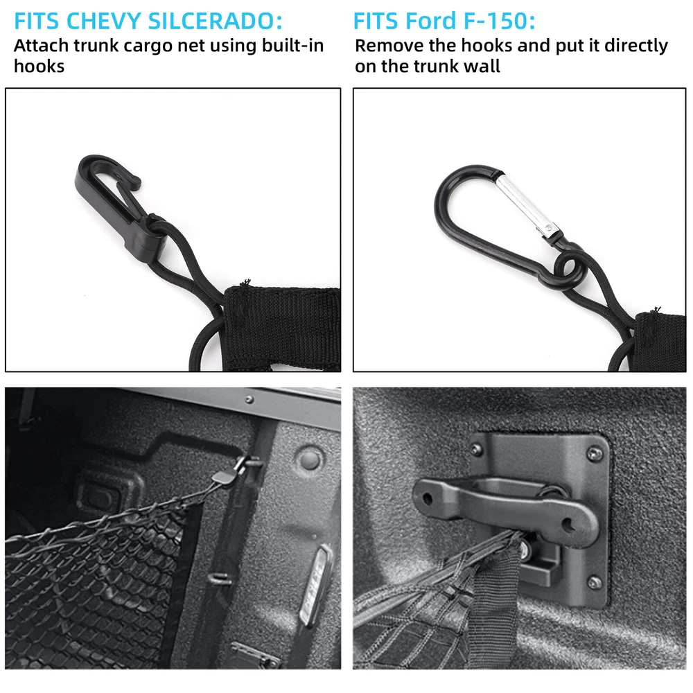 Package Include 1* Cargo Net 4* Plastic Hooks 4* Metal Carabiner Buckles Great Storage Solution for Your Pickup KARCOCA Cargo Net is specially designed for the trunk of the pickup. Compared with other brands, there is no need to spend hours setting up a cargo net on the trunk bed. The hook is easy to use-in a few seconds, you can easily tie the net or take it off when needed. Note: We are equipped with 4 metal carabiners additionally, so that no matter what kind of pickup truck you have, we all meet your needs. Expandable & Secure The truck net stretches around your stuff that holds items upright and in place so they’re not sliding all over the cargo area. Setting the Nets in Different Place You can set the nets in different place easily that has multiple storage options. Designed For The Trunk Of The Pickup Trunk Mesh Cargo Net for most pickup trunk, such as Chevrolet Silverado , FT150, GMC.