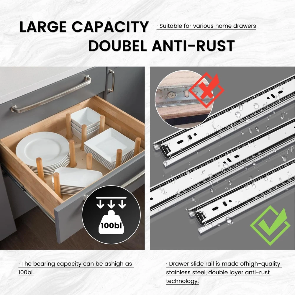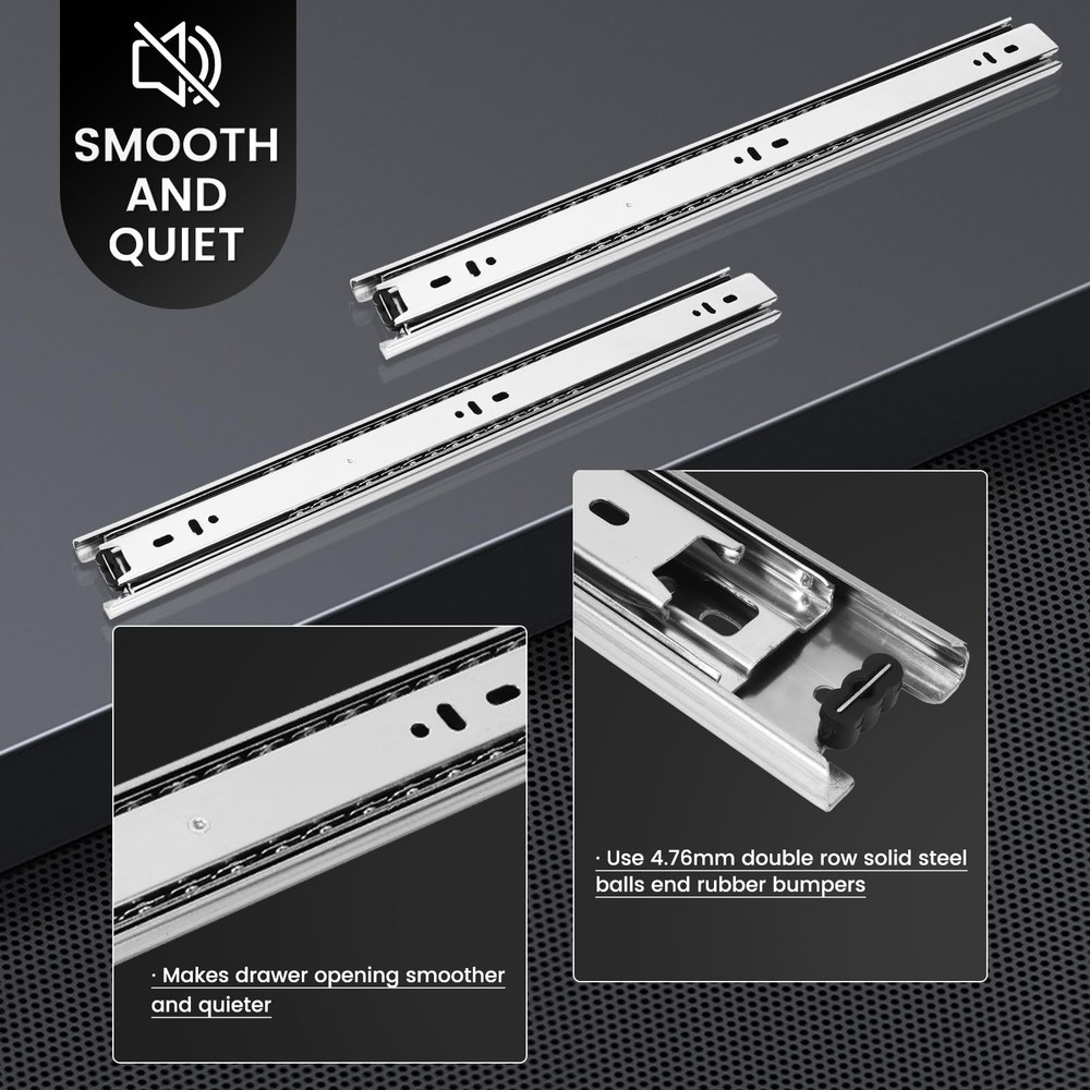 Full Extension Drawer Glides, 10-22 Inch, 100lb Load Capacity, Side Mount Ball Bearing Undermount Slides (10'', 1 Pair) Description and features 【Installation Precautions】— ①There is an installation instruction for reference;②Ensure the size of selected slides ≤ the depth of drawer;③Reserve 1/2 inch of clearance for mounting on both sides;④The two glides must be mounted in parallel,or will damage the glides;⑤Mounting screws are INCLUDED. 【100lb Load Capacity & 30 Years Service Life】— The Drawer slides made of Cold rolled Q235 steel. The max load capacity is up to 100lb. After professional institutions testing,the open-close times reached 100000 times. These drawer slides are designed for smooth and silent operation with a full-extension ball bearing design. 【Double Anti-Rust & Detachable】—Zinc Plating finish for anti-rust which is twice the traditional ordinary glides.Snap-on design makes the slides separate Easily, convenient to remove and install the glides. 【Full Extension & Ball Bearing Design】— The drawer slides also feature a 3-fold full extension design, enabling them to fully open for easy access. You won't need to reach under the lip of your cabinet to access anything in the drawer, making this product perfect for those who need versatility in their furniture. Ball bearing design ensure drawer slides smoothly and silently. 【Pre-sales and After-sales Service】— If any question about product before purchase,please us at *Ask a question*,and we also provide you with satisfactory after-sales service.We will reply you as soon as possible Qualif Drawer Slides 10 12 14 16 18 20 22 Inch, Full Extension Drawer Glides 100lb Load Capacity, Side Mount Ball Bearing Drawer Runners Rails Cabinet Drawer Slides Kitchen RV Furniture Hardware Return Policy ⦿ All our products come with a 30-Day Return Policy. If you would like to return your item and you are within 30 days of the purchase, and it is still in its original condition, you can return the item by contacting us through eBay messaging. ⦿ If you are not 100% satisfied, please let us know the Detailed Problem,We will give you a 100% satisfactory solution ⦿ If you received an incorrect, damaged, defective, or item not as described, contact us for a partial/full refund or replacement on our cost. ⦿ Free Shipping and Free Return 30-Days Money Back Guarantee. ☎ For all returned products, buyers MUST contact us for the returning address. Shipping ⦿ We do not ship to a different address. we will ship to the address you provide on the ebay only. Please check your address before purchase. ⦿ It should take 2-4 business days for the product to reach your destination. ⦿ If the product doesn't reach your destination within the time limit, please give it an additional 1-2 business days in case of postal delays and/or possible technical issues. ⦿ We use a selection of shipping services such as UPS, FedEx, USPS etc. ⦿ We ship only to the 48 contiguous states of America. We do not ship to Hawaii, Alaska, US Protectorates, APO/FPO addresses. Local pickups are not offered. ☎ If it takes any longer than that, please do not hesitate to contact us to resolve the issues. Contact us ☎ Please contact us via eBay message. And your message will be replied within 1 business days. For any queries, please feel free to contact us, we will get back to you as quickly as possible. Customer 100% satisfaction is our first priority and goal. We are always working hard for maintain high standards of excellence and resolve your problem in best way. So your POSITIVE FEEDBACK is very important. If you have any problem of the item, please feel free to let us know before leaving your feedback. We will try our best to solve your problem. About us We are here to give you quality products, competitive pricing and amazing service in order to make sure you get the best deal online, Thank you for your business and the opportunity to serve you.