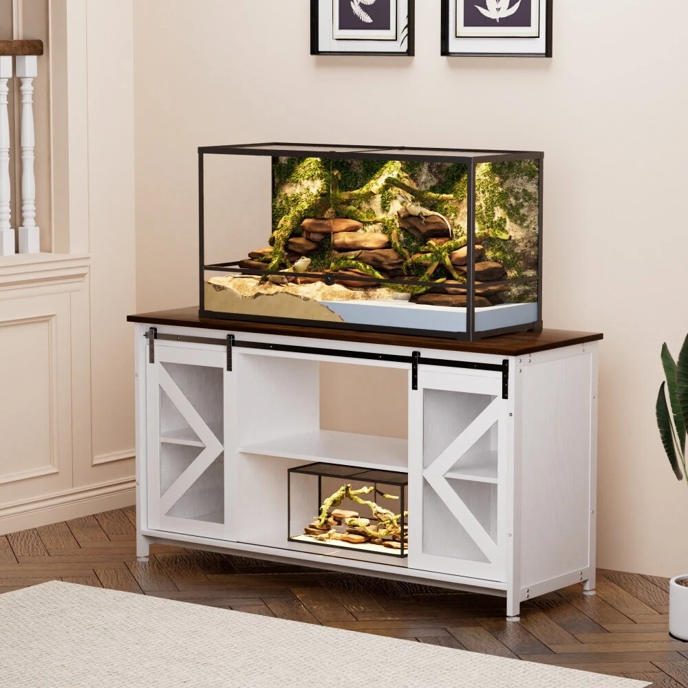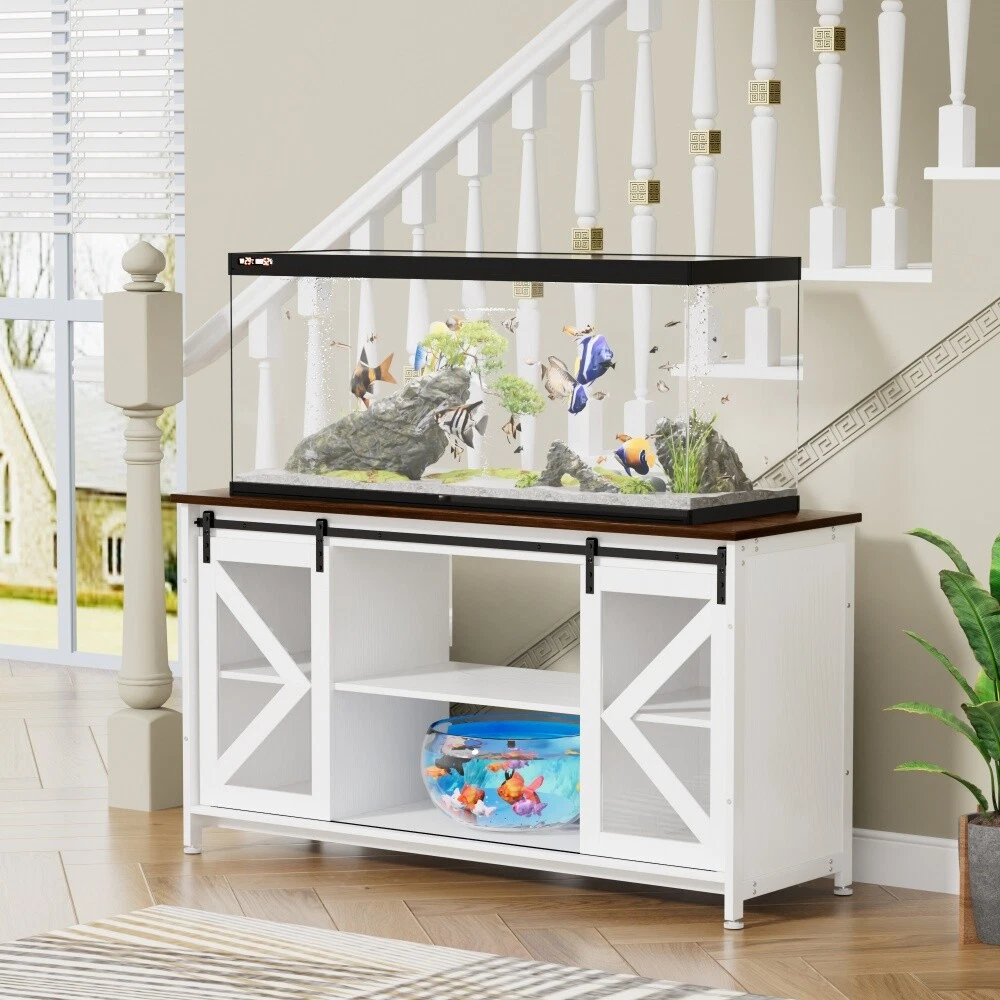 Sturdy and stable aquarium stand, in addition to the thickened iron frame, there is a 1.57'' thick iron pipe under the table for support, which makes the carrying capacity of this aquarium stand exceed other similar products. Holds Two Aquariums: Able to hold one big aquarium on the top shelf up to 40 gallons and bottom shelf can accommodate a second small aquarium (5-10gallon). In addition to main tank storage, this aquarium rack can store fish accessories: fish food, fishing nets, gravel cleaner, and more, keeping these items organized. The back of the cabinet is an iron net, which is well ventilated and breathable, and will not cause unpleasant smells inside the closed cabinet. Dimensions: Stand Dimensions: 28.9" W x 19.7" D x 32.6'' H, Stand Holding Capacity: 40 Gallons,1000 LBS. Suitable for a variety of sizes of aquariums or terrariums up to 80 Gallon. Excluding the a quarium. Product Information Product Type Fish Tank Cabinet Color White Material Particleboard, MDF, Steel Product Dimensions 58.9'' W x 19.7'' D x 32.6'' H Max. Static Load Capacity tabletop 1000 LBS (uniform distribution) Max. Static Load Capacity middle shelf 100 LBS (uniform distribution) Max. Static Load Capacity bottom 1000LBS (uniform distribution) Assembly Required About 40 min Number of packages 1 Package Contents 1 Fish Tank Cabinet, 1 x Assembly Kit, 1 x Instructions