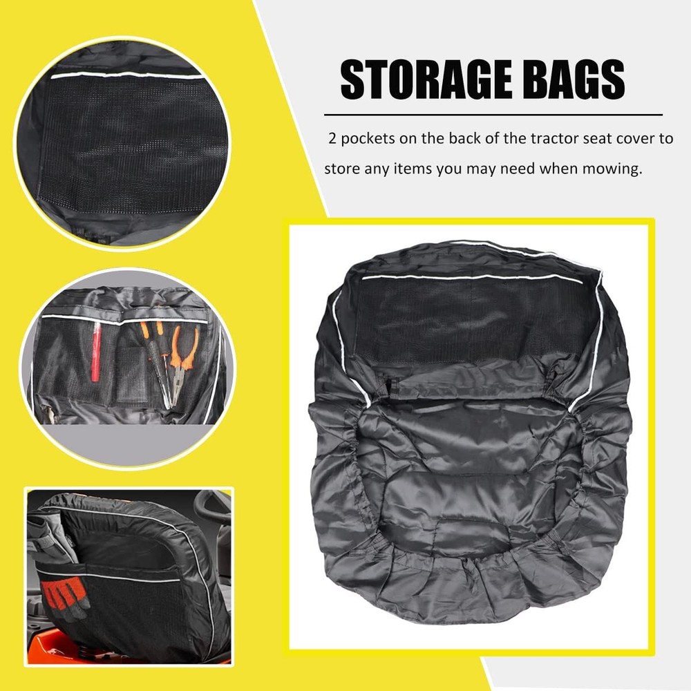 Riding Lawn Mower Seat Cover with Craftsman,Cub Cadet,Kubota,Universal Lawn Mower Tractor Cover(Medium) 【 UNIVERSAL LAWN MOWER TRACTOR COVER】Lawn Mower Seat Cover fits 12.5-14" seat back height. with Husqvarna,Craftsman,Cub cadet,and Kubota Tractor. 【IMPORTANT NOTE】:There's a reinforced slit in the center of the seat to allow water to drain through, evaporate out.(for tractor seats that have a drain hole).if you don't need the drain hole, just stitching it. 【 HIGH QUALITY】 Our tractor seat cover is made of thick and durable 600D Oxford fabric.not easy to crack, waterproof, abrasion resistant, and scratch resistant. 【 SPECIAL DESIGN】Our riding lawn mower seat cover designed with 2 pockets on the back of the seat cover for any items you may need while mowing like gloves, tools, rags, pruners,trash bag and such.Elastic cord in bottom. 【EASY TO INSTALL】:Put them over the back of the seat first. At the bottom has elastic hem encircles the seat,adjust the elastic and ease it around the corners of the seat.Once on they stay firmly in place.