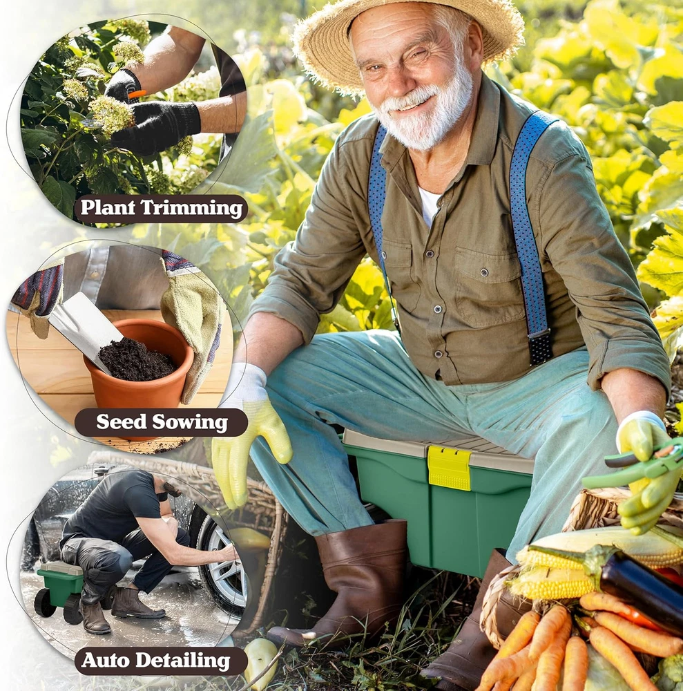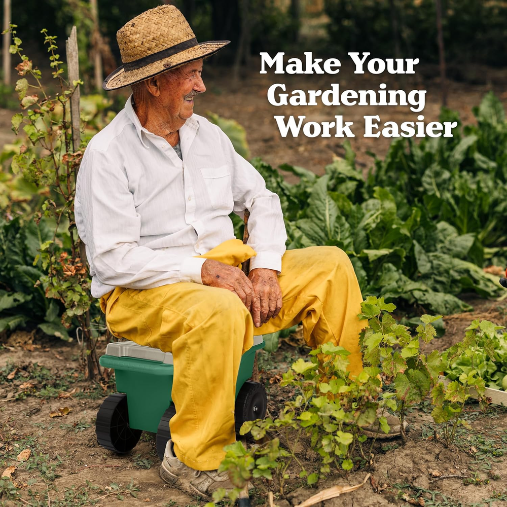 ROLLING GARDEN CART WITH SEAT - This garden stool is ideal for anyone eager to ease back and knee pain when planting and weeding, as its lid offers a sturdy seat that makes low-to-the-ground tasks much easier, with less need for crouching and stooping. OUTDOOR GARDENING CARTS - The sturdy 6-inch wheels and built-in handles on each side of this rolling tool cart allow you to navigate it through tall grass, over rocks, and around the yard, and its easy maneuverability is great for both kids and adults. DURABLE WEEDING STOOL - Featuring a durable plastic construction, this wagon wheel bench has a weight capacity of up to 220lbs that makes it ideal for gardening and other indoor and outdoor tasks at home, like painting, cleaning, and even car repair. SPACIOUS STORAGE - The spacious interior and removable tool tray in this garden scooter are perfect for keeping all your tools and supplies in one convenient place, allowing easy storage of gloves, planting shovels, gardening shears, and more. PRODUCT DETAILS - Materials: Polypropylene. Dimensions: (L) 21.5" x (W) 10" x (H) 11.5"; Tool Tray: (L) 14" x (W) 8.75" x (H) 1.5"; Storage Area: (L) 15.5" x (W) 8" x (H) 7.5". Weight Capacity: 220lbs. Colors: Dark Green, Black, and Gray. Keep all your gardening tools right where you need them with the Garden Cart with Seat and Wheels by Pure Garden. The spacious interior and removable tool tray are ideal for keeping all your garden supplies in one convenient place. The lid is a sturdy bench seat that alleviates the need for bending or stooping, making low to the ground tasks much easier. The built-in handles make it easy to transport plants, flowers, mulch, tools and more. With four 6-inch-diameter plastic wheels that can navigate through tall grass, over rocks, and around the yard, this garden scooter is ideal for both kids and adults with green thumbs. IMPORTANT: Pure Garden is committed to providing the consumer with the absolute best price and value on all of our products. NOTE: This is an exclusive product of Pure Garden and ONLY Garden Carts and Wagons by Pure Garden are GUARANTEED to be genuine. Avoid buying counterfeit products and transacting with unauthorized sellers. Pure Garden is a registered trademark protected by U.S. Trademark law and will be vigorously defended.