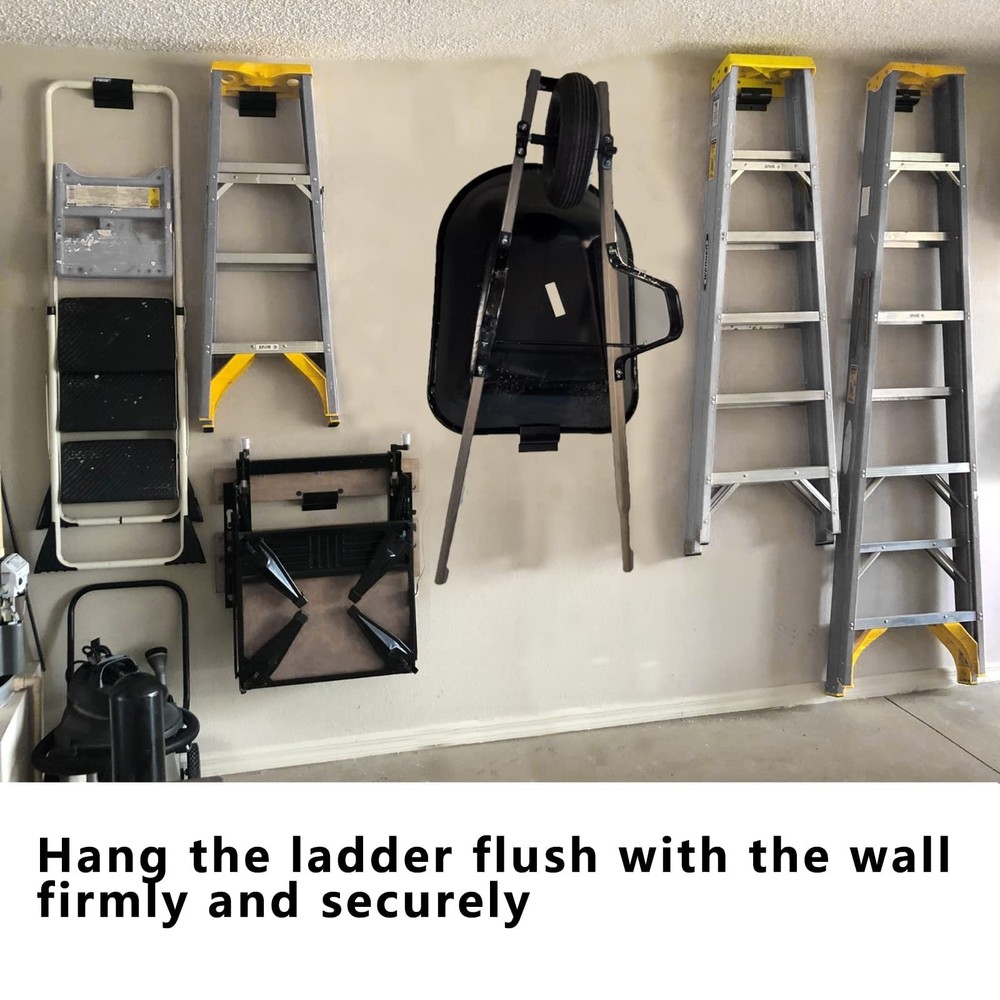You must be looking for a reliable ladder storage hooks for your ladders, wheelbarrows and other unwieldy home appliances. Then this hanger/hook is your best choice: To keep your floor tidy and organized; To reclaim valuable floor and shelf space; To solve the storage with a minimum of wall space; To hanger the ladder, wheelbarrows and other obstacles firmly on the wall; To lift and lower items easily; No fear of falling over or young kids pulling it down; Specifications: Material: High strength steel Quantity: 4 Pcs Color: Black Size: 5 * 1.7 * 4 inches Package include: Garage wall hook x 4 Pcs Stainless steel screw x 8 Pcs Wall anchor x 8 Pcs Note: Please allow slight size error due to manual measurement; Do not hang things over 50lbs Do not recommended for items over 20 lbs if drywall mounted Well-built and Sturdy Wheelbarrow hanger: Made of heavy-duty and powder-coated steel. Water-proof and rust-proof. To solve the storage with a minimum of wall space Easy to Bulky Items: This ladder holder is not just qualified for hanging ladders and wheelbarrows, but also useful for other furniture and home equipment Multipurpose Ladder Hook: Mount it in your garage or garden fence or any other wall as you wish. To get the messy items off the floor and still be able to lift and lower them easily Easy to Use: This ladder hooks for garage wall comes with two fixing screws for easy installation. It fits most wall surfaces and provides weight capacity up to 50 lbs if wall stud mounted Buy With Confidence: Two supporting points design ensures firmly hanging without fear of falling over. And we stand behind our garage ladder hooks and every single order is excellent guaranteed