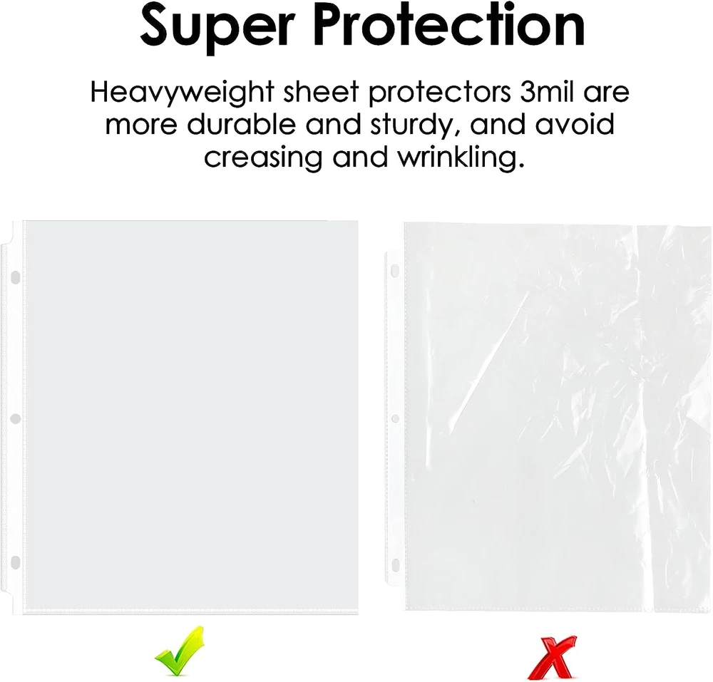 Heavyweight 3 Mil and Durable: Each sheet protector can hold 8.5 x 11 inches( letter size) sheet of paper, 3mil thickness, more durable than ordinary paper protectors. Top Loading: Easy top loading feature on clear sheet protectors provides a wider top opening, so paper is easy to slide in and take out. Transparent: Reinforced holes on the plastic sheets for three-ring binder, clear design offers complete transparency for easy viewing. Excellent Material: Made of high quality polypropylene, it is the excellent plastic paper sleeves for binders. Wide Application: Paper protector is ideal for keeping recipes, photos, important documents, certificates. Page protector keeps them from the wear and tear. Product Description KTRIO Clear Sheet Protector Series Add to Cart Add to Cart Add to Cart Add to Cart Add to Cart Add to Cart Add to Cart Customer Reviews 4.7 out of 5 stars 1,143 4.7 out of 5 stars 31,773 4.6 out of 5 stars 2,171 4.7 out of 5 stars 4,067 4.6 out of 5 stars 957 4.6 out of 5 stars 1,053 4.7 out of 5 stars 622 Price $5.99 $ 5 . 99 $5.99 $ 5 . 99 $5.64 $ 5 . 64 $12.88 $ 12 . 88 $25.99 $ 25 . 99 $5.49 $ 5 . 49 $6.99 $ 6 . 99 Features Storage photos, documents Storage photos, documents Non-glare, storage paper Storage photos, documents Storage photos, documents Classify documents Storage playbill, paper Color Clear Clear Clear Clear Clear Clear pocket & Colored tabs Clear Size 8.5 x 11 inch 8.5 x 11 inch 8.5 x 11 inch 8.5 x 11 inch 8.5 x 11 inch 8.5 x 11 inch 5.5 x 8.5 inch Material Durable PP Material Durable PP Material Durable PP Material Durable PP Material Durable PP Material Durable PP Material Durable PP Material Package 30 Pack 50 Pack 50 Pack 200 Pack 500 Pack 2 Sets 60 Pack