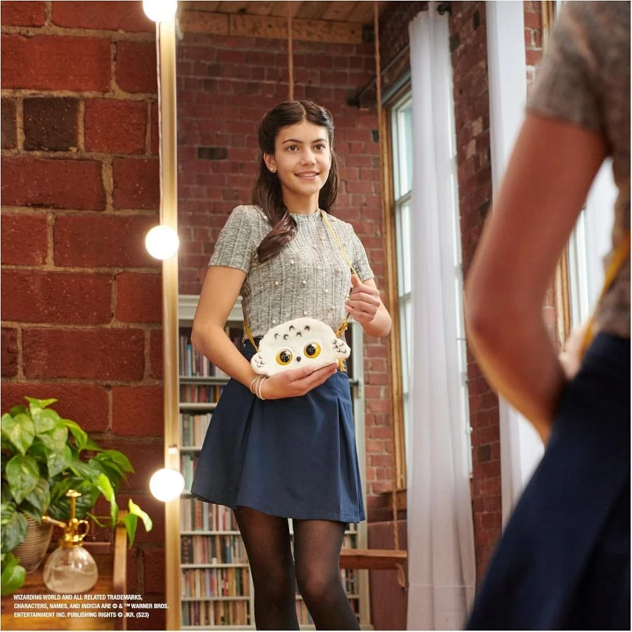 BLINKS & RESPONDS TO : This Hedwig girls purse has enchanted blinking eyes, bringing the iconic Harry Potter owl to life She blinks and interacts with you on the go. Hold her forehead for coos and hoots OVER 30 SOUNDS & REACTIONS: Hedwig’s head to feed her – she lets you know how she likes the food She makes magical owl and wing flapping noises, plays music and more 3 AAA batteries not included CARRIES LETTER: Hedwig’s spring-loaded beak holds a letter Plus, clip the gold Harry Potter charm to the strap and place Magical Minis (toys sold separately) inside for spellbinding pretend play anywhere you go HARRY POTTER GIFTS AND TOYS FOR 6 YEAR OLD GIRLS AND BOYS: Discover the Wizarding World with Harry Potter toys & games, dolls & accessories, wands, toy figures & playsets These toys for kids are the perfect gifts On Dec 23, 2024 at 18:12:45 PST, seller added the following information: