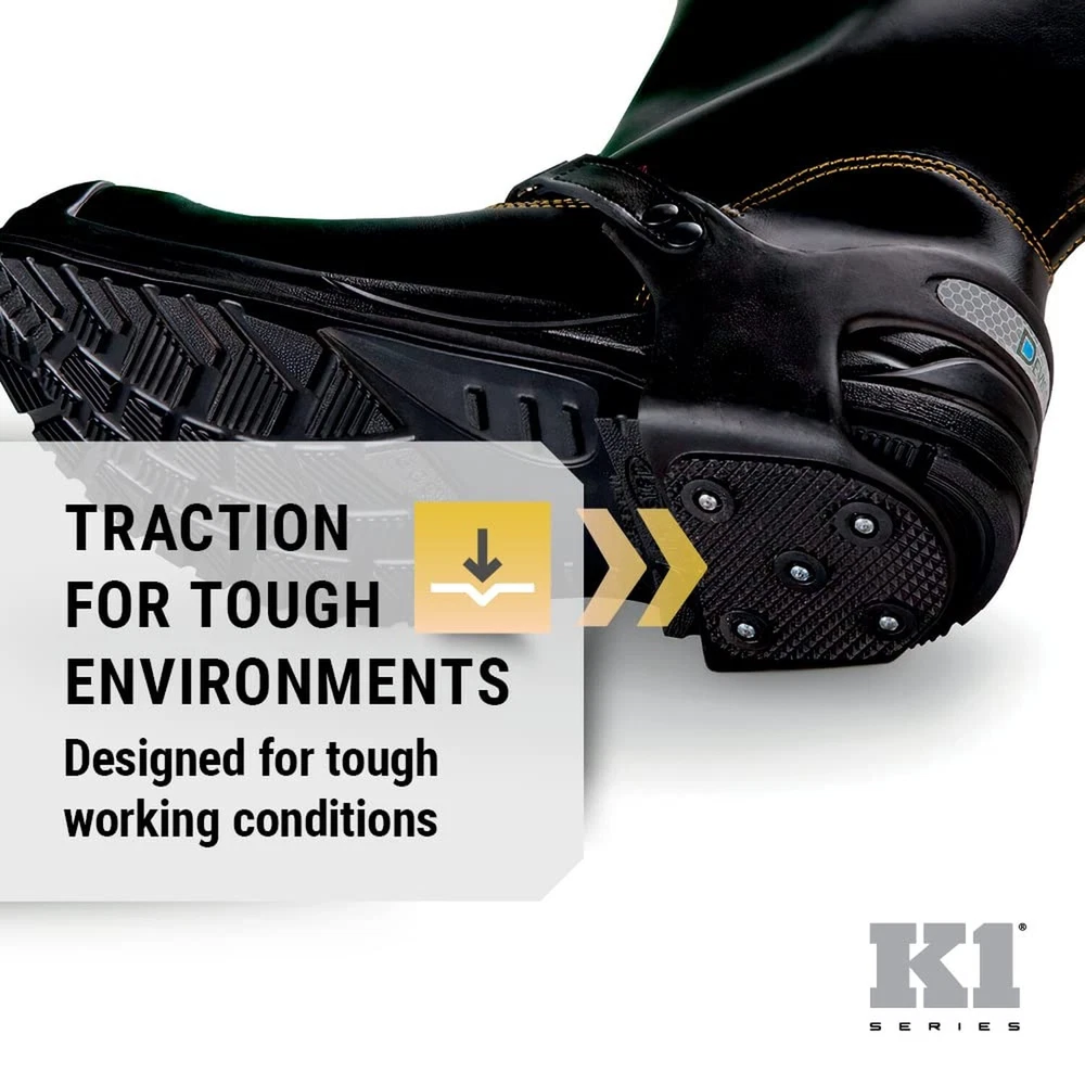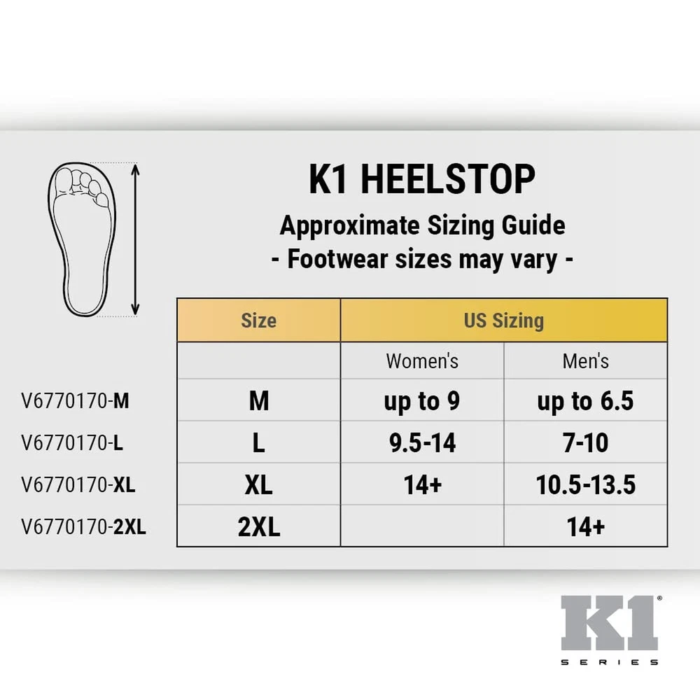 Heel Footwear Traction Aids, Tungsten Ice Cleat Spikes, Adjustable Strap, Unisex, 2XL, V6770170-2XL Product Details Size: XX-Large Brand: K1 Series MPN: V6770170-2XL UPC: Does not apply EAN: Does not apply Size: XX-Large Sport: Climbing Brand: K1 Series Material: Rubber Color: Black Is Discontinued By Manufacturer : No Product Dimensions : 7.8 x 7.2 x 4.8 inches; 1 Pounds Item model number : V6770170-2XL Department : unisex Date First Available : March 24, 2022 Manufacturer : Surewerx Country of Origin : China Best Sellers Rank: #1,632,345 in Clothing, Shoes & Jewelry (See Top 100 in Clothing, Shoes & Jewelry) #525 in Shoe Ice & Snow Grips #525 in Shoe Ice & Snow Grips ANTI-SLIP ICE CLEATS - K1 Heelstop ice cleats provide a winter traction solution for men and women in tough winter conditions. Entire heel is covered for max resistance on ice and snow MAX SLIP RESISTANCE - 10 stainless steel spikes penetrate ice and snow for high traction. Unique design allows driving and climbing without interference DURABLE - thick, durable rubber is freeze and abrasion resistant that stays flexible in extreme cold, stainless steel spikes outlast brass and copper; heavy-duty adjustable strap is built for tough work and winter conditions EASY TO USE - Transition from outdoor ice-cleats to driving; the adjustable strap design fits snugly over footwear; reflective strip on the heel is easy to see and helps in dark working conditions HI VIS - Reflective strips provide added safety when working in low lit working environments Built with the toughest materials, the K1 Series Heelstop is made with ice- penetrating tungsten carbide spikes, TR freeze-resistant rubber, and reflective hi-viz strips.